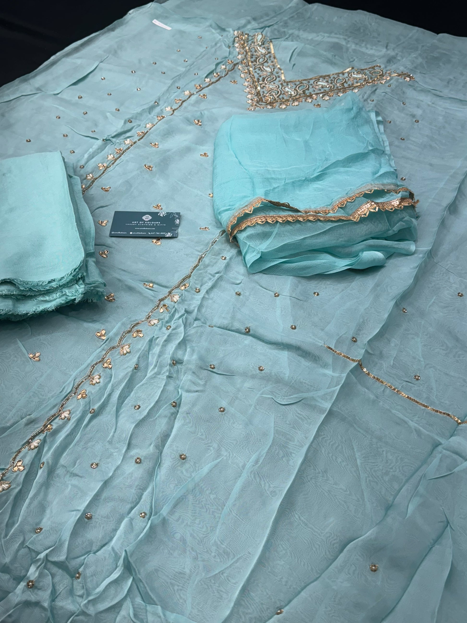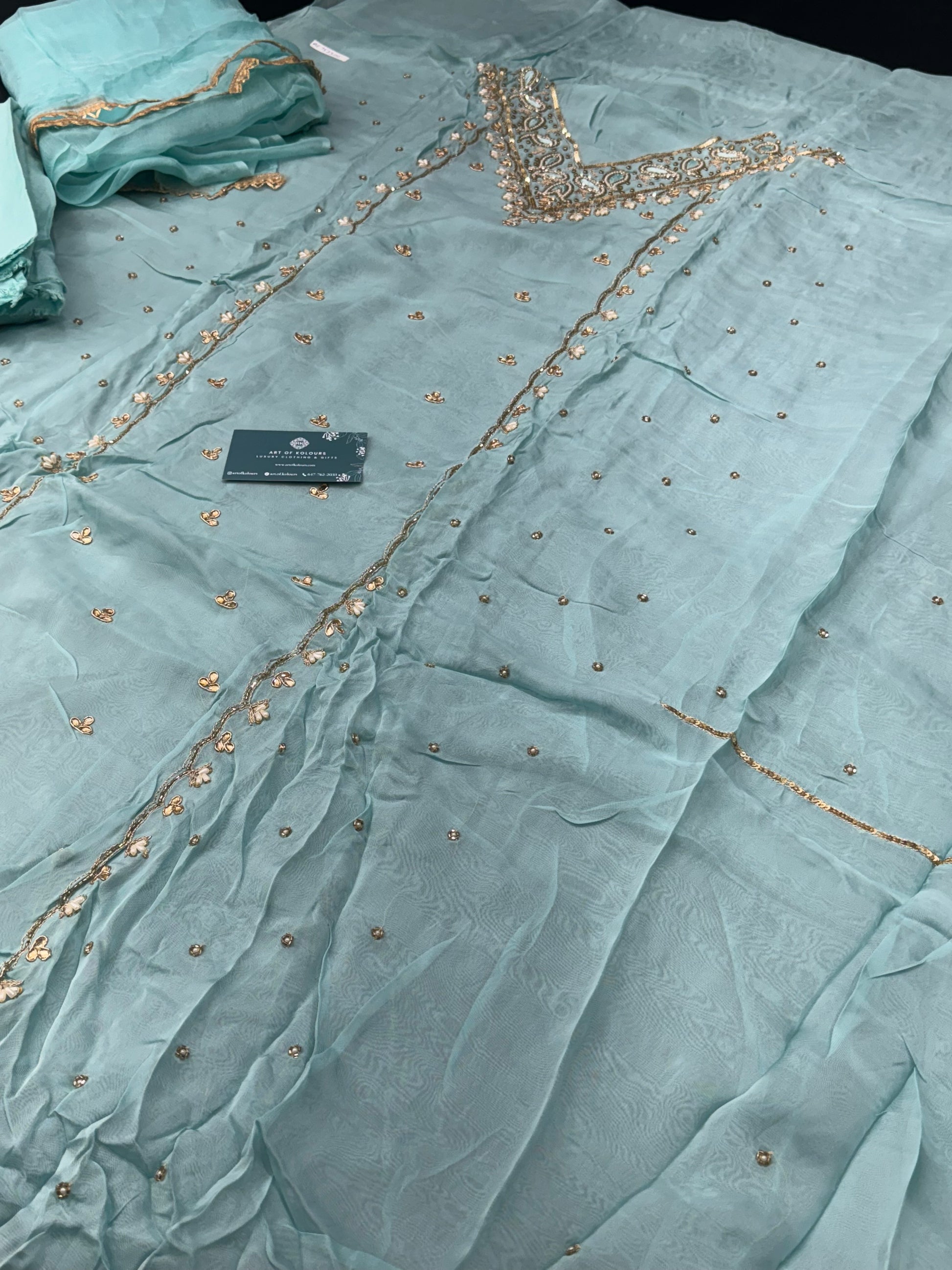Expertly crafted for elegance and style, the Aakash Vikal Unstitched Suit features a beautiful light blue color with intricate V-shaped neckline and stunning all-over work. Elevate your fashion game and turn heads with this timeless and versatile suit.
