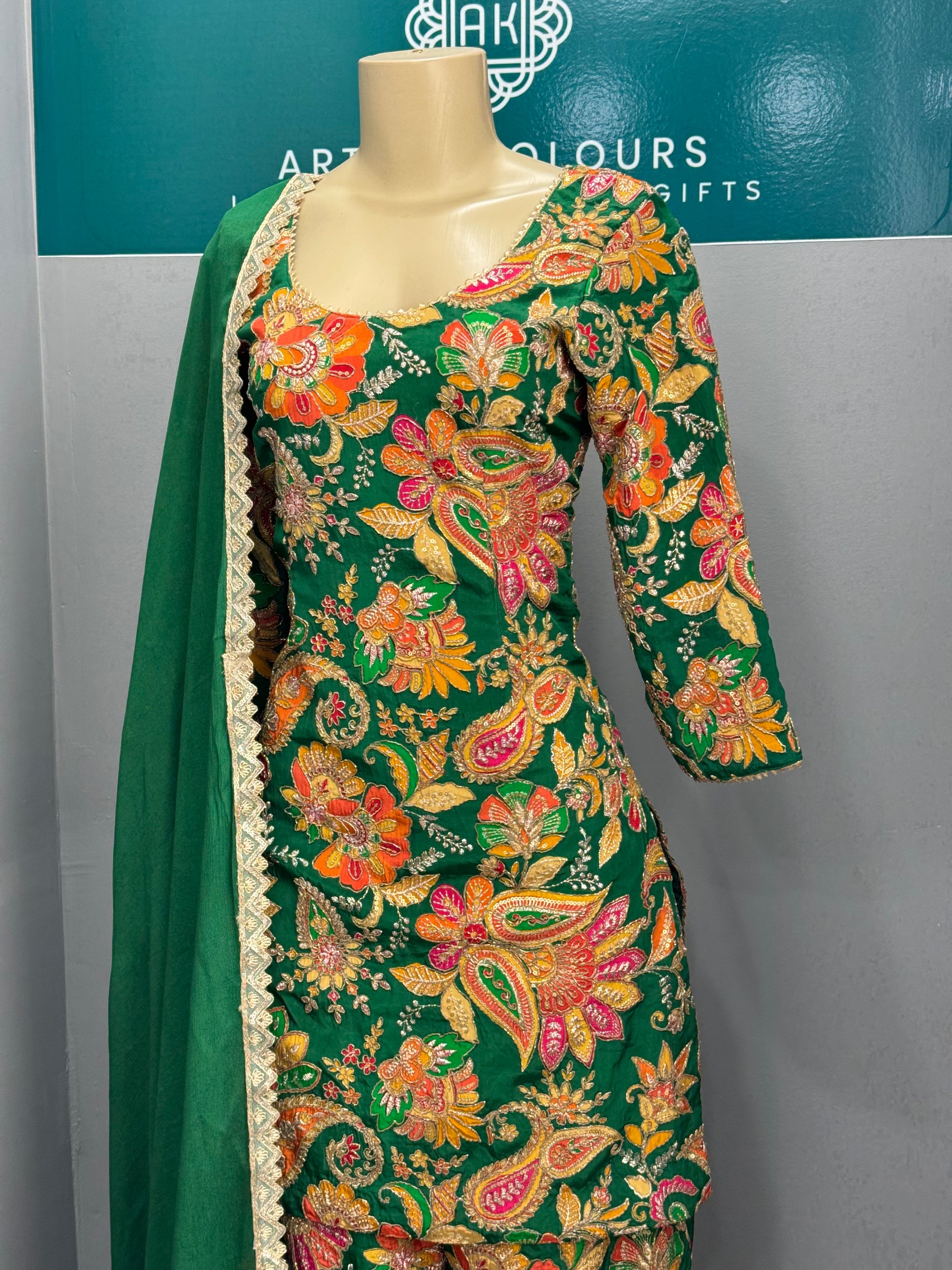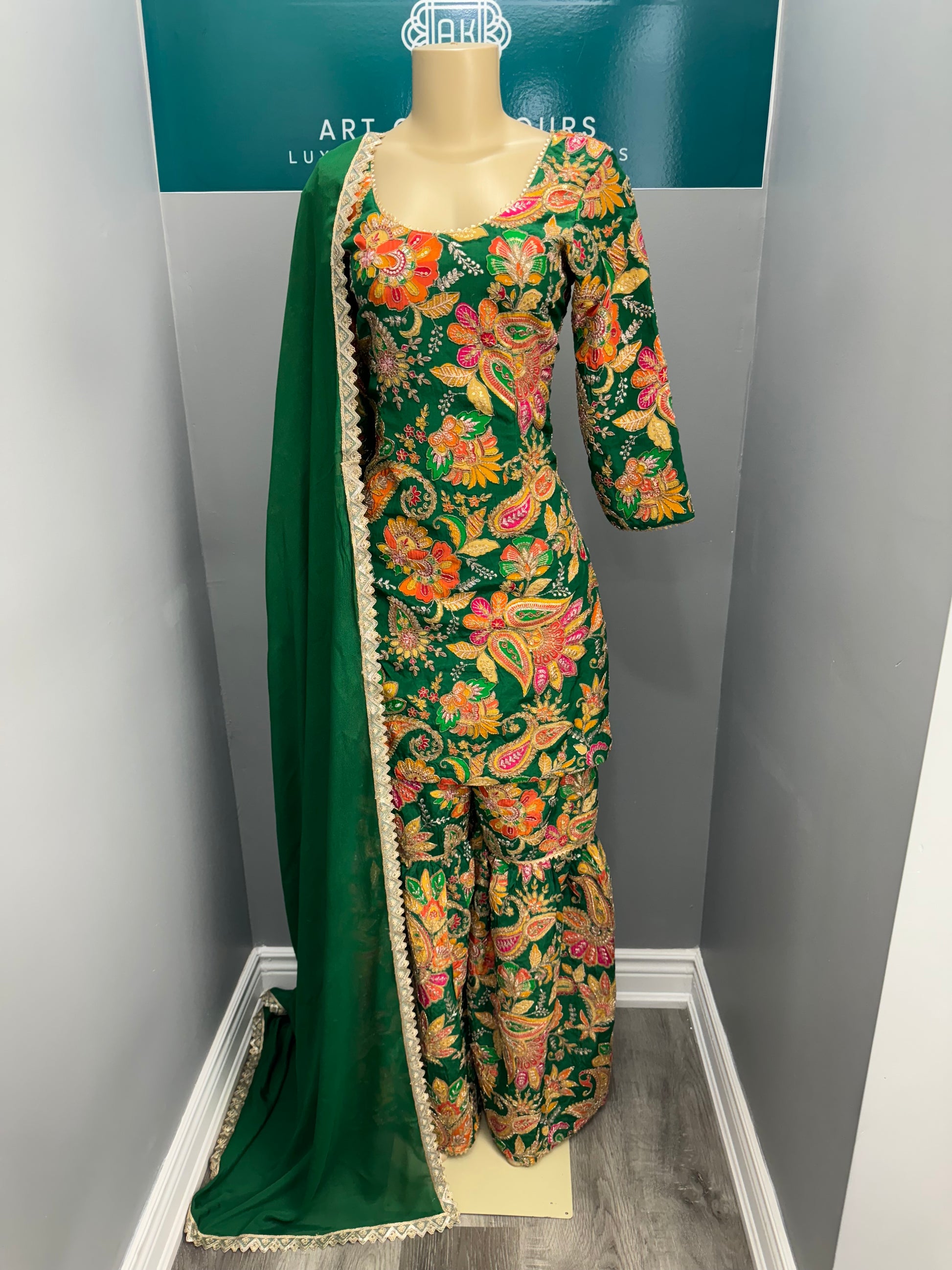 This Pure Crepe Allover Gharara Suit features a beautiful printed design with position work, paired with a pure chinon beautiful dupatta. This gharara suit is perfect for any special occasion. Elevate your style with this elegant and unique outfit.