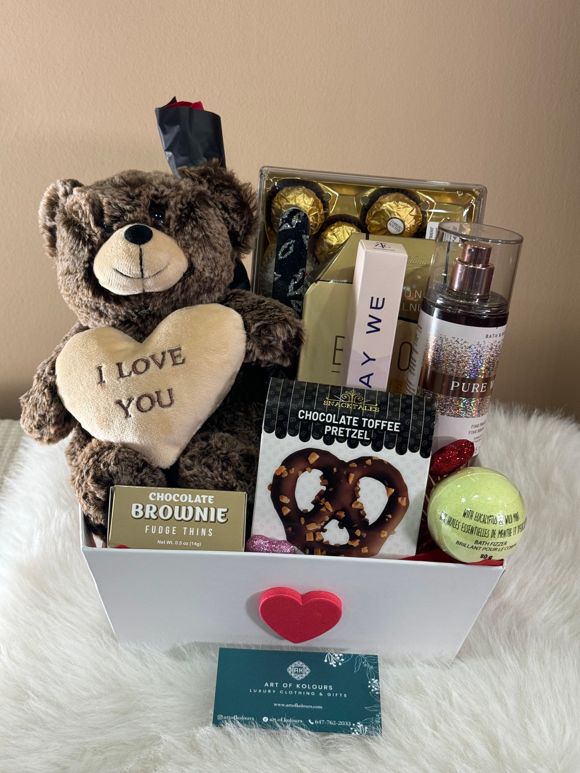 Indulge your loved one with AL one Kisses - a luxurious gift set that includes Bath and Body Works Mist, Chocolates, snacks and more! Make their day extra special with this thoughtful and elegant gift.