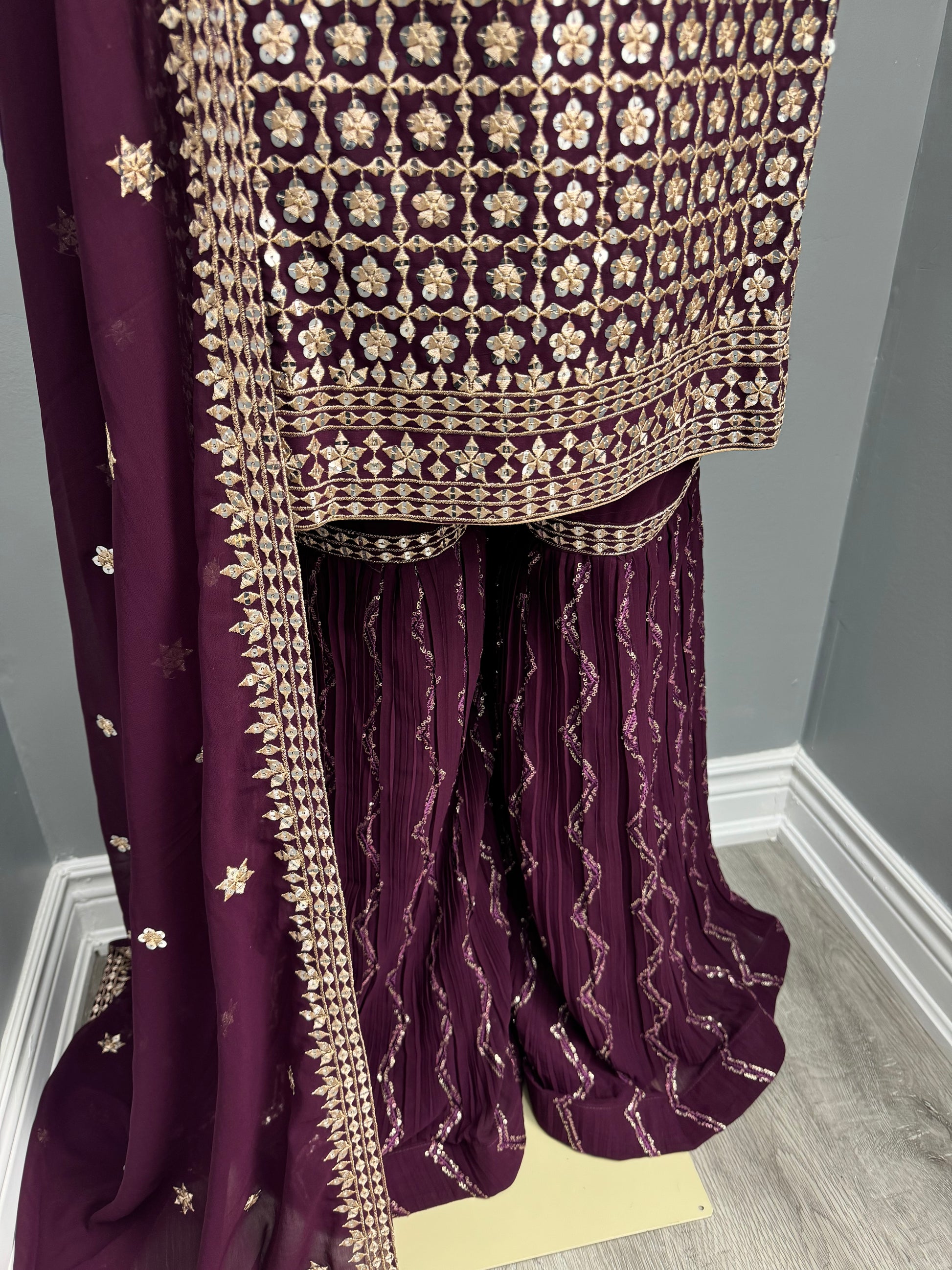 This Banafsha Gharara Suit is expertly crafted with intricate sequences and thread work, creating a truly beautiful and elegant garment. Beautiful embroidery Gharara with sequins. Made with the highest quality materials, it is both comfortable and stylish. Perfect for any occasion, this suit is sure to make you stand out in a crowd.
