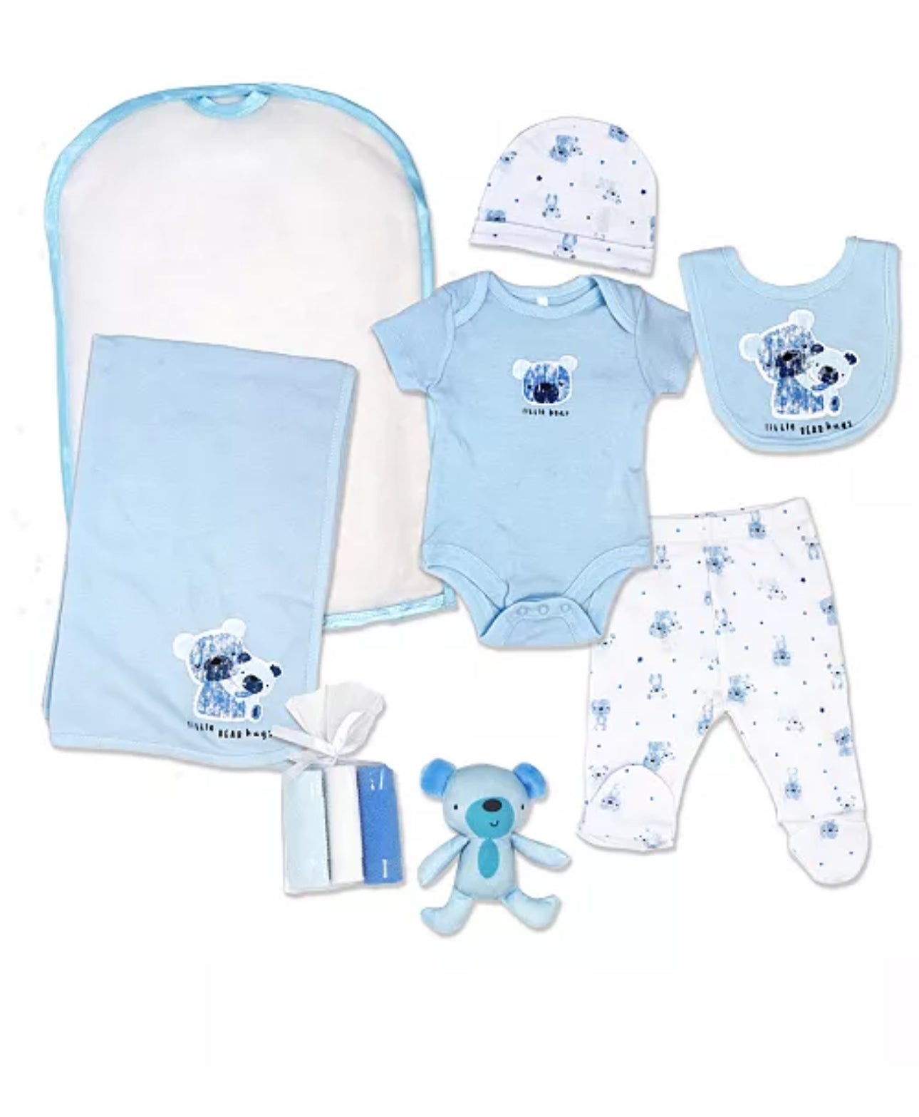 The Boys 10 Piece Mesh Bag Set: Little Bear Hugs is the perfect gift for new parents. It includes a soft bodysuit, cozy pants, a bib, beanie, 3 wash cloths, a lap blanket, and a cute bear toy, all neatly packaged in a convenient mesh bag. Keep essentials organized and easily accessible with this must-have set.