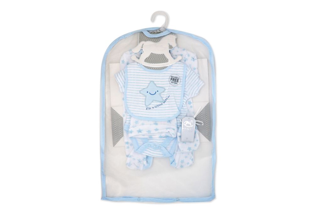 The Boys 5 Piece Mesh Bag Set includes a sleeper, bodysuit, hat, mitts, and bib, all neatly packed in an organza mesh bag with a gift bag included. Perfect for new parents, this set offers both practicality and style, making it a wonderful gift for any newborn baby boy.