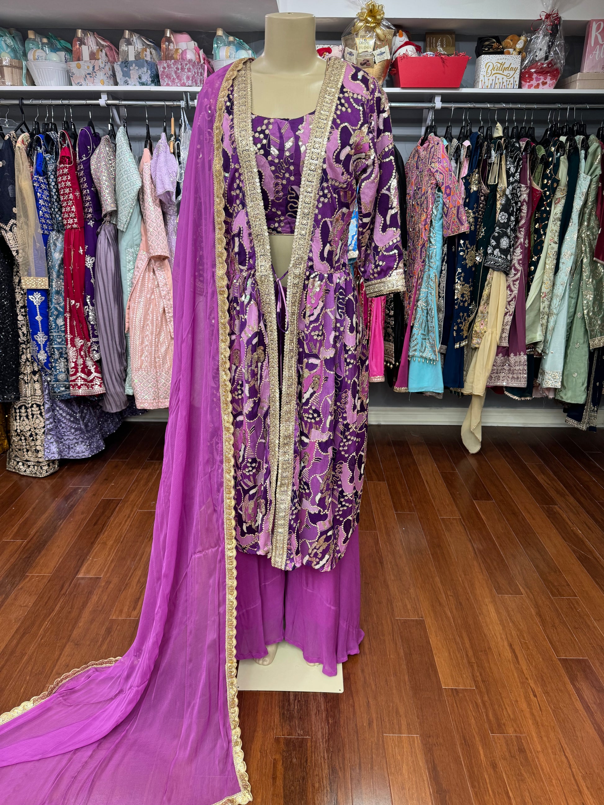 Upgrade your fashion game with our Cape Style Purple Sharara Suit. This elegant and versatile suit features a stylish cape design, perfect for making a statement at any event. The sharara pants add a touch of traditional charm, while the regal purple color exudes confidence and sophistication. Elevate your wardrobe and embrace the benefits of this unique suit.