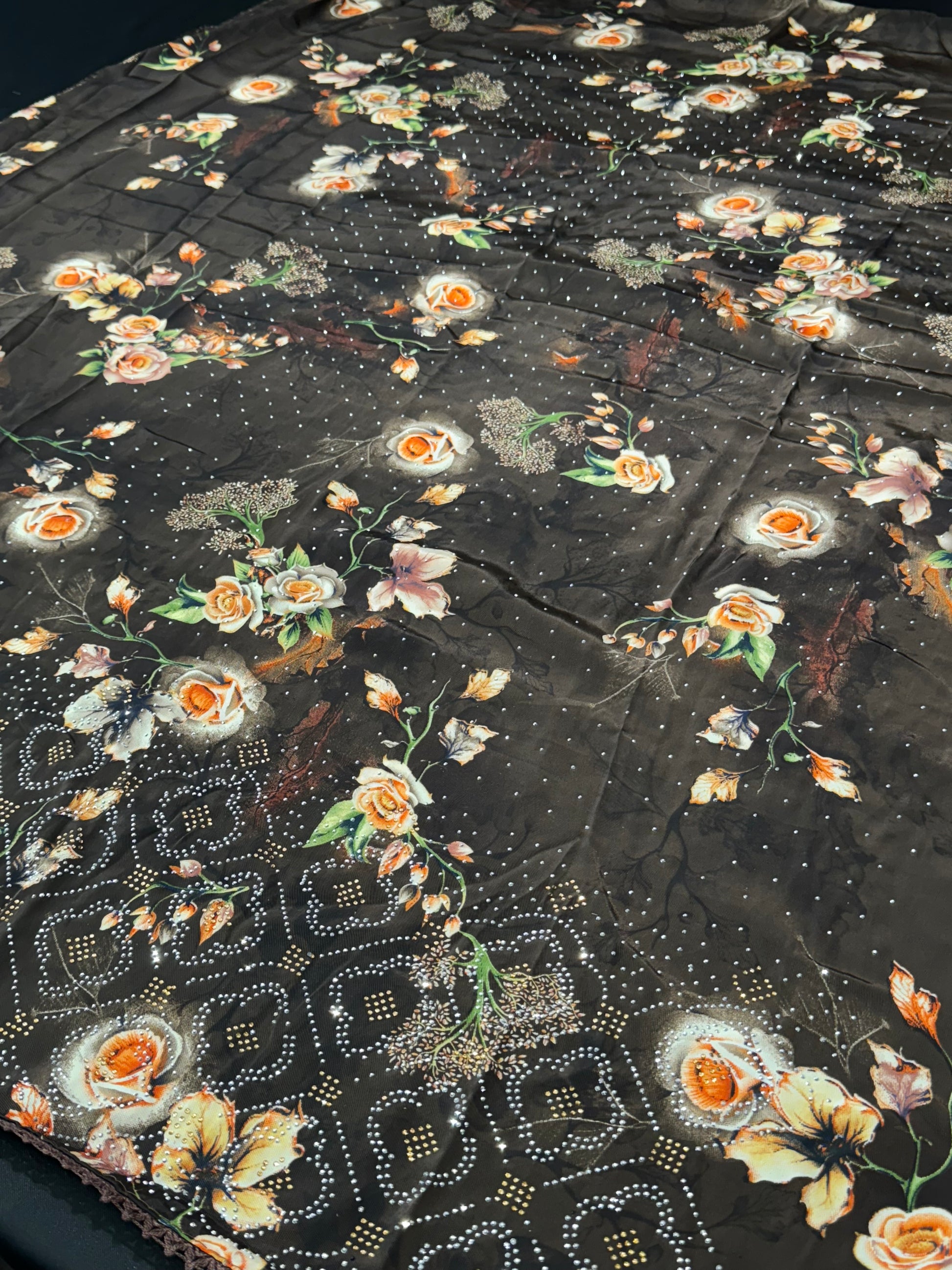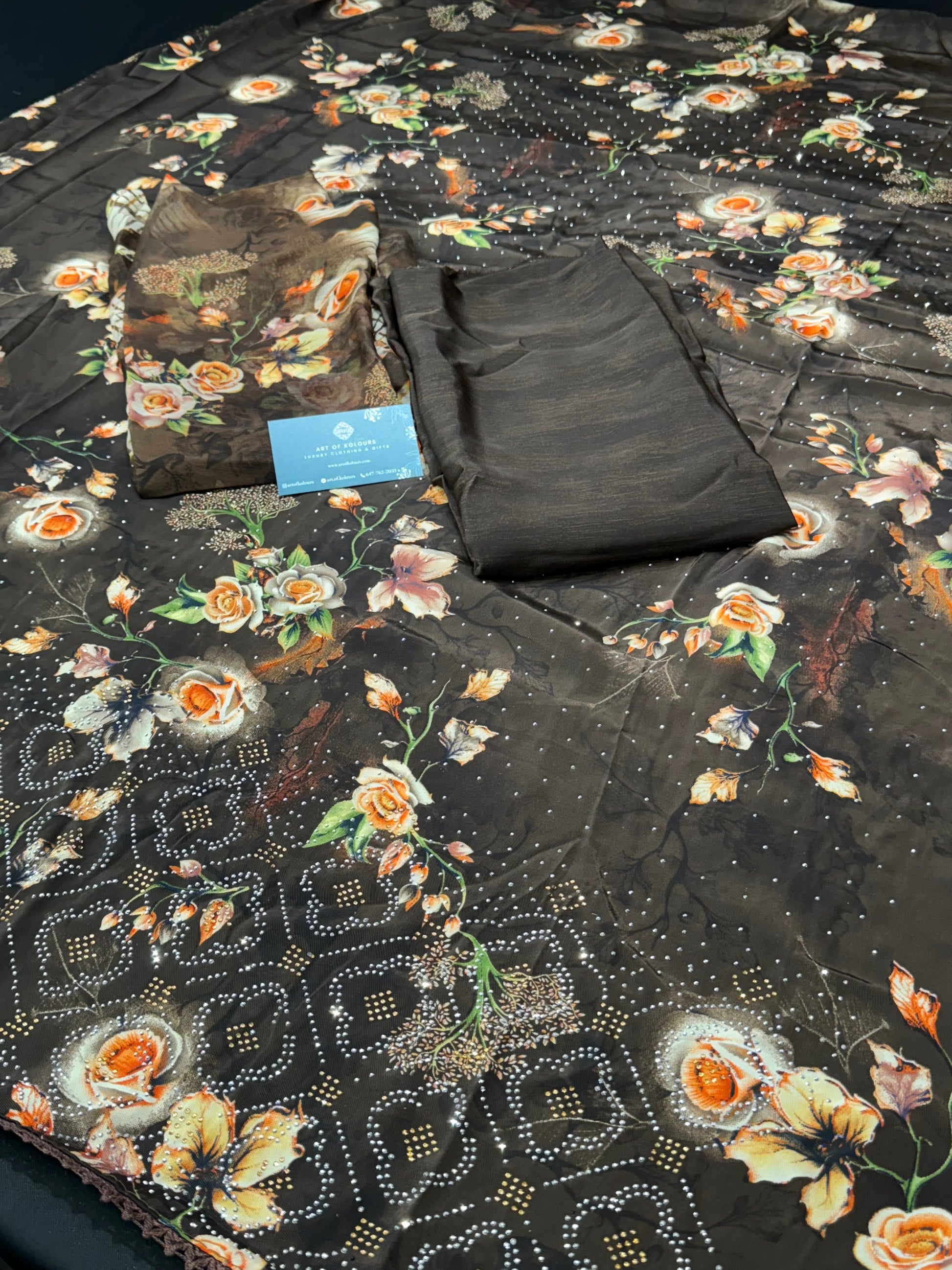 This Chill Mill Tara Unstitched Suit features a beautiful floral print and small stone work, adding a touch of elegance to your wardrobe. Made from high-quality materials, it offers both style and comfort for any occasion. Elevate your look with this stunning suit.