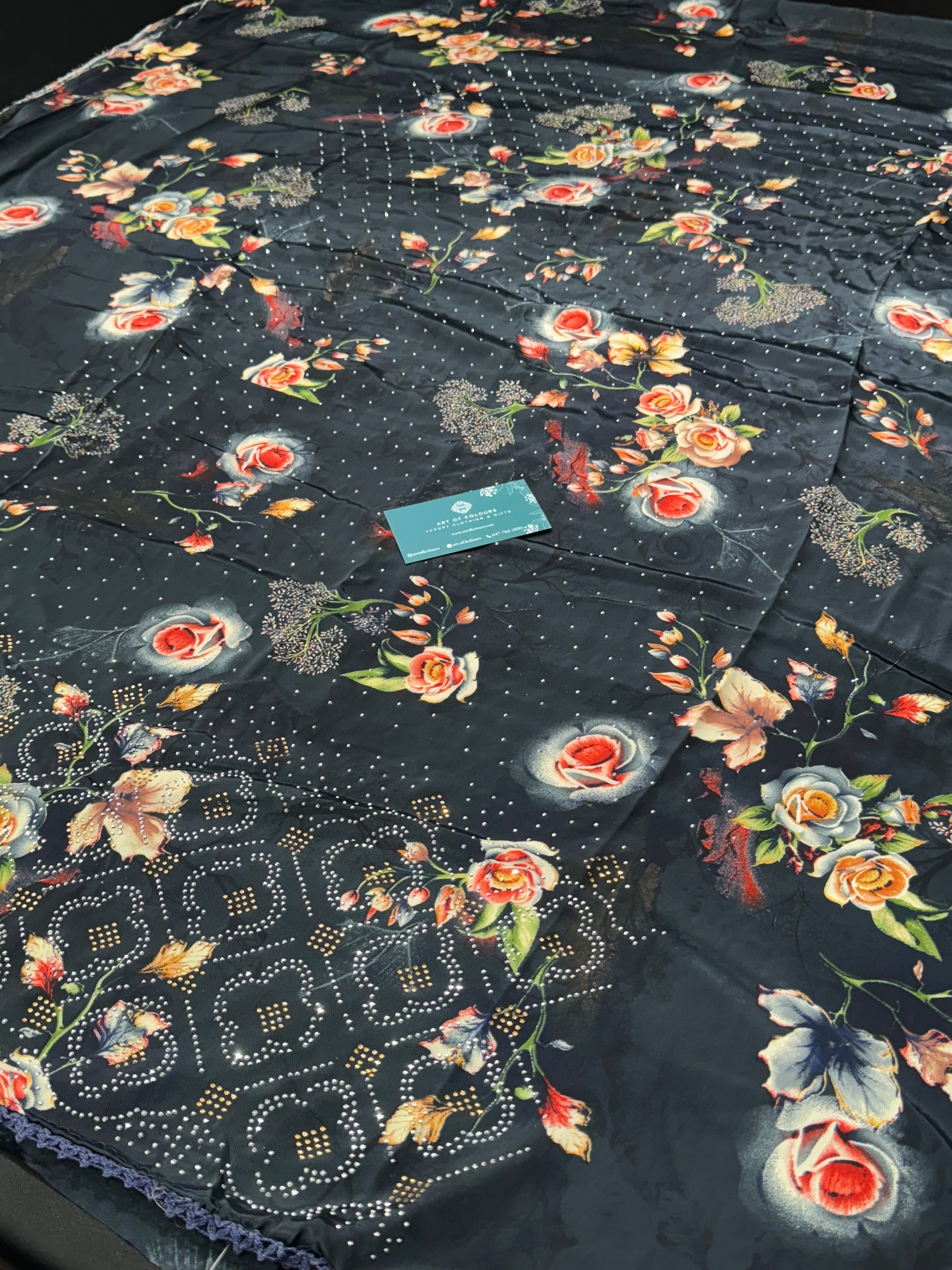 This Chill Mill Tara Unstitched Suit features a beautiful floral print and small stone work, adding a touch of elegance to your wardrobe. Made from high-quality materials, it offers both style and comfort for any occasion. Elevate your look with this stunning suit.
