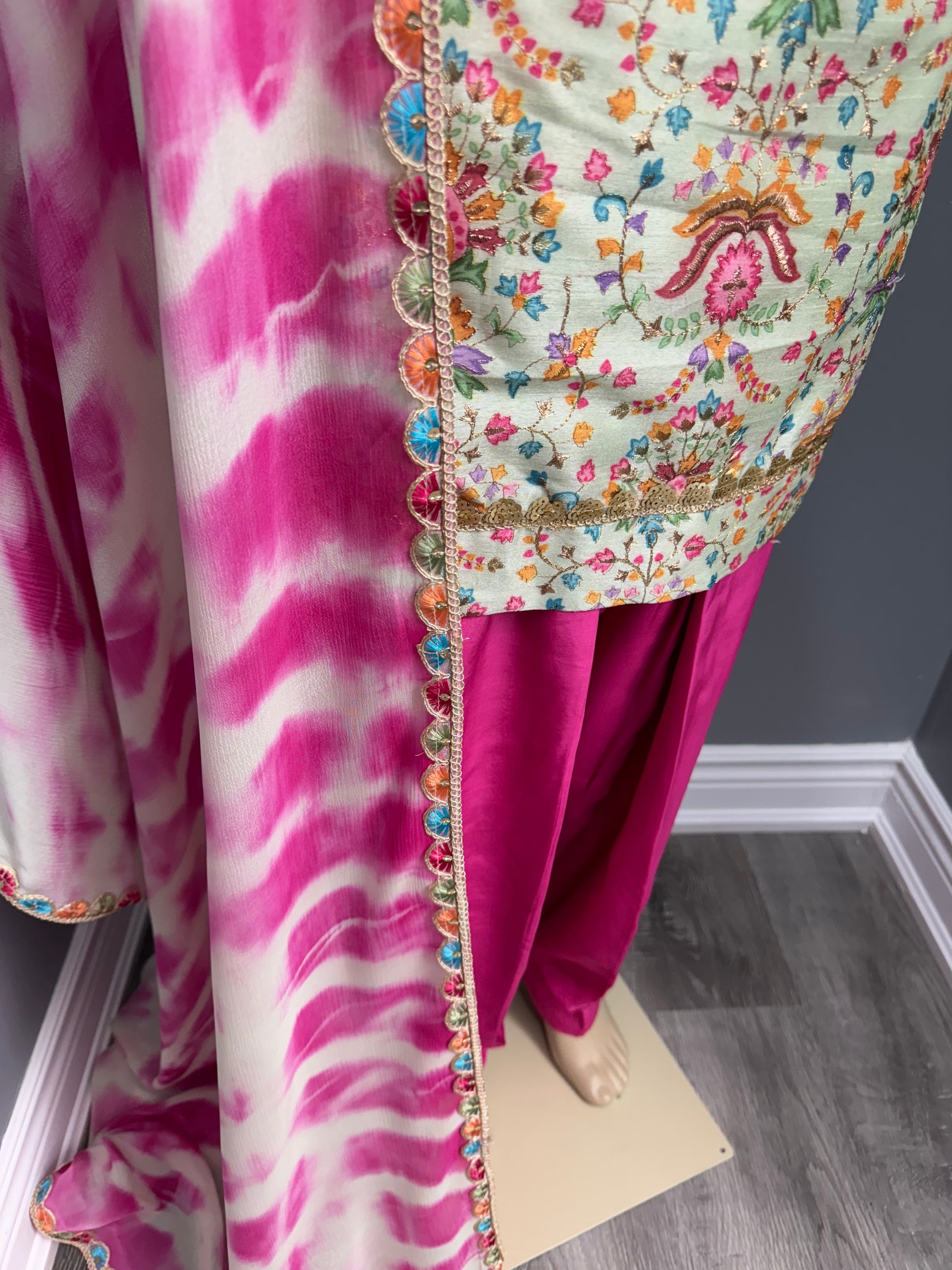 This Pista Butter Gulzar Salwar Suit boasts a beautiful print on the shirt, highlighted with intricate embroidered work. Crafted with care and attention to detail, this suit is sure to elevate any occasion. The perfect blend of traditional and modern design, it will make you stand out with elegance and grace.