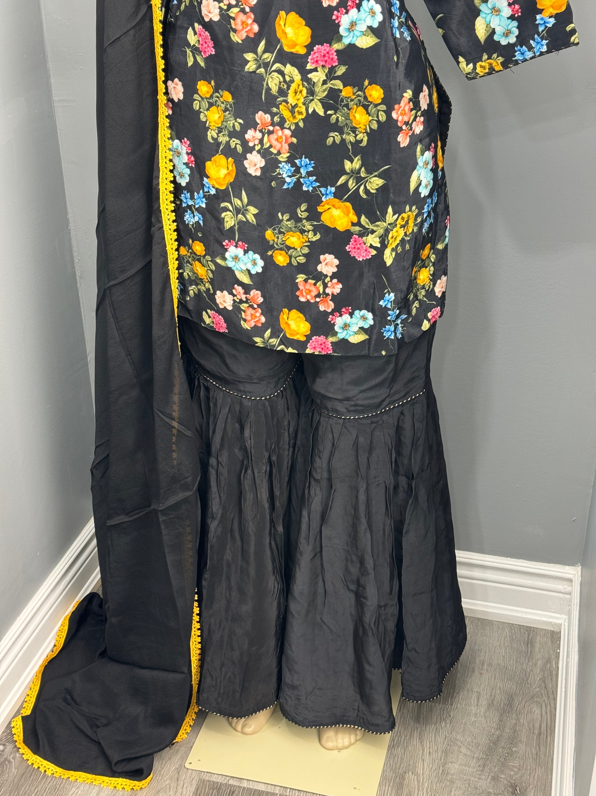 Enhance your style with this beautiful Printed Gharara Suit. This stunning suit features a gorgeous dupatta for a touch of elegance. Elevate your wardrobe with this must-have piece.