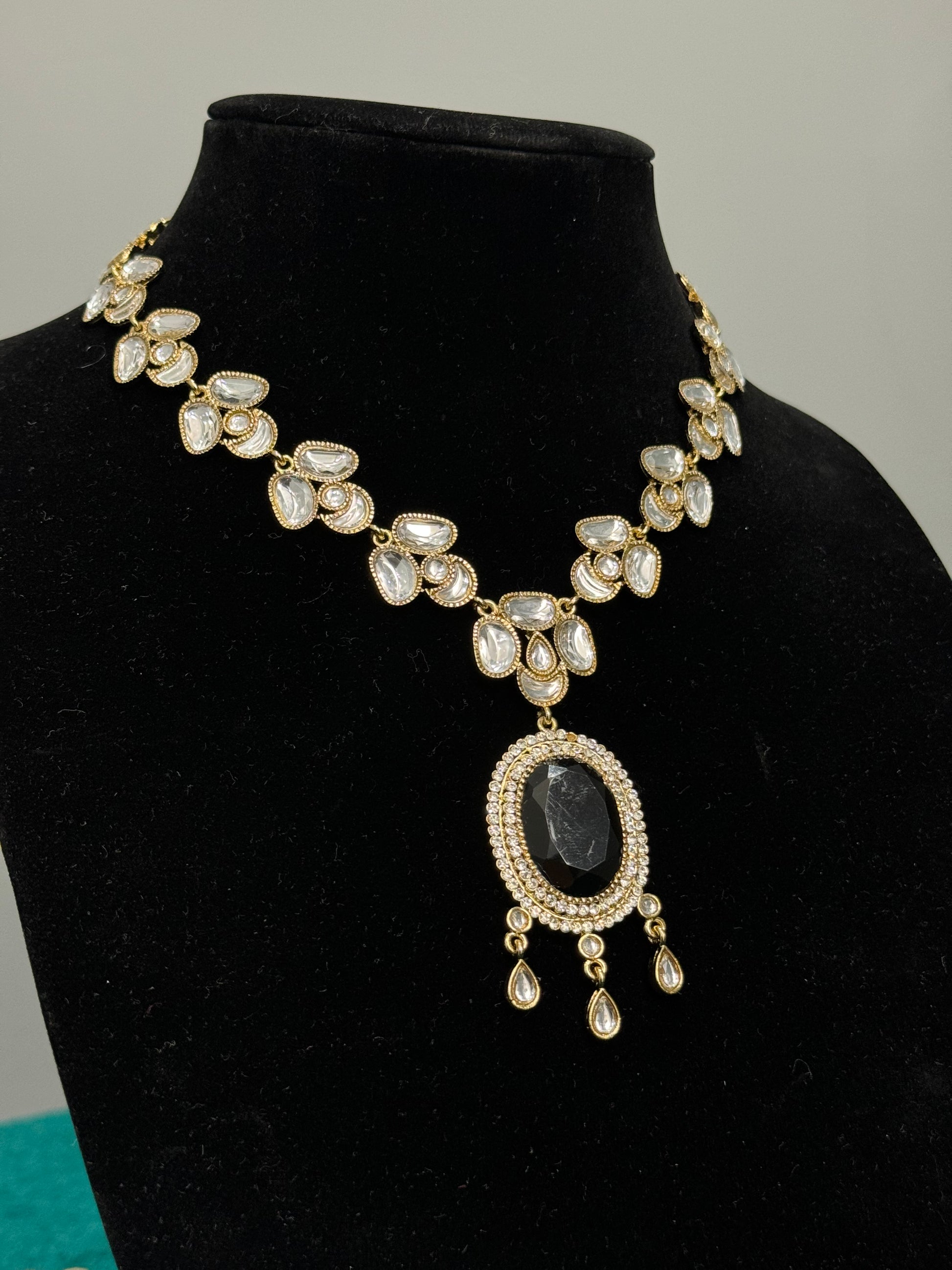 Add a touch of timeless elegance to your collection with this stunning jewelry set. The necklace features delicate gold-toned floral motifs accented with shimmering white stones, leading to a bold black oval centerpiece framed by sparkling crystals. The matching earrings carry the same black and gold theme with intricate detailing and dangling crystal accents, creating a cohesive and glamorous look. This jewelry set is designed for those who want to stand out with grace and sophistication. A perfect blend of modern and traditional design, it’s sure to enhance any outfit.