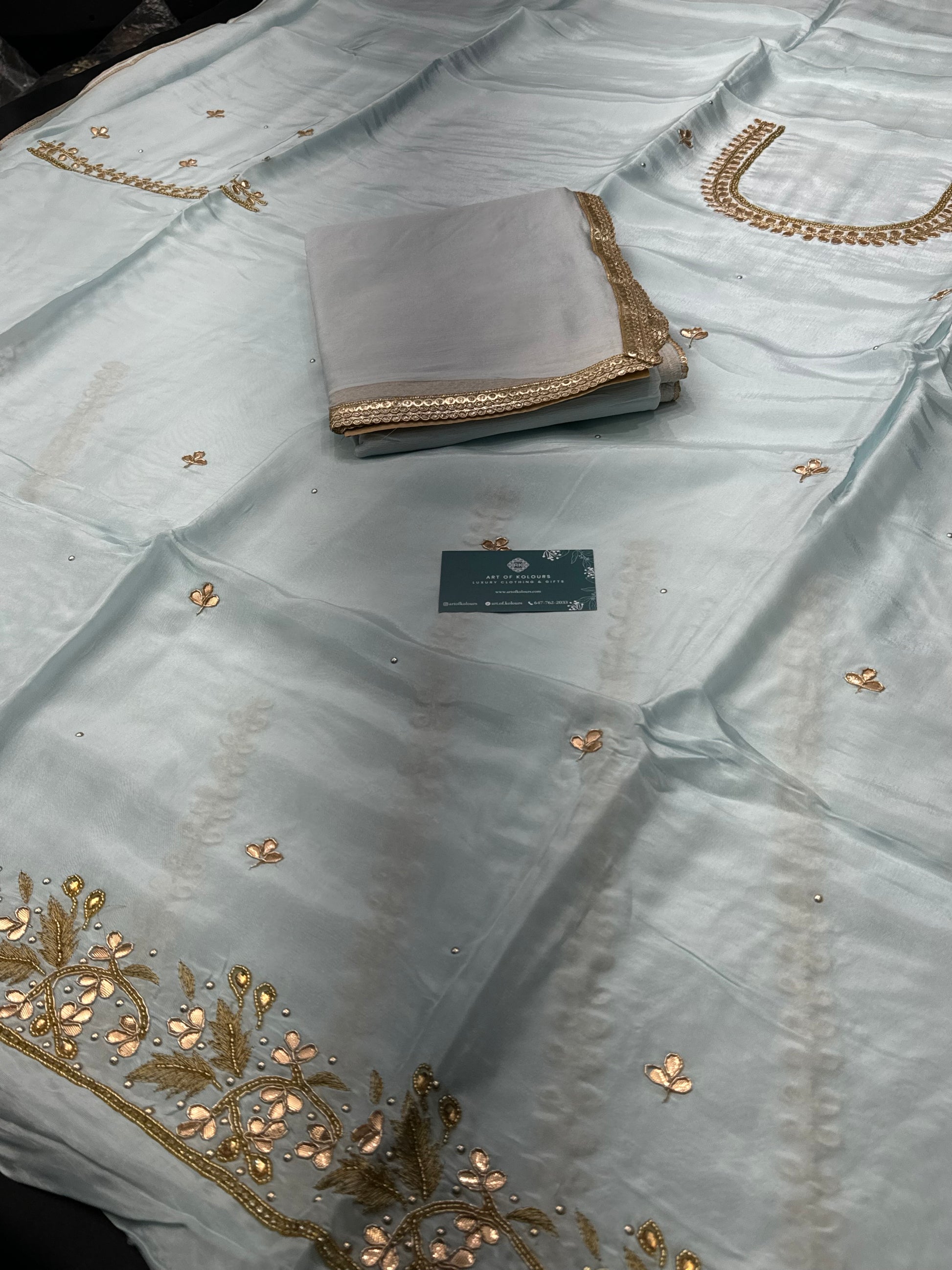 Enhance your wardrobe with the Fikaneel Unstitched Suit. This beautiful baby blue suit features stunning gold embroidery work and intricate gota pati handwork, giving you an elegant yet sophisticated look. The included dupatta adds a touch of grace. Finished off with delicate lace, this suit is a must-have for any special occasion.