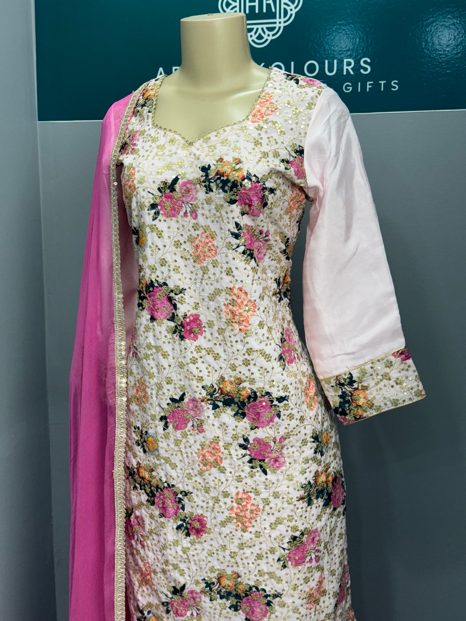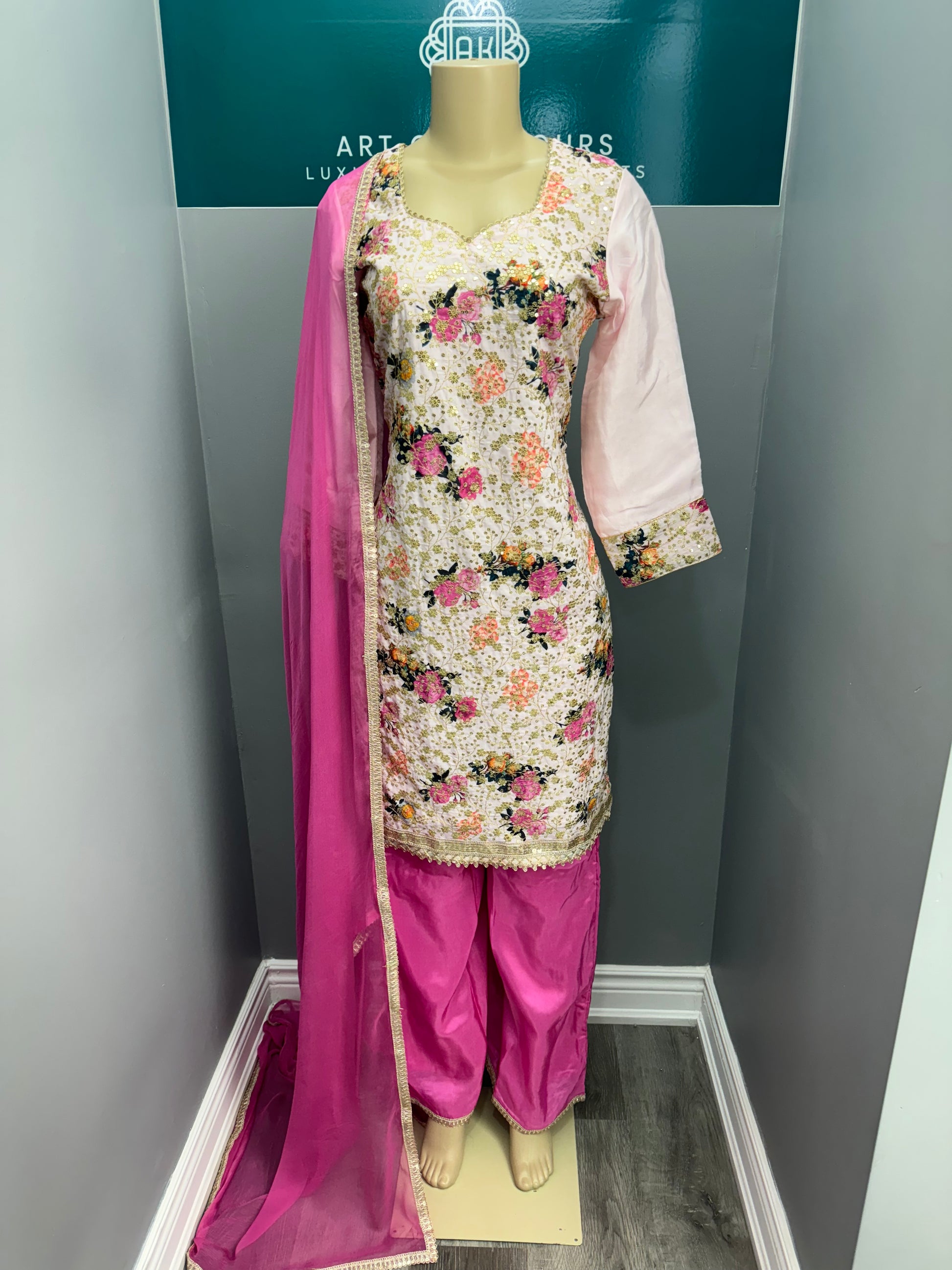 Enhance your style with this beautiful Plazo Suit. This stunning suit features gorgeous floral print and intricate sequin work for a touch of elegance. Dupatta that completes the look. Elevate your wardrobe with this must-have piece.