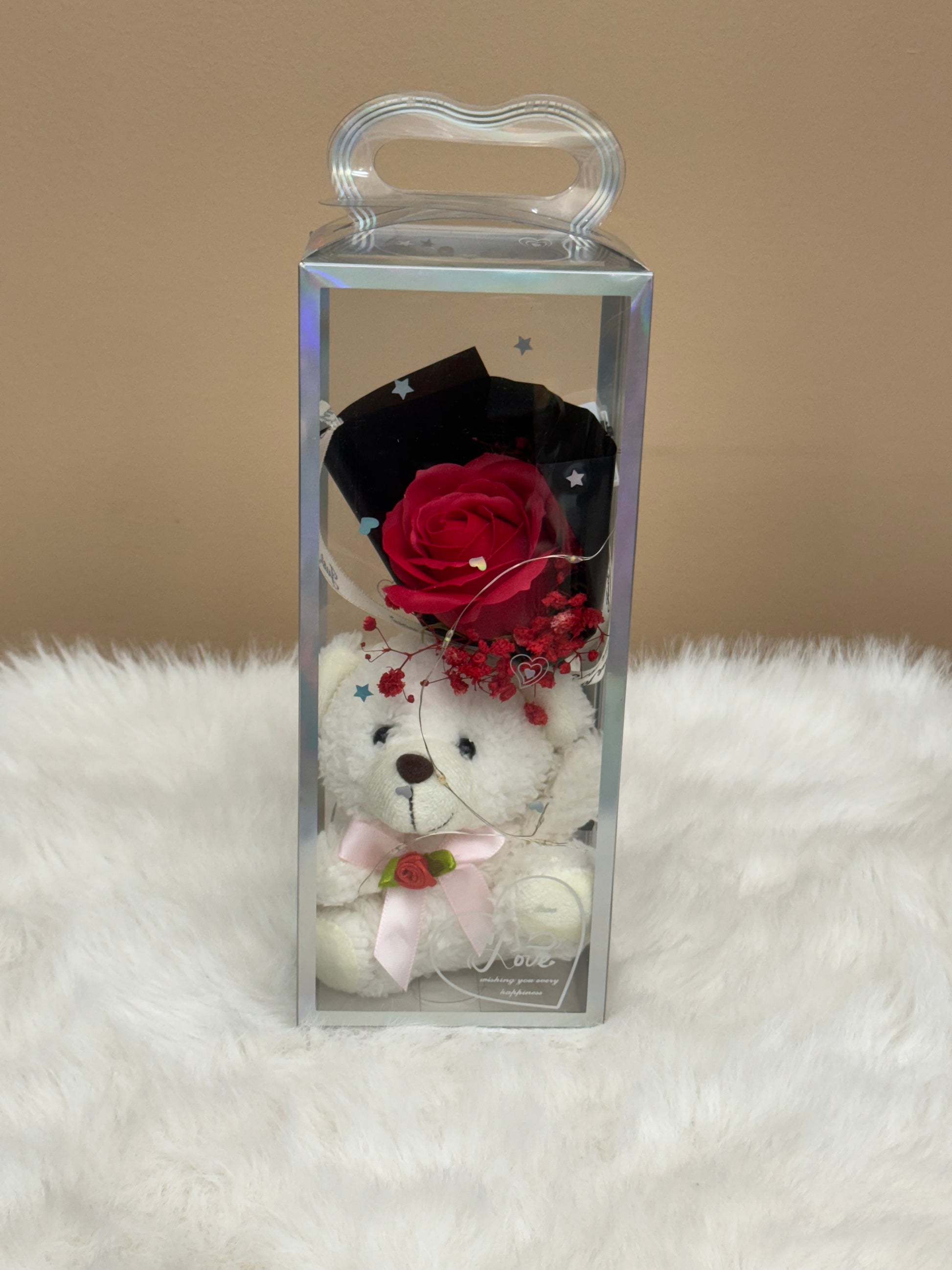 Crafted with love, these Flower Teddy Boxes are sure to light up any room. The delicate design adds a touch of elegance to any space, while the soft lights create a cozy atmosphere. Perfect for adding a romantic touch to weddings, anniversaries, or special occasions.