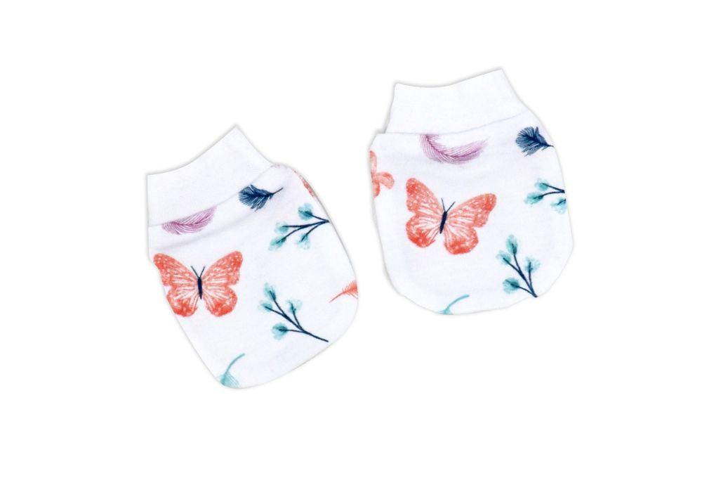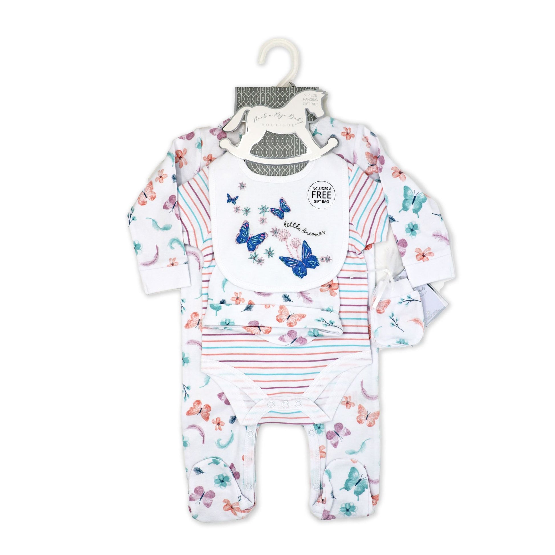 This 5 piece mesh bag set for girls includes a sleeper, bodysuit, hat, mitts, and bib, all packaged in an organza mesh bag with a complimentary gift bag. Keep your little one comfortable and stylish with this adorable butterfly-themed set. Perfect for gifting and everyday wear.