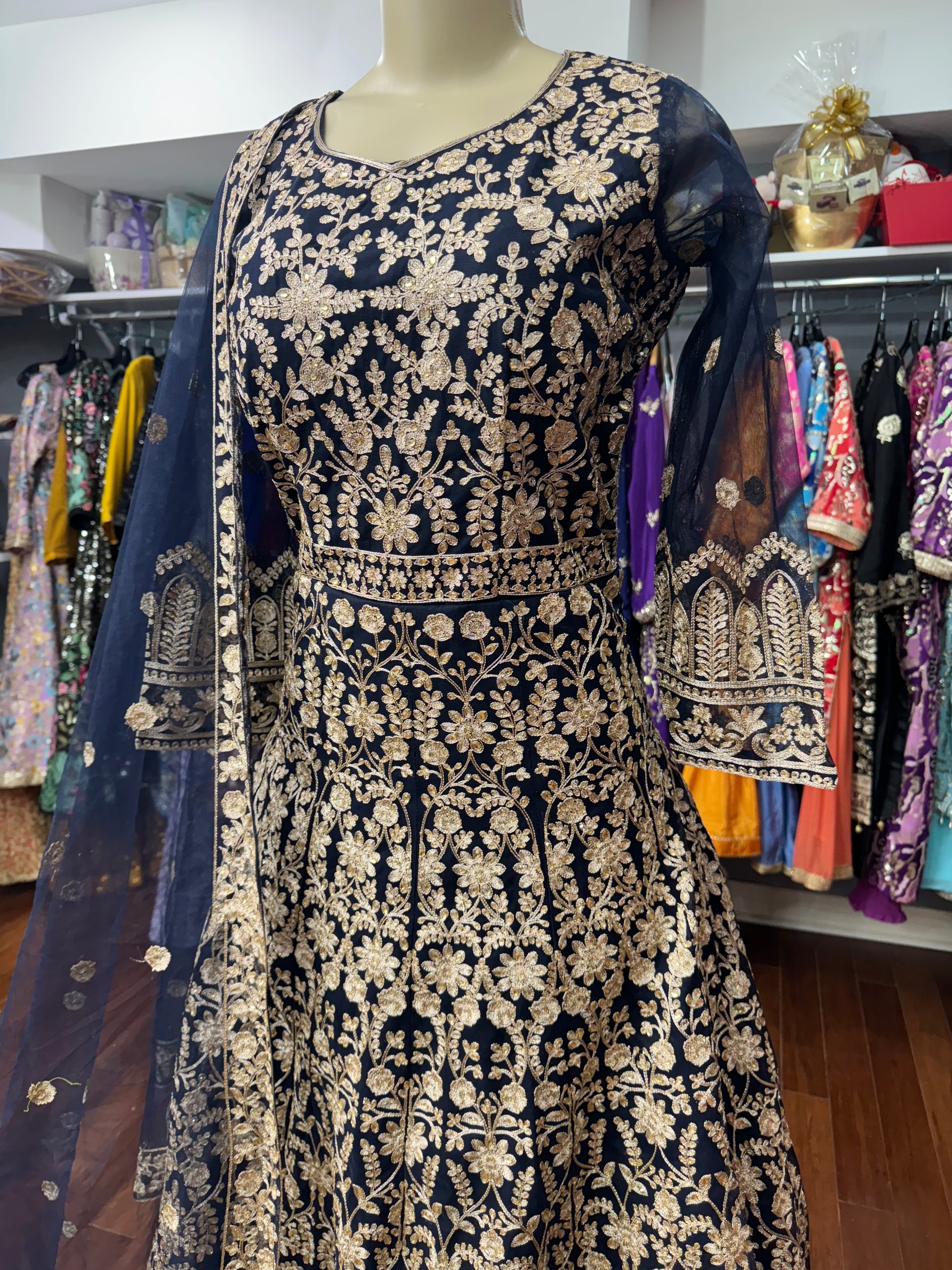 Gold Thread Work Navy Long Dress
