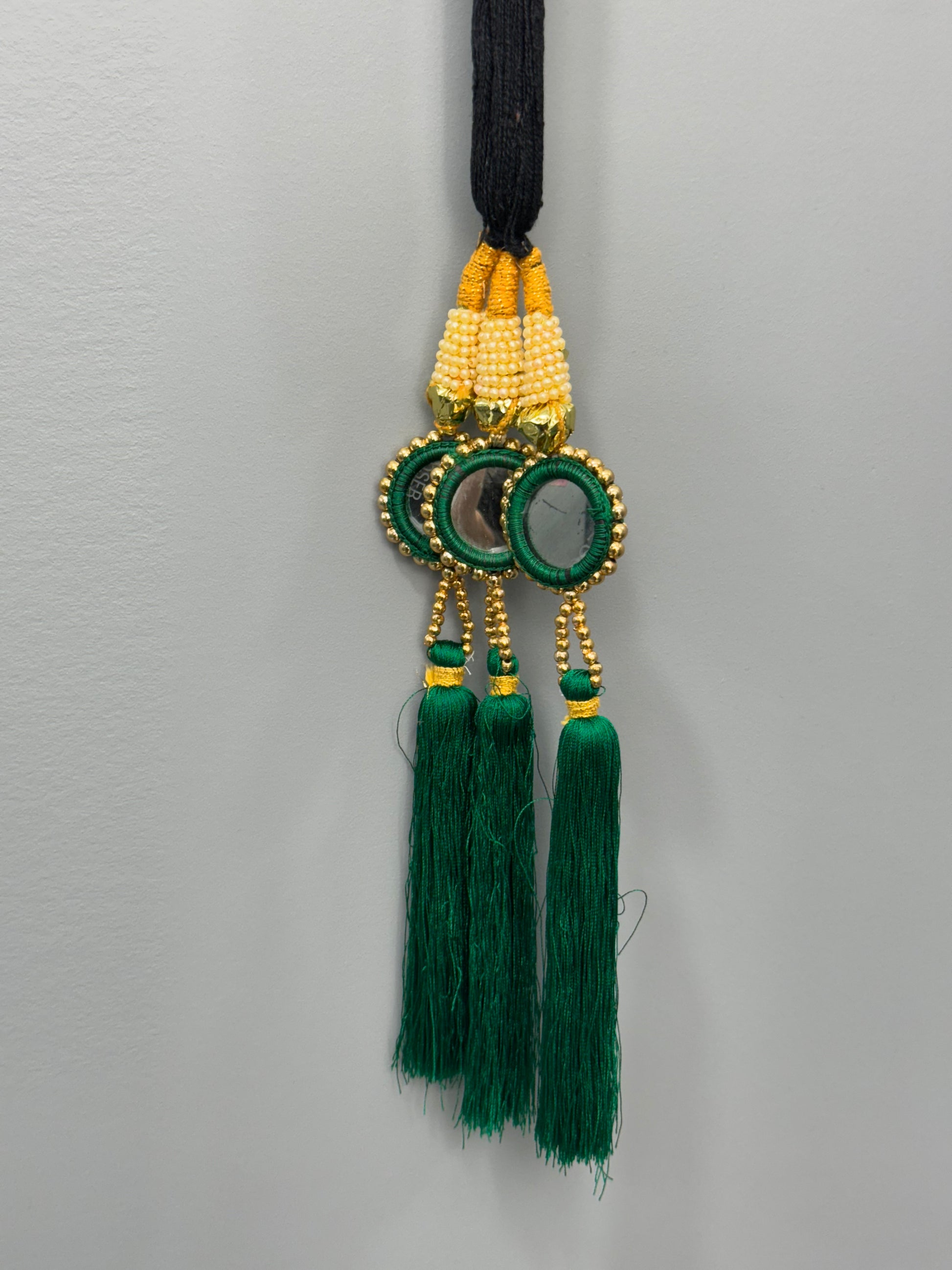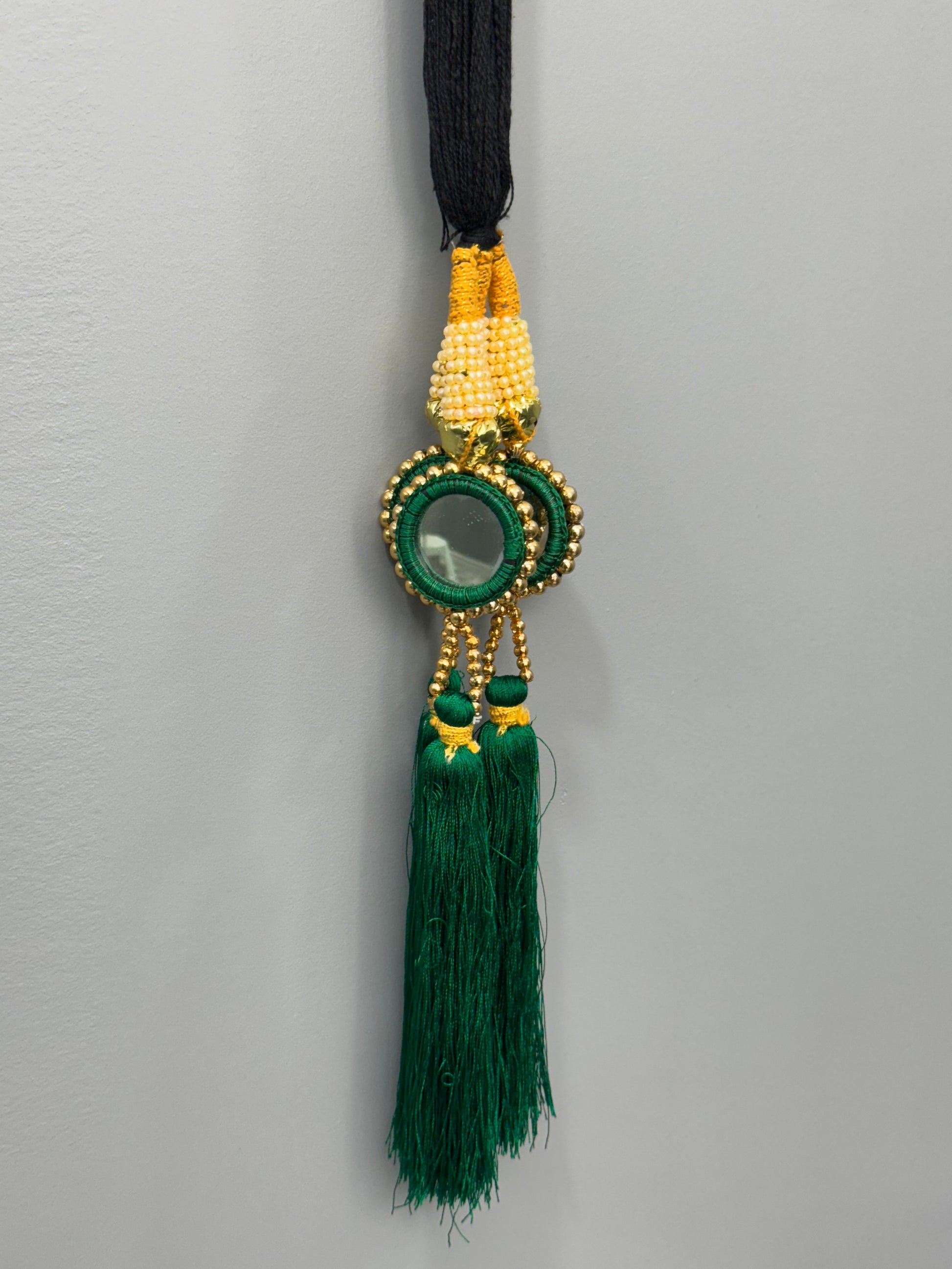The Parandi is a traditional accessory often used in Punjabi culture to adorn braids. The double-layer design adds a rich and intricate aesthetic, with purple thread complementing the opulence of gold embellishments. It’s typically crafted for festive occasions, weddings, or cultural events, pairing beautifully with vibrant Punjabi suits or lehengas to enhance the overall look.