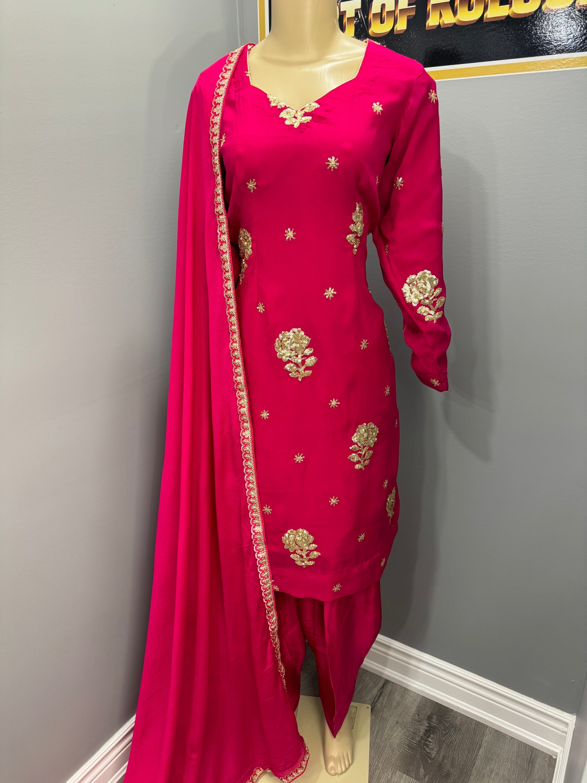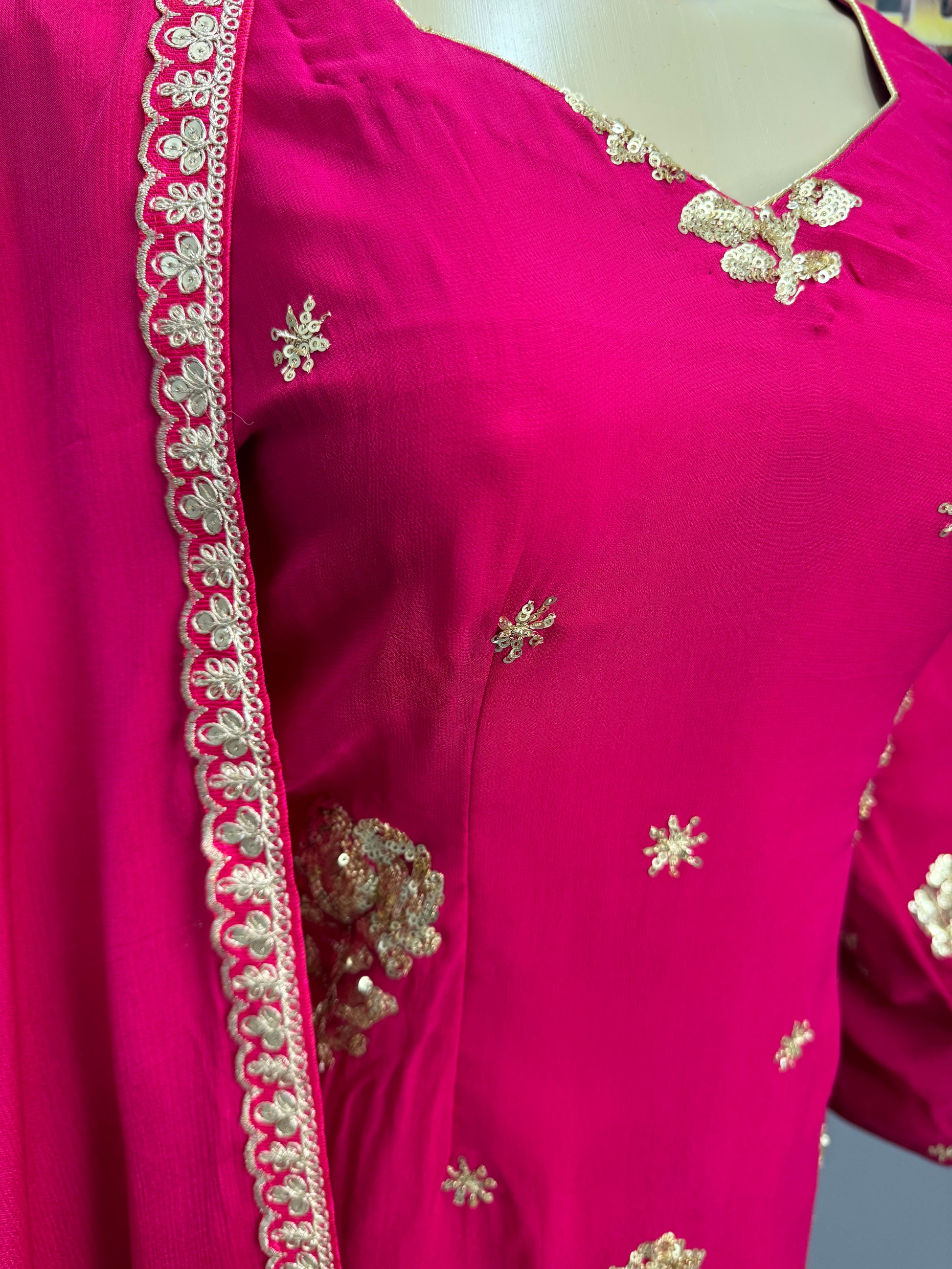 This Gulabi Sippi Salwar Suit features stunning sippi work on the shirt, adding a touch of elegance to your outfit. With its beautiful design and intricate detailing, this suit is perfect for any occasion. Made with high-quality materials, it is comfortable and durable. Elevate your wardrobe with this exquisite piece.