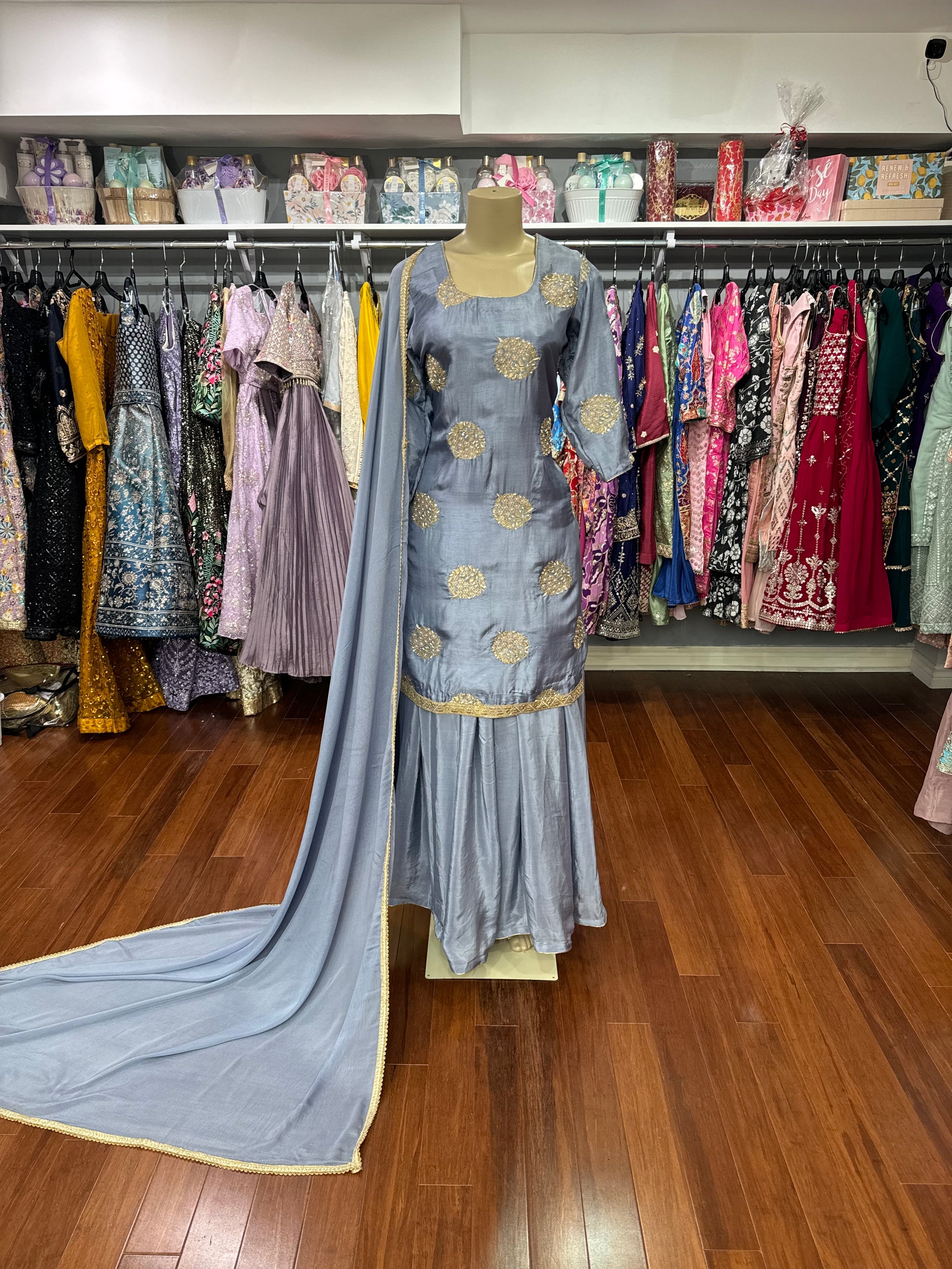 Experience elegance and craftsmanship with our Handwork Butti Banarsi Sharara Suit. Each piece is intricately designed with handwork and adorned with beautiful butti embroidery. Embrace the timeless appeal of this classic piece, perfect for any special occasion.