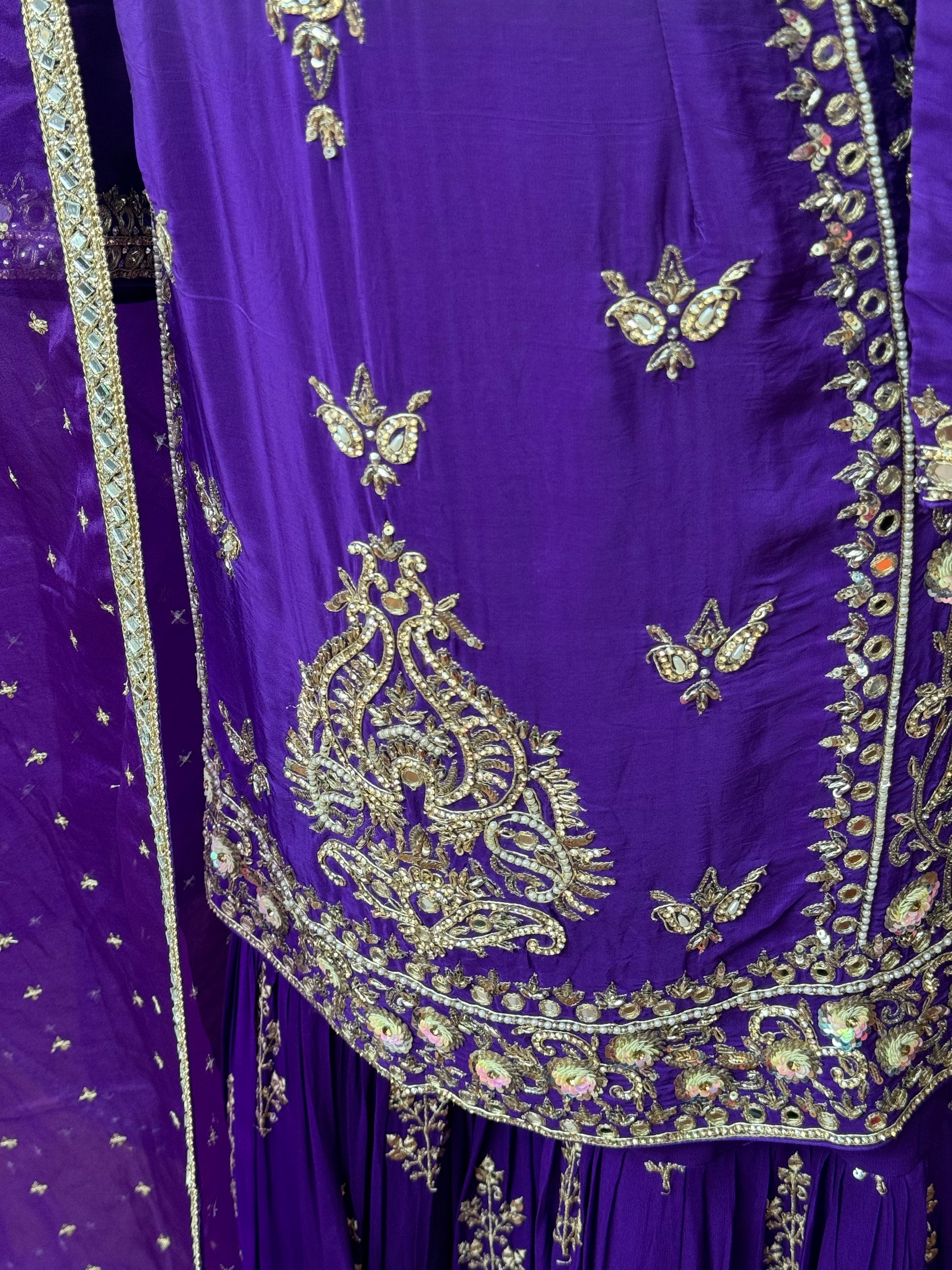 As an expert in the fashion industry, I introduce to you the Handwork Pure Purple Sharara Suit. Made with intricate handwork, this suit exudes elegance and sophistication. The smooth and comfortable fabric will make you stand out in any occasion. Versatile and timeless, elevate your style with this stunning sharara suit.