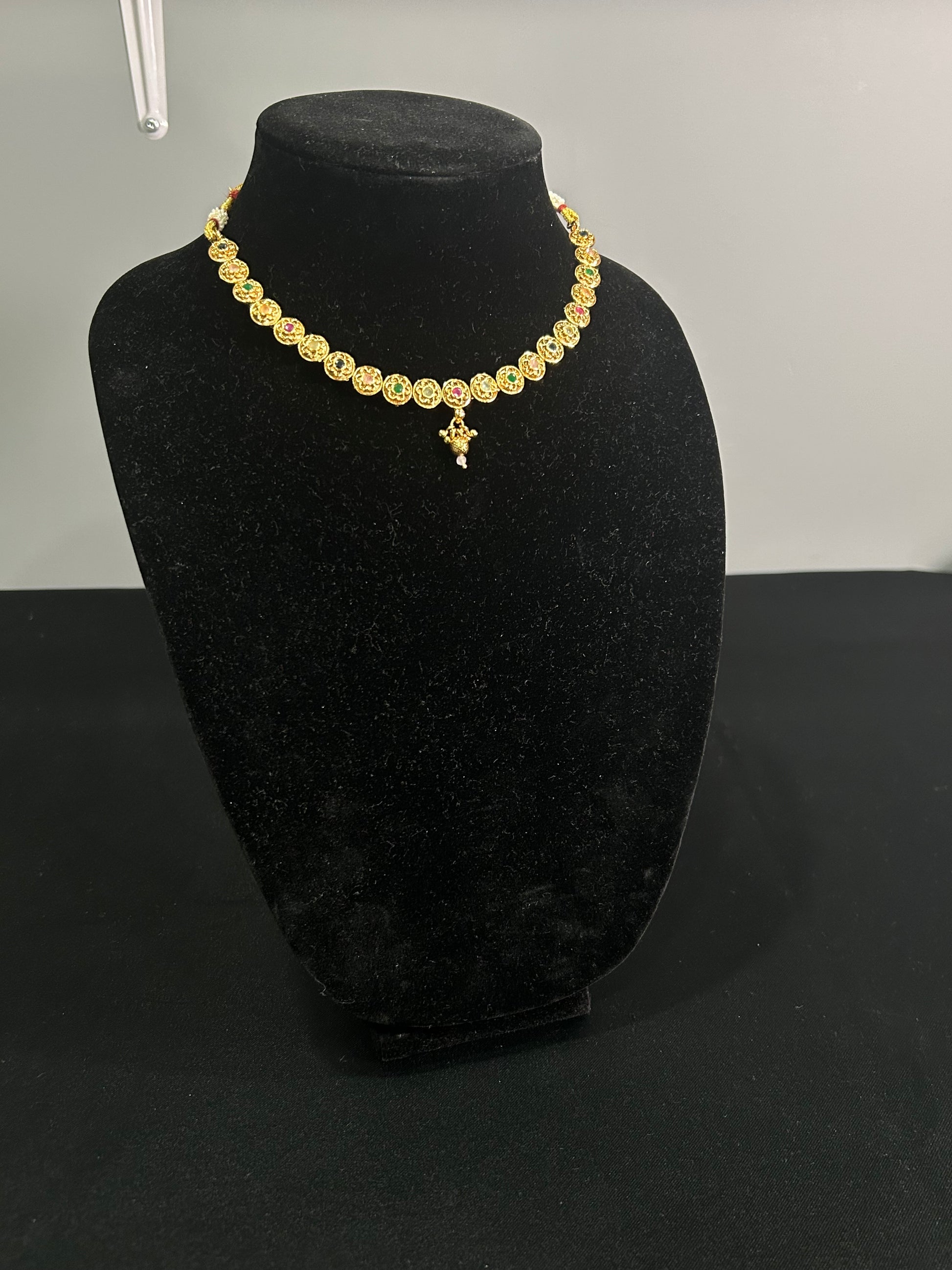 This elegant Necklace set will add a touch of glamour to any outfit. The intricate designs of the necklace and earrings, combined with the beautiful stones, will make you stand out in any crowd. Handcrafted with precision, this set is sure to impress.