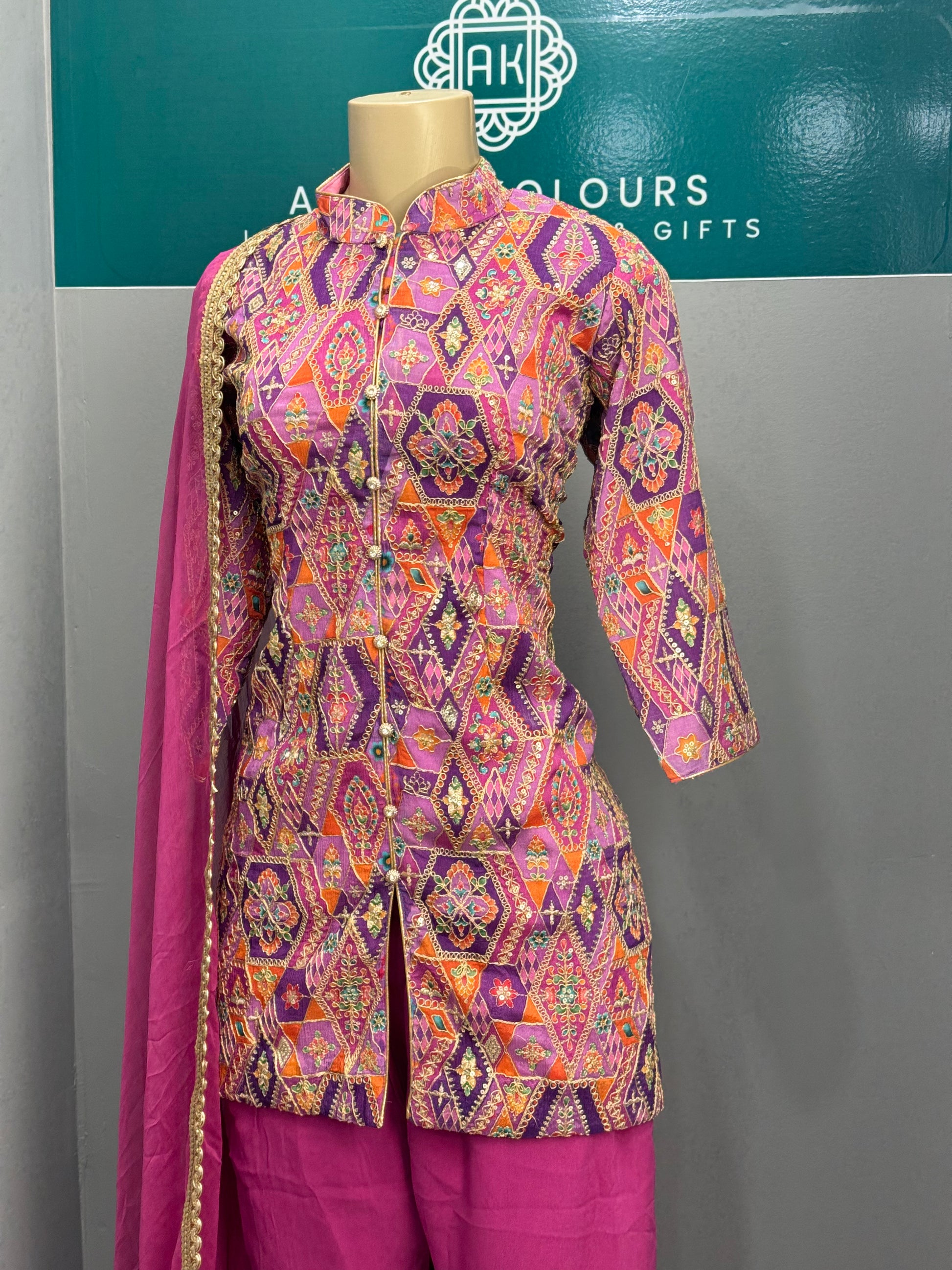 Enhance your style with this beautiful Jacket Plazo Suit. This stunning suit features gorgeous print and intricate sequin work for a touch of elegance. Dupatta that completes the look. Elevate your wardrobe with this must-have piece.