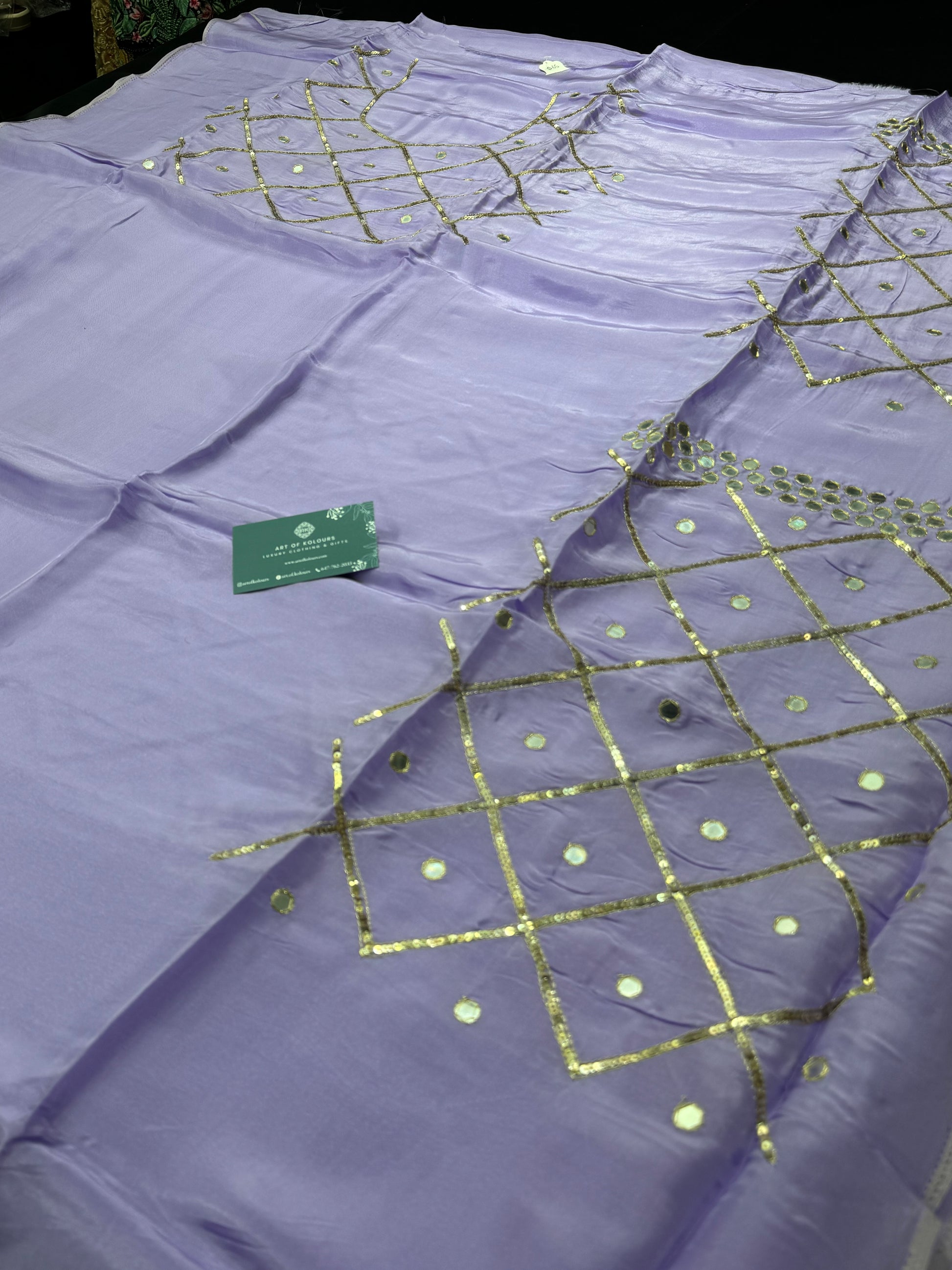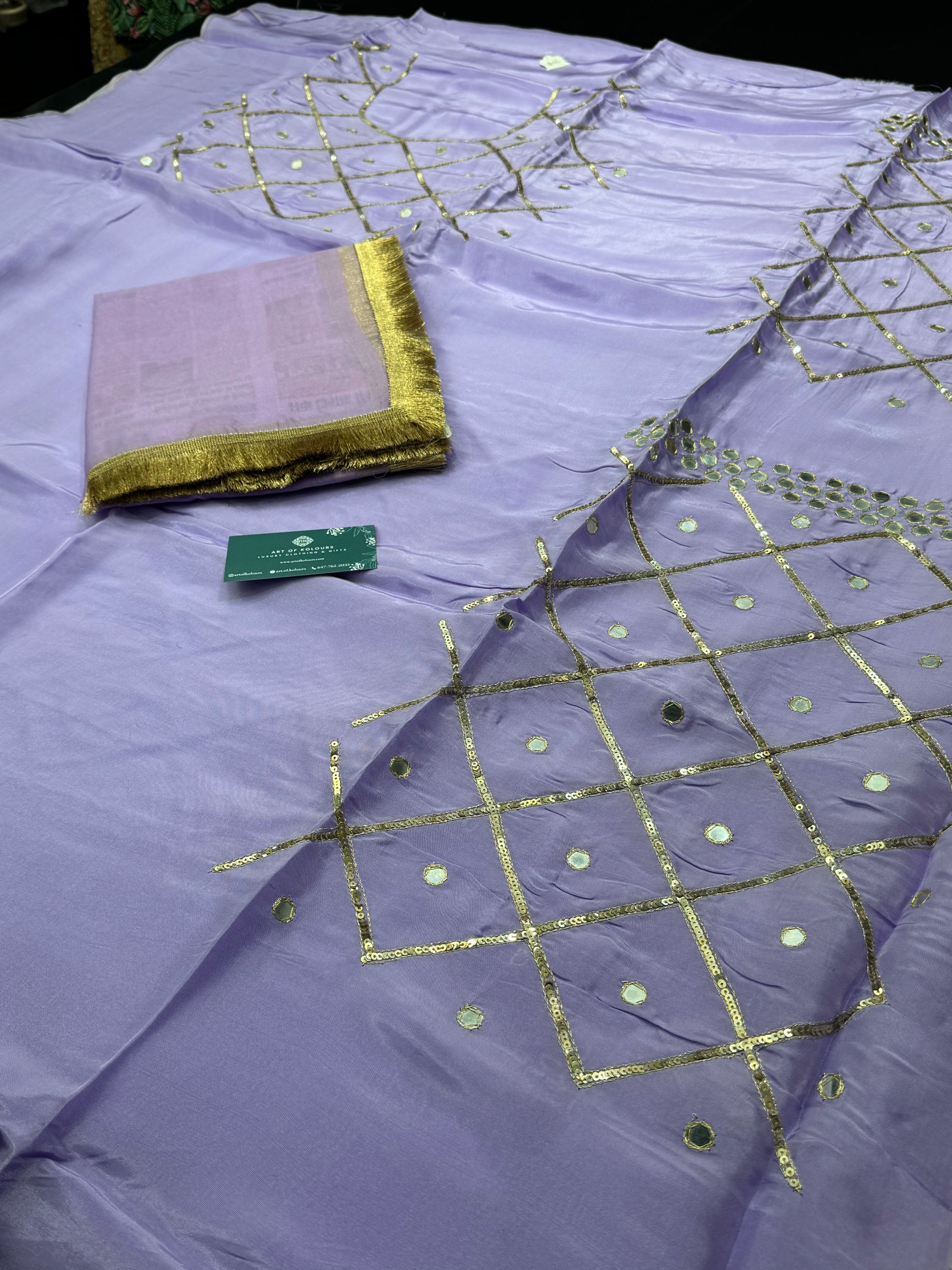 This Jamni Sesha Unstitched Suit features a beautiful lavender color with intricate gold embroidery and mirror work. Perfect for special occasions, it adds a touch of elegance and glamour to your wardrobe. Elevate your style with this stunning suit.