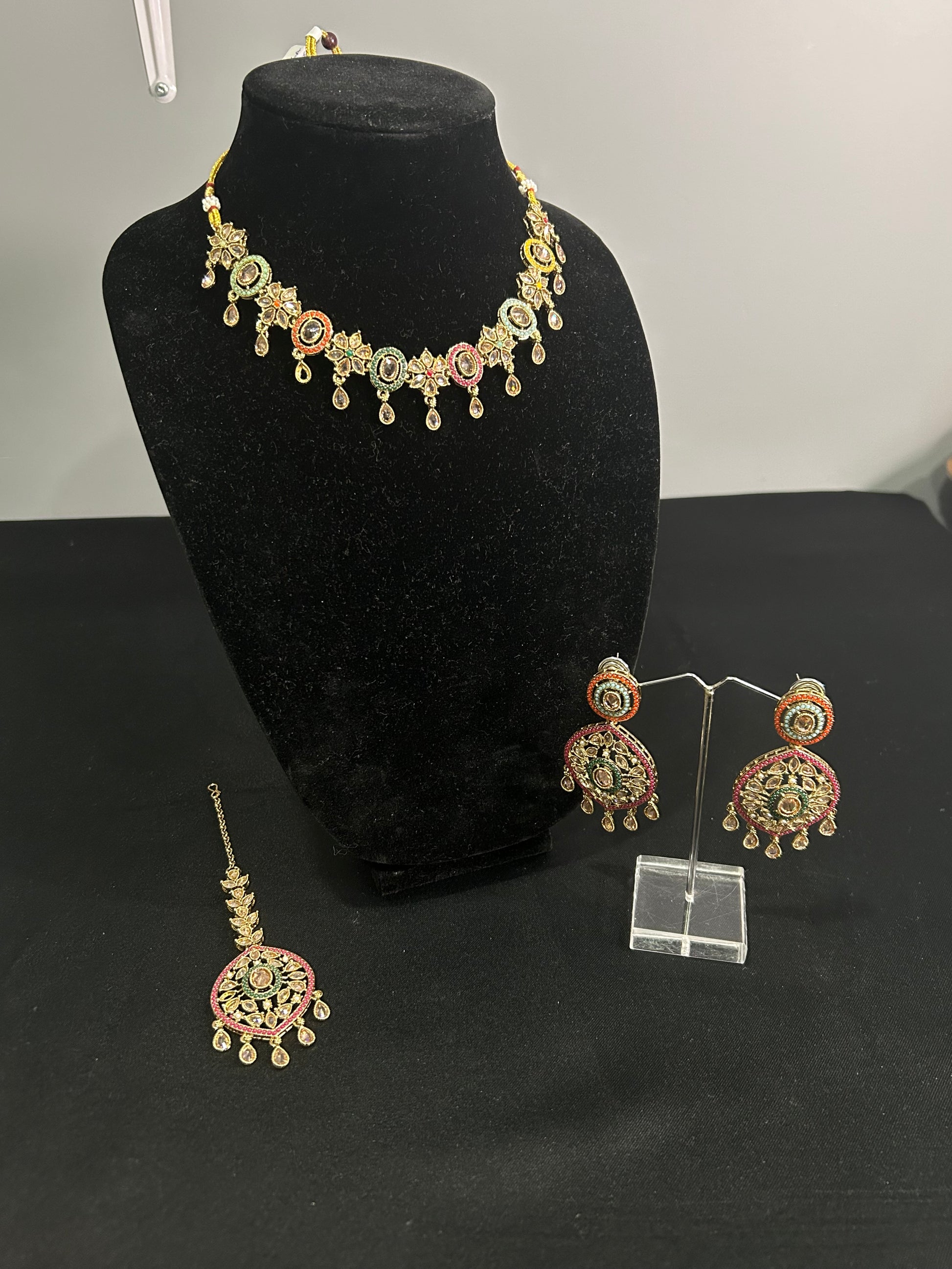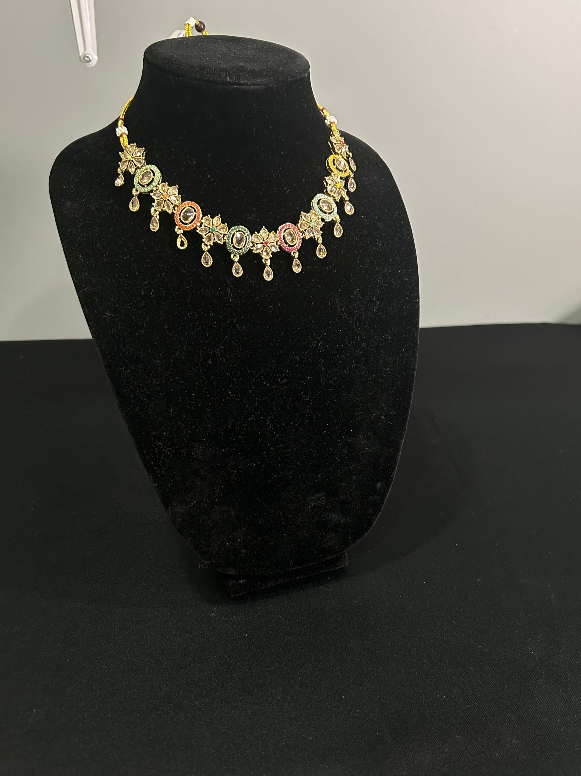 This elegant Necklace set will add a touch of glamour to any outfit. The intricate designs of the necklace and earrings, combined with the beautiful stones, will make you stand out in any crowd. Handcrafted with precision, this set is sure to impress.