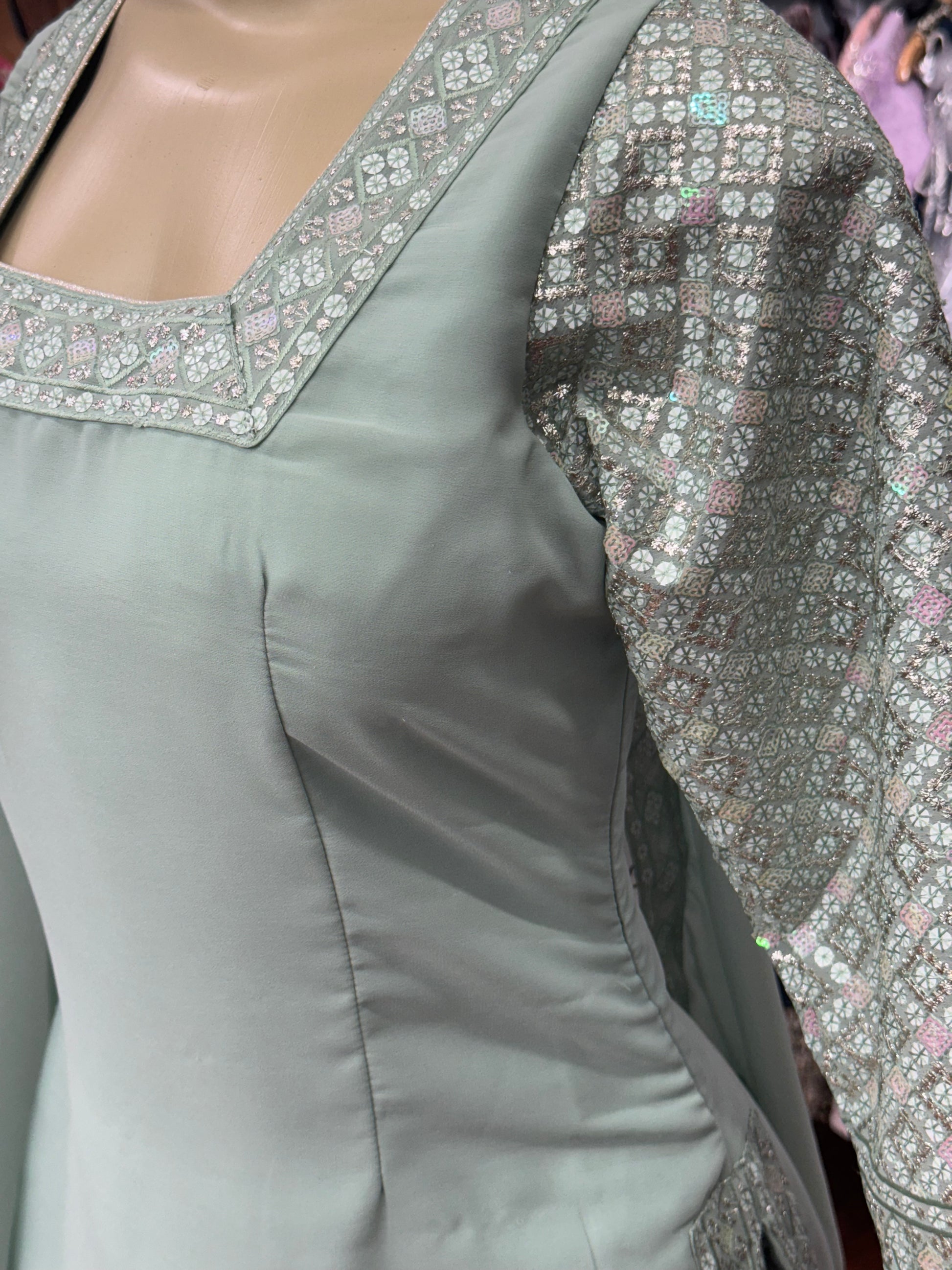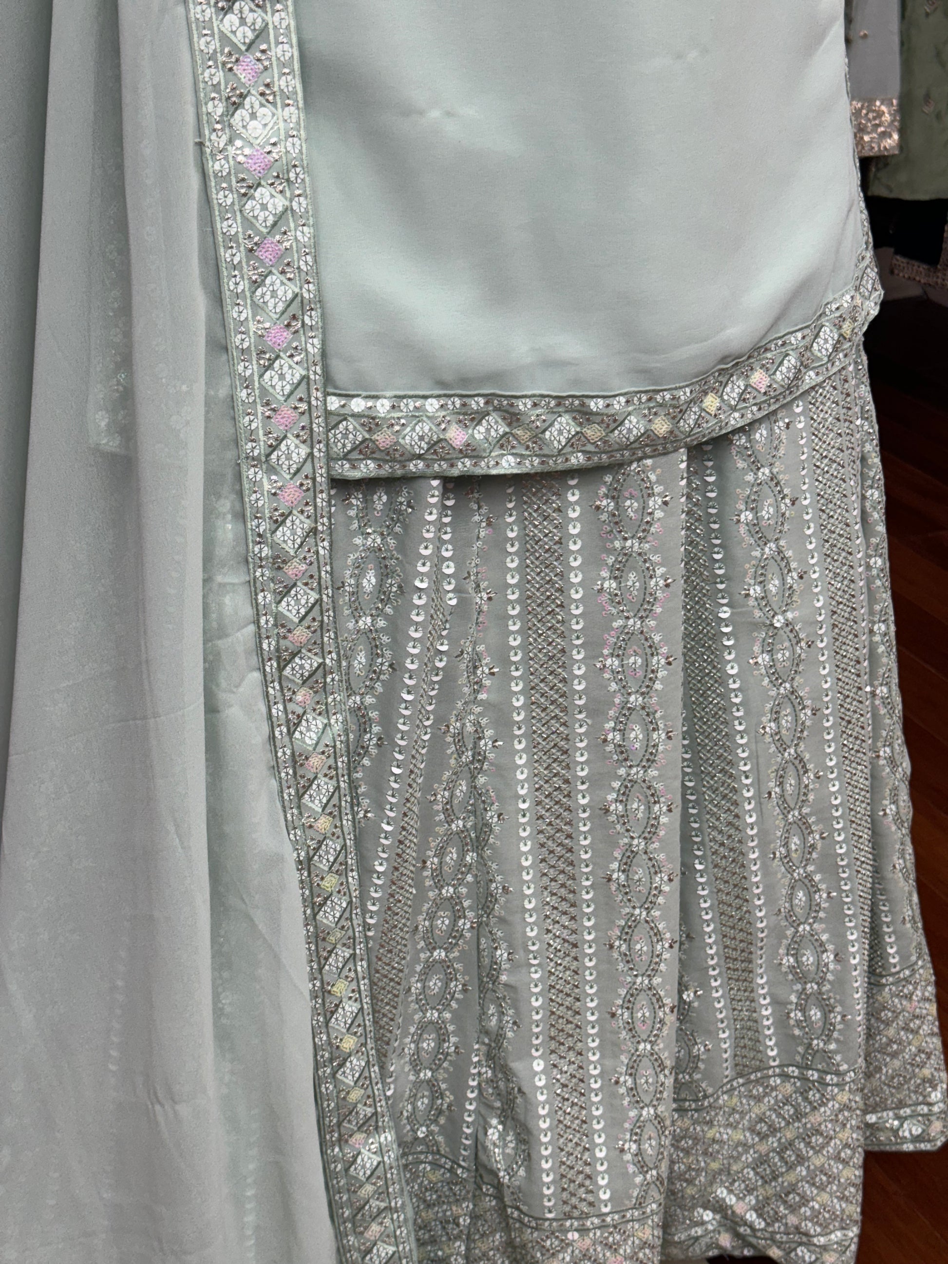 This mint-colored lehenga set features intricate sequence work on its long top. The delicate design adds a touch of elegance, perfect for any formal occasion. Made with high-quality materials for comfort and durability. Elevate your style with this beautiful lehenga set.
