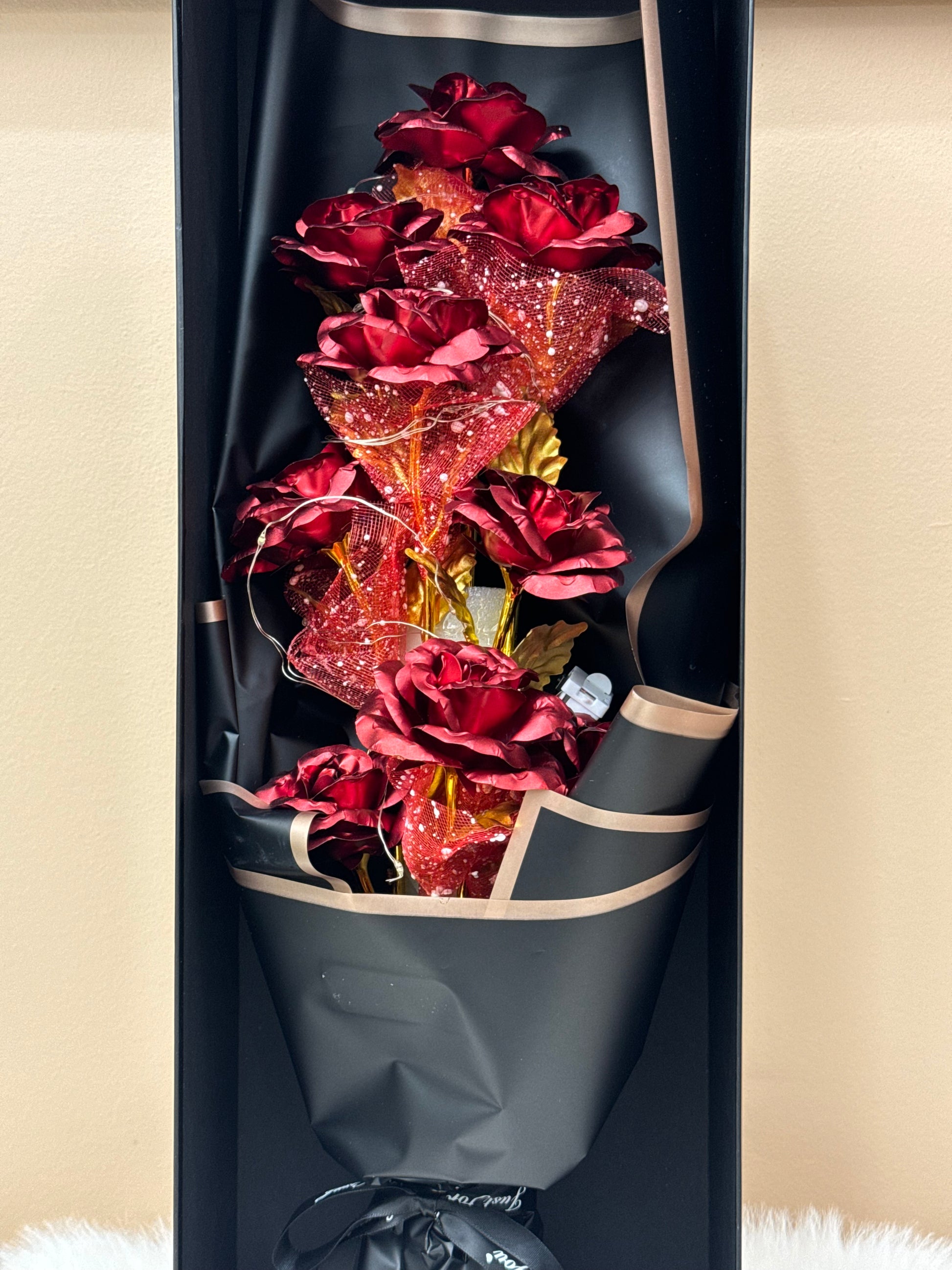 The Luminous Rose Bouquet Large with Box features a collection of faux roses designed for durability and aesthetic appeal. Encased in a large box, this arrangement provides a long-lasting decorative option, maintaining its vibrant appearance without the need for water or sunlight. Ideal for enhancing indoor spaces with elegance.