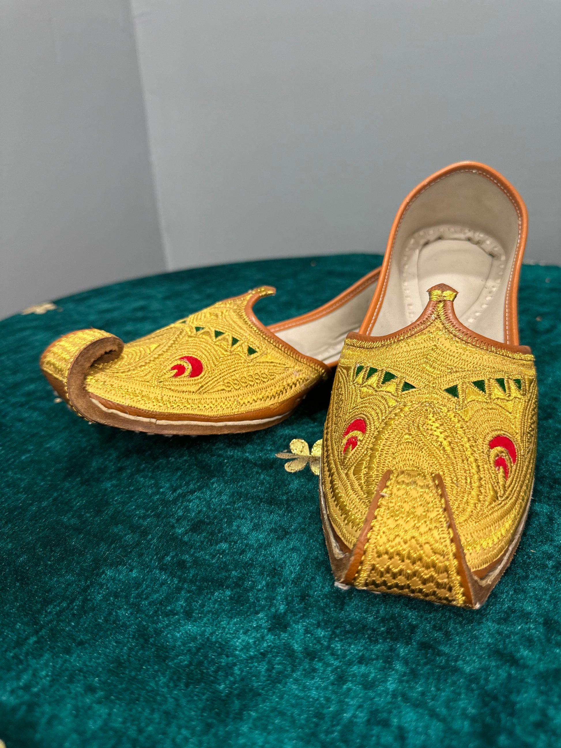 This men's gold jutti features intricate green and red details for a touch of elegance. Handcrafted with precision, this shoe offers a comfortable fit and a sophisticated look for any occasion. Made with quality materials, this jutti is a must-have for any fashion-forward gentleman. Elevate your style with this unique piece.