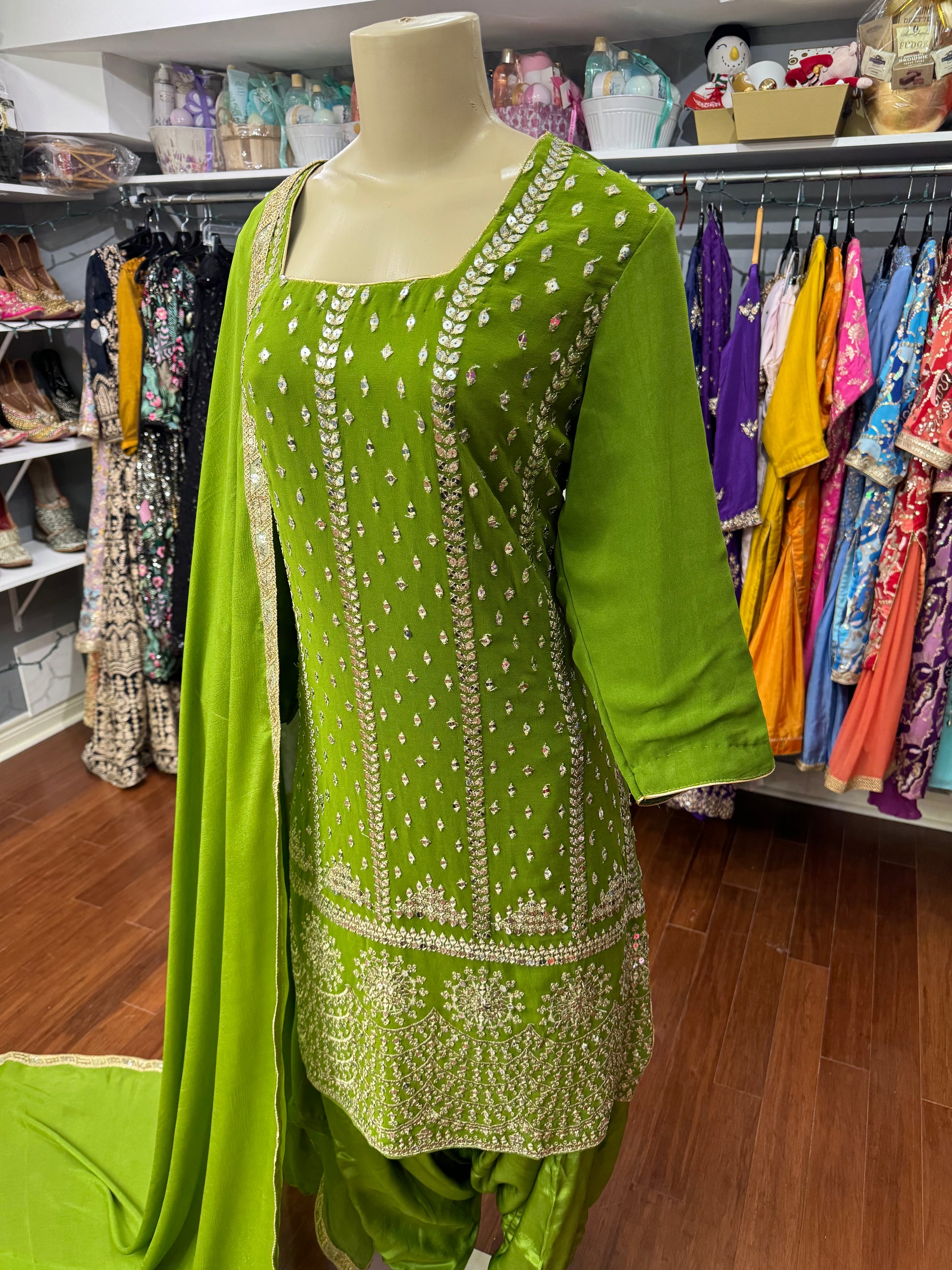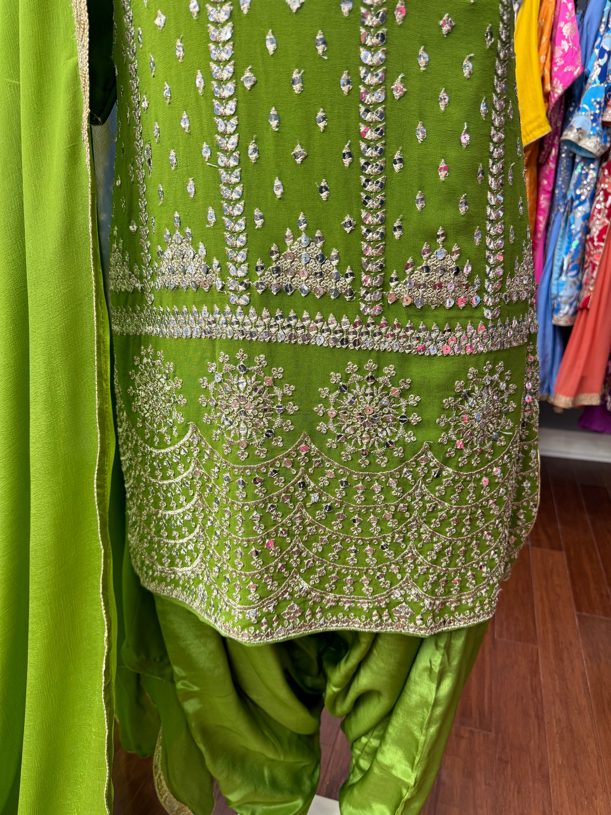 Expertly crafted with a stunning mendhi color, this party wear salwar suit exudes elegance and style. Designed for special occasions, the suit features intricate detailing and a comfortable fit. Perfect for making a statement, this suit is a must-have for any sophisticated wardrobe.