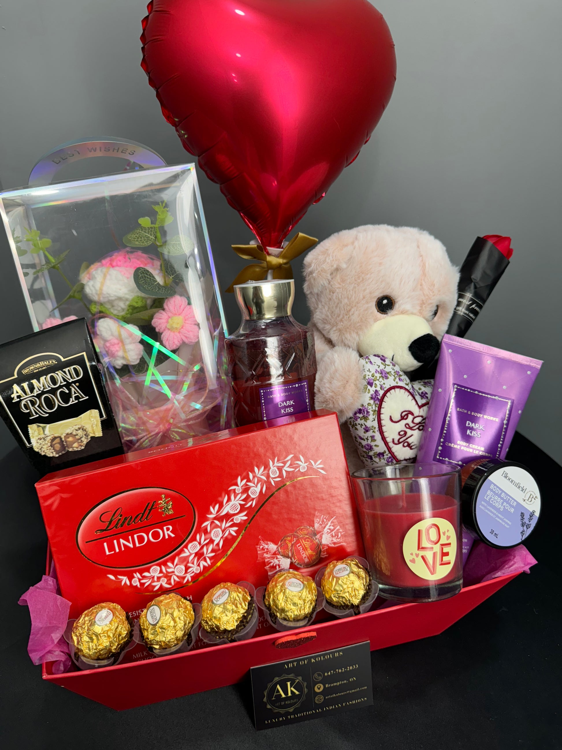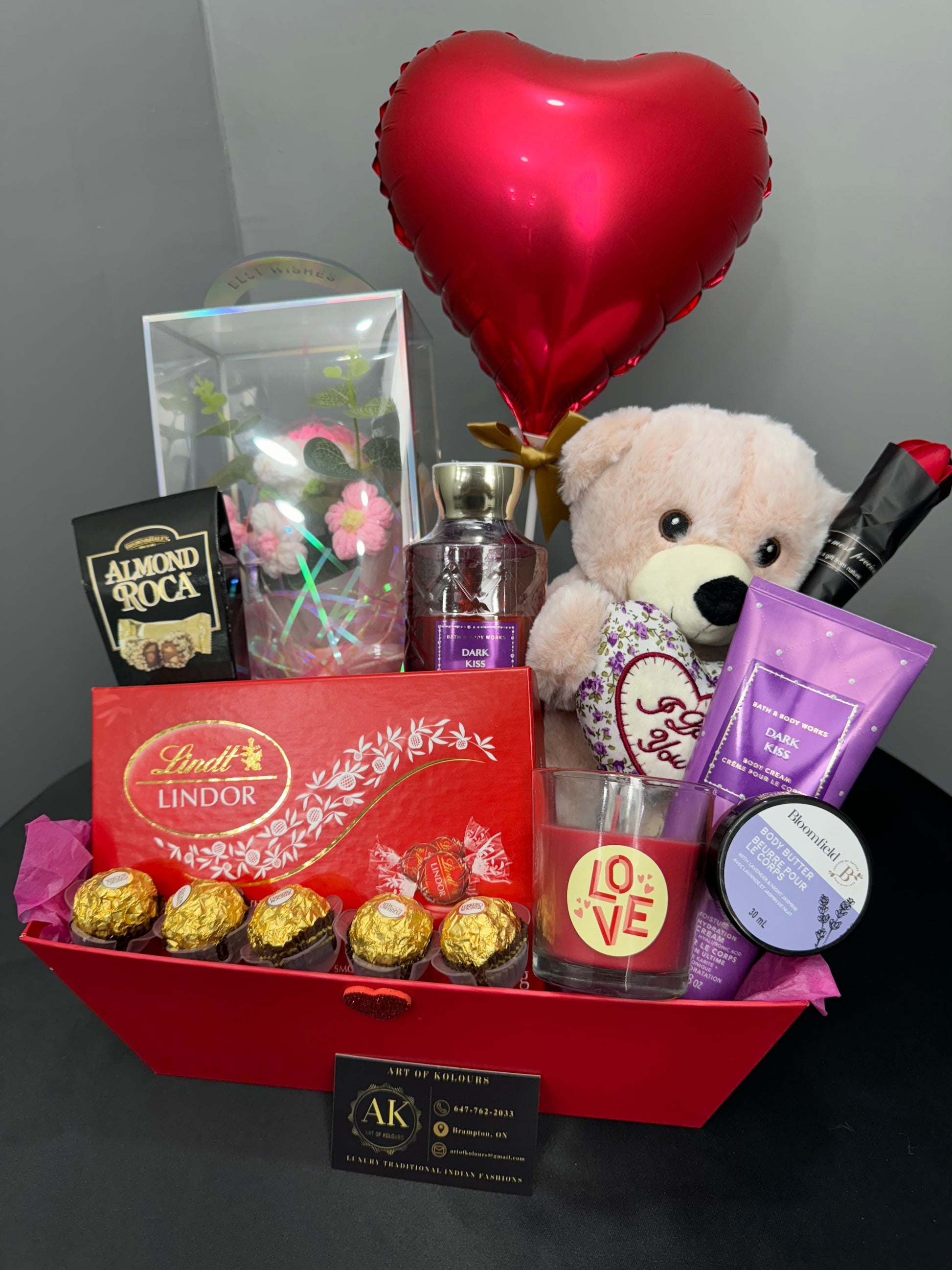 Indulge your loved one with My Darling - a luxurious gift set that includes a Gemstone I love you Teddy Bear, fragrant Dark Kiss body products from Bath and Body Works, a 120g Lindor box, and more. Show them you care with a candle, chocolates, artificial rose, and a heart balloon. Make their day extra special with this thoughtful and elegant gift.