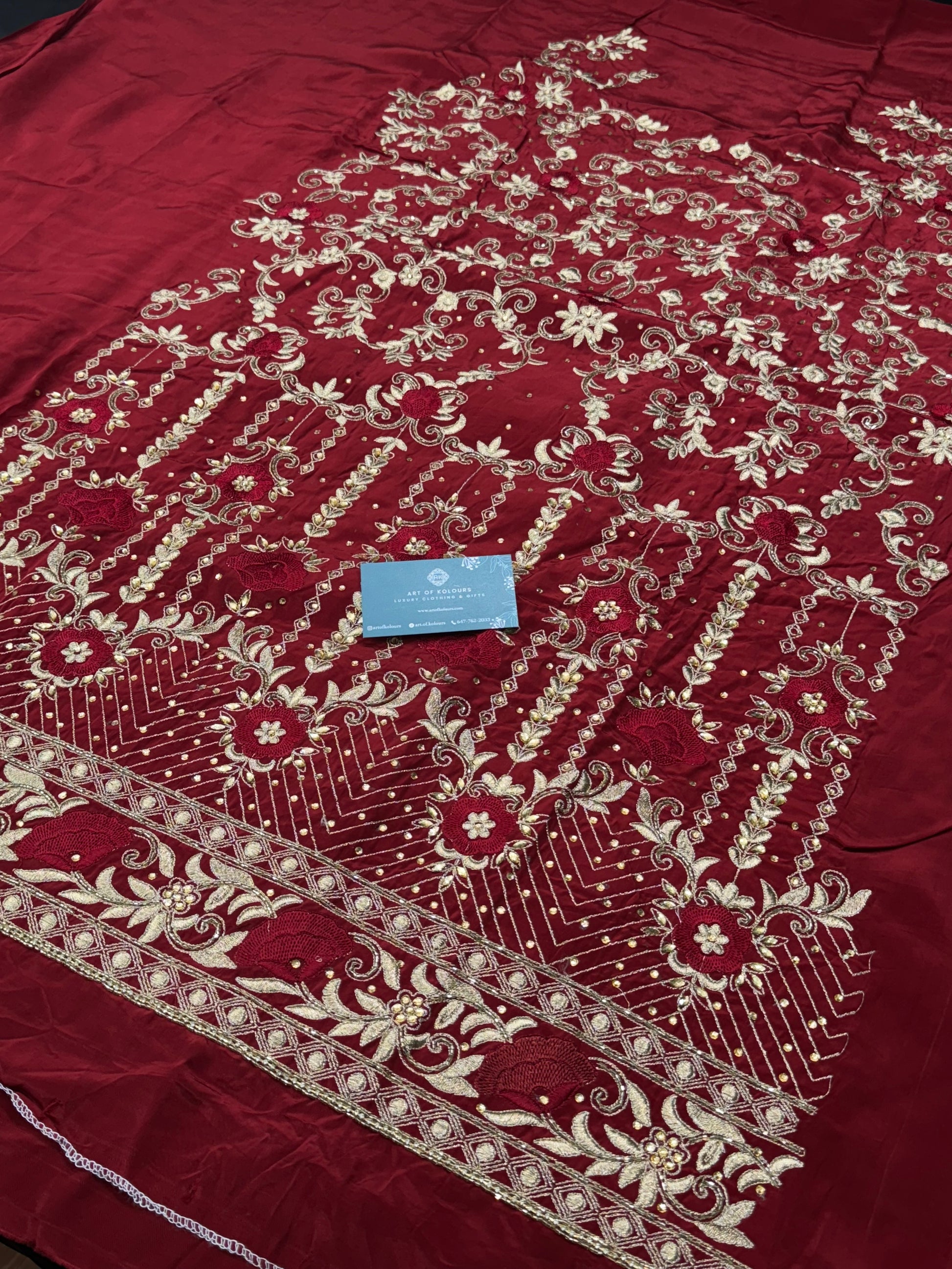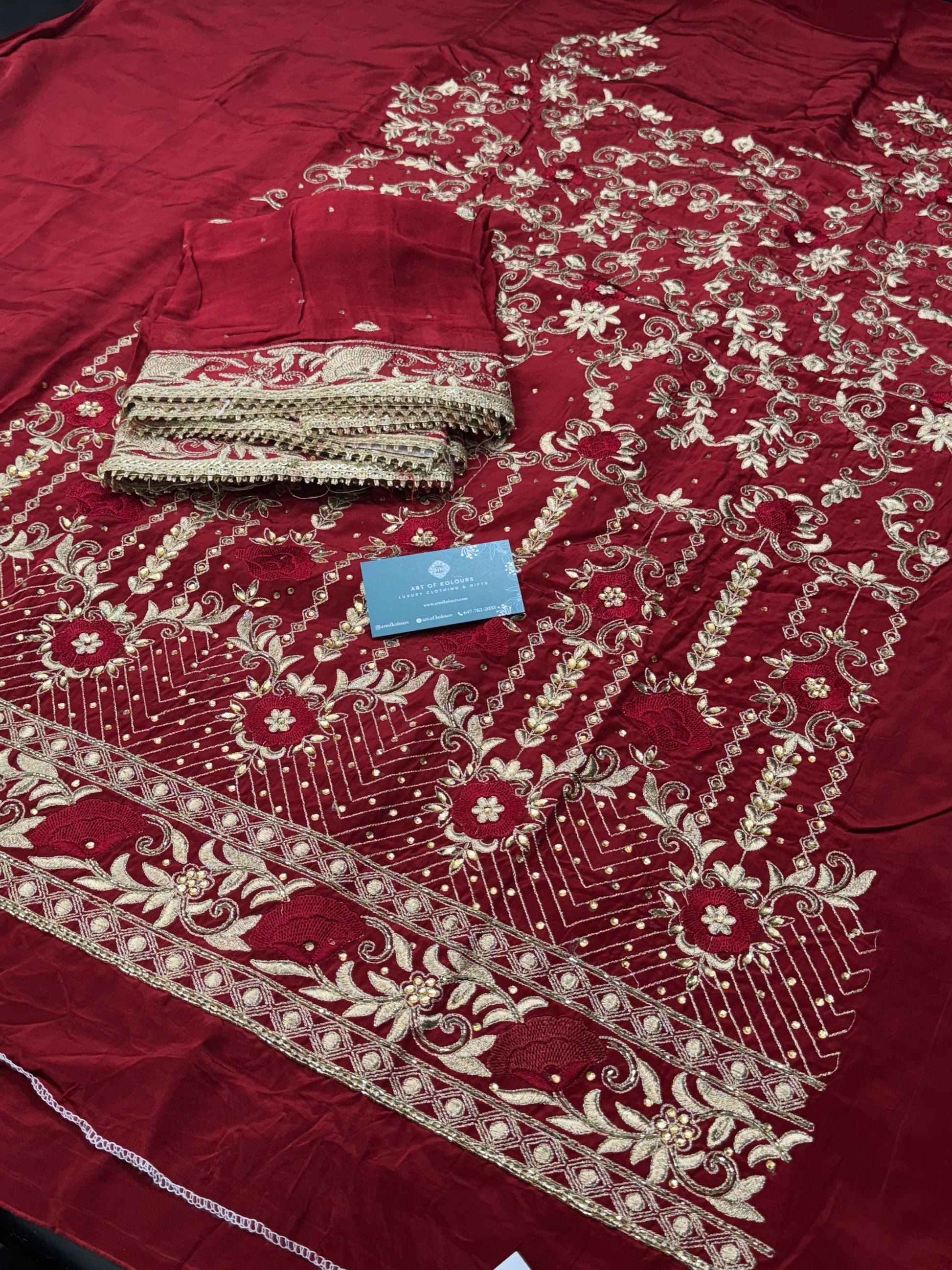 Introducing the premium Nakshi Dastkaar Unstitched Suit, a must-have for any fashion lover. This suit features intricate heavy embroidery on the top, bottom, and on the included dupatta. With its elegant and detailed design, this suit will make you stand out at any event.