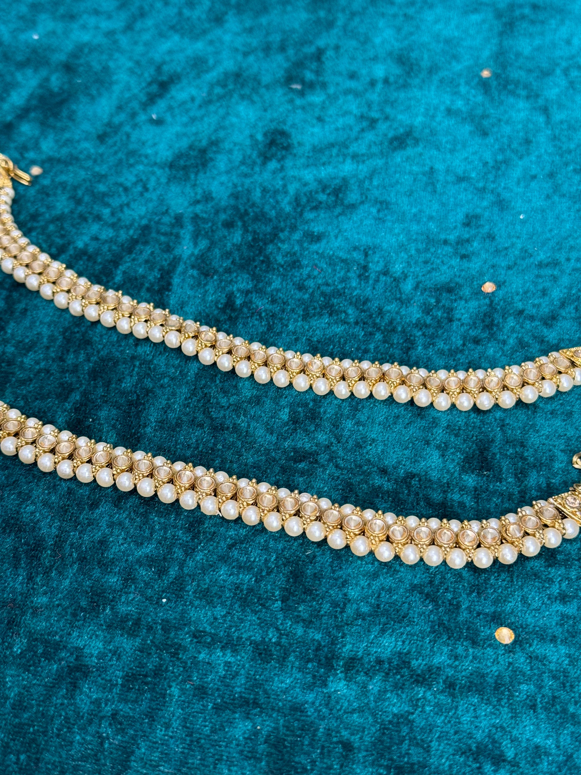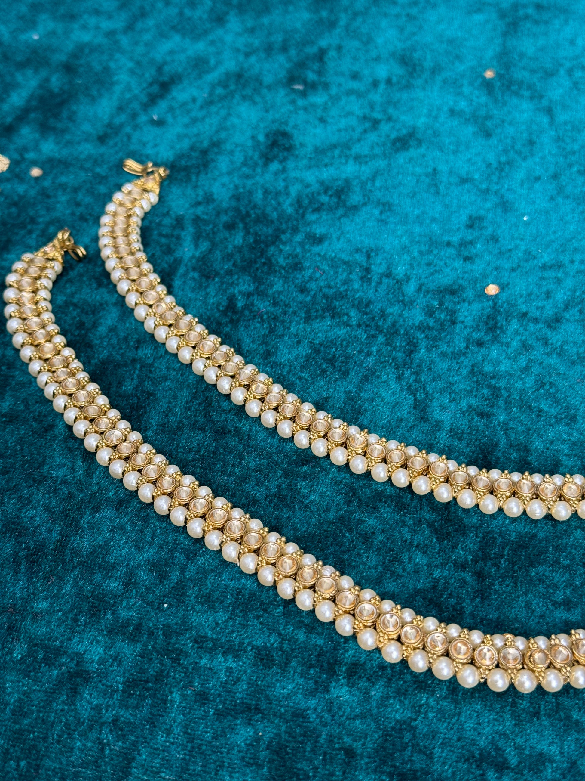 Add rhythm and sparkle to your steps with our exquisite collection of Jhanjhar (traditional anklets). Crafted with intricate detailing and adorned with shimmering embellishments, these anklets create a melodious jingling sound with every movement.