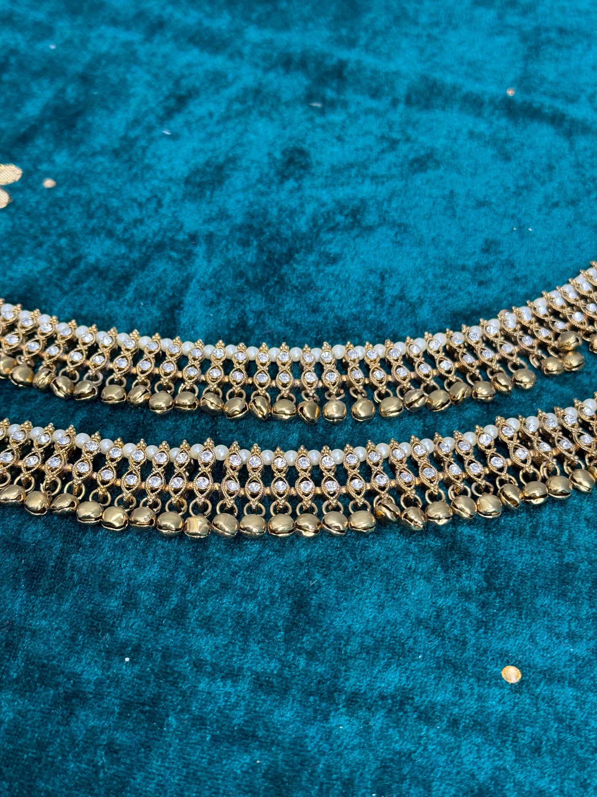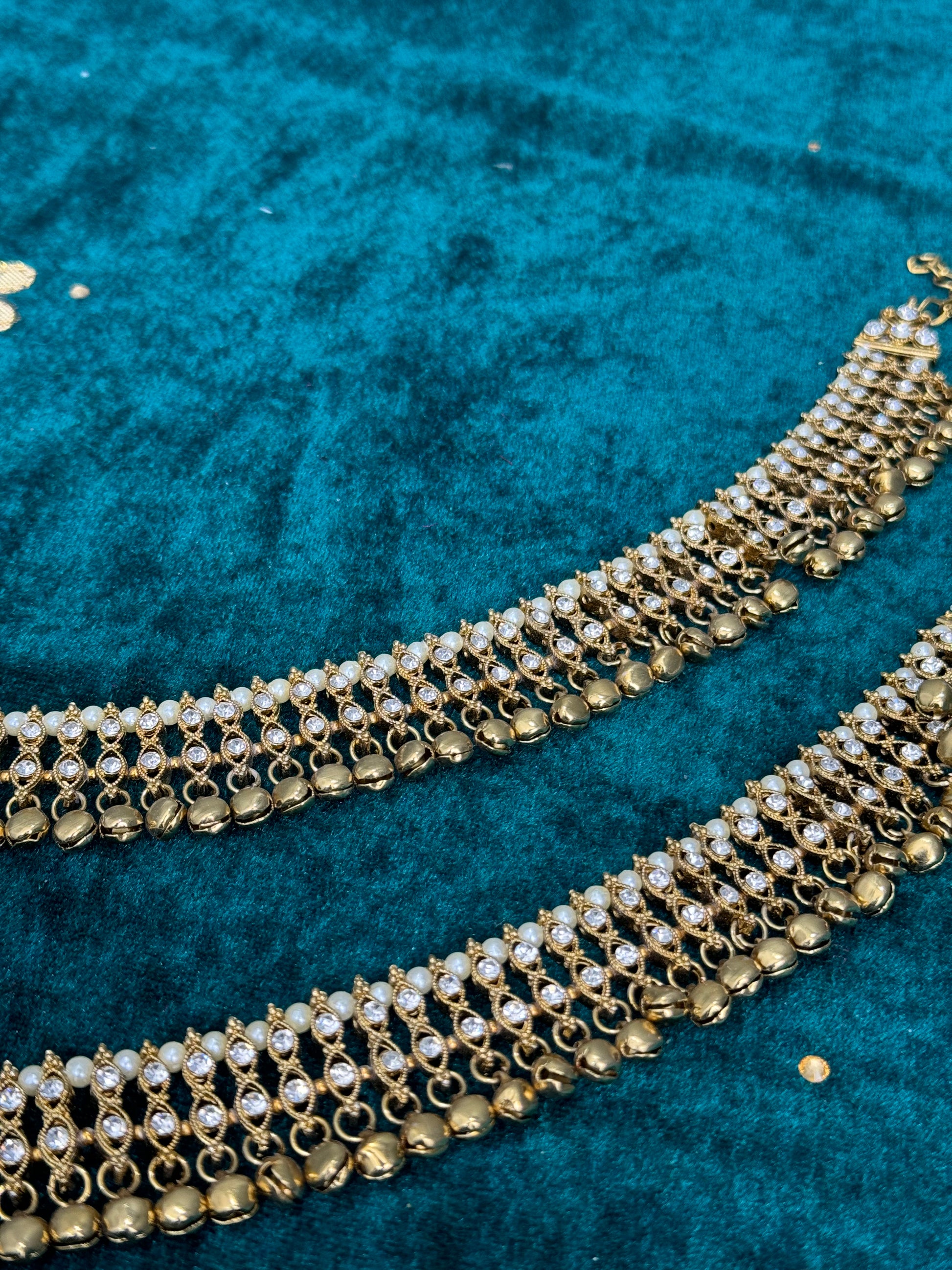 Add rhythm and sparkle to your steps with our exquisite collection of Jhanjhar (traditional anklets). Crafted with intricate detailing and adorned with shimmering embellishments, these anklets create a melodious jingling sound with every movement.