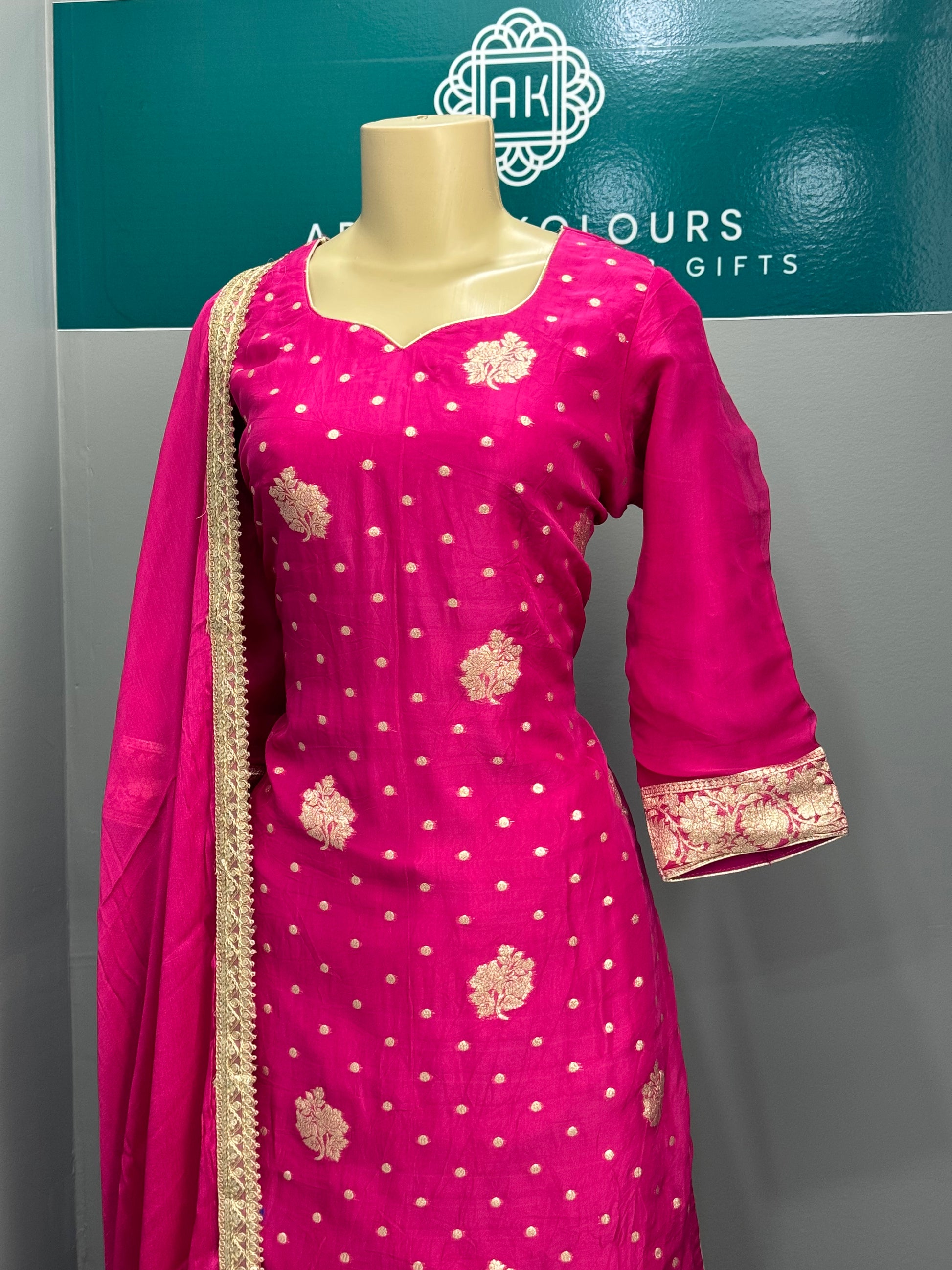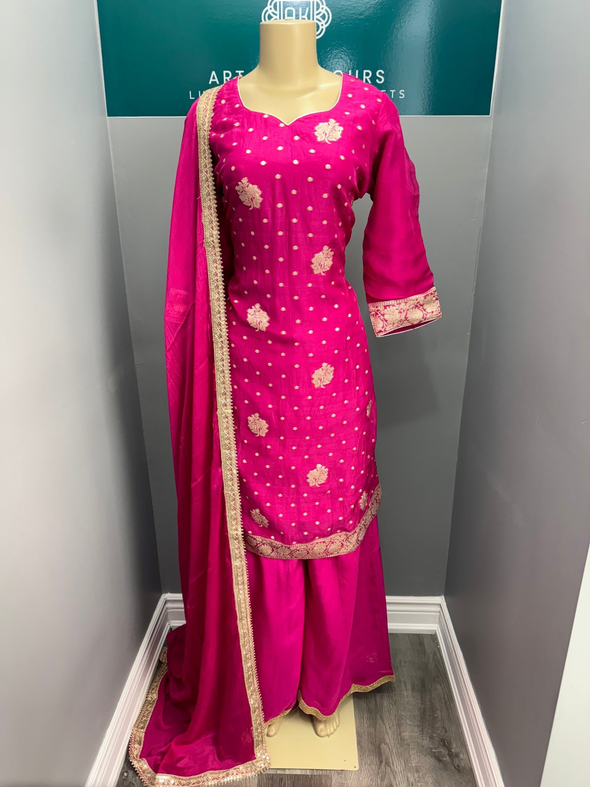 Enhance your style with this beautiful Banarsi Sharara Suit. This stunning suit features gorgeous embroidery and sequences for a touch of elegance. The plain dupatta completes the look. Elevate your wardrobe with this must-have piece.