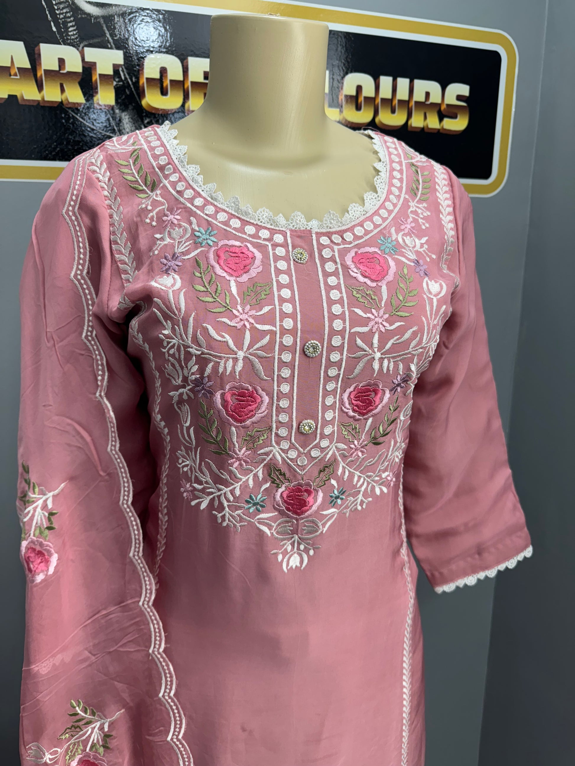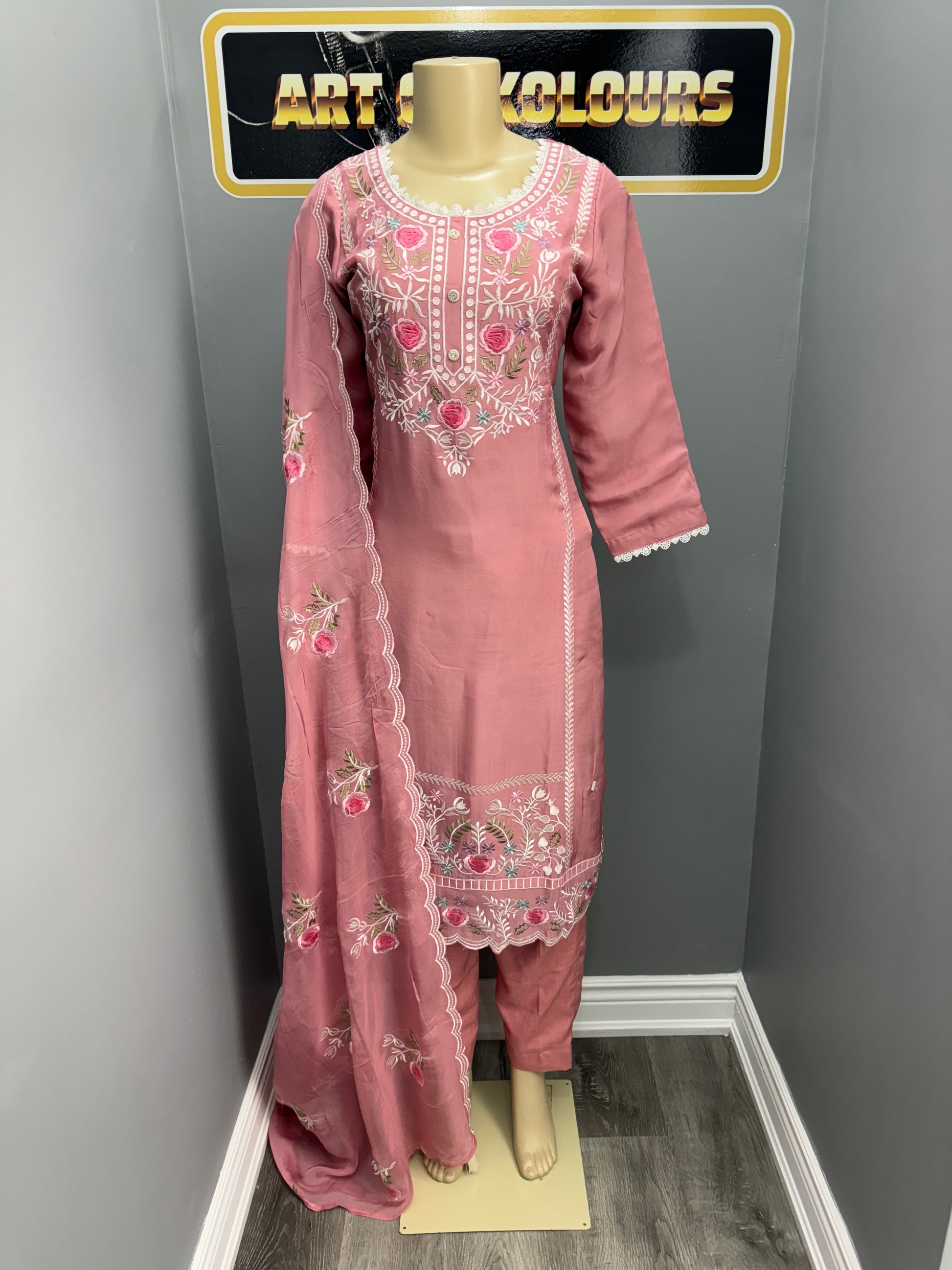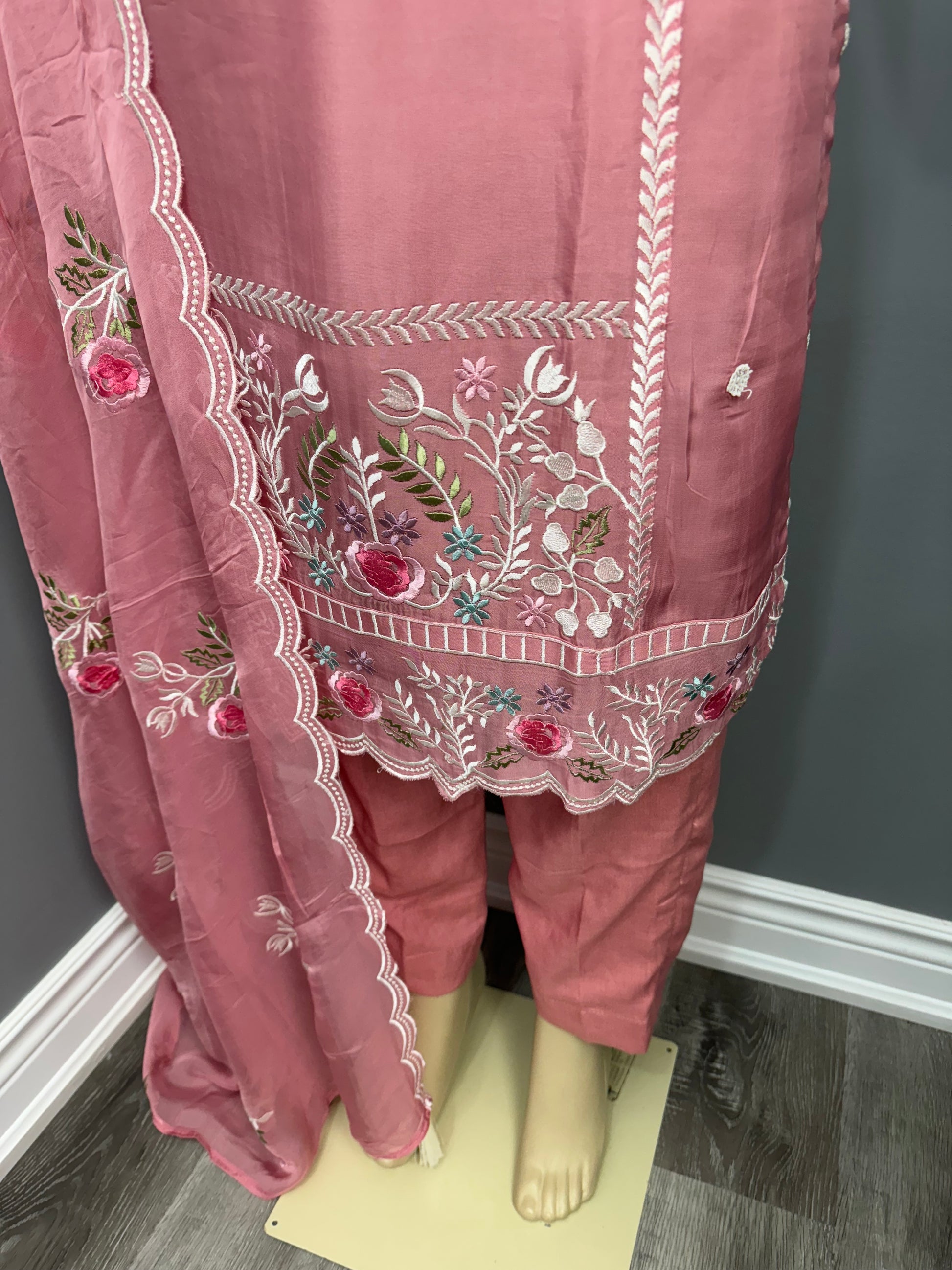 This elegant Phullaz Thaga Pent Suit is crafted from pure organza, adorned with intricate thread work. The accompanying dupatta also features delicate thread work, adding to the suit's luxurious appeal. Perfect for formal occasions, this suit will make you stand out with its impeccable craftsmanship.