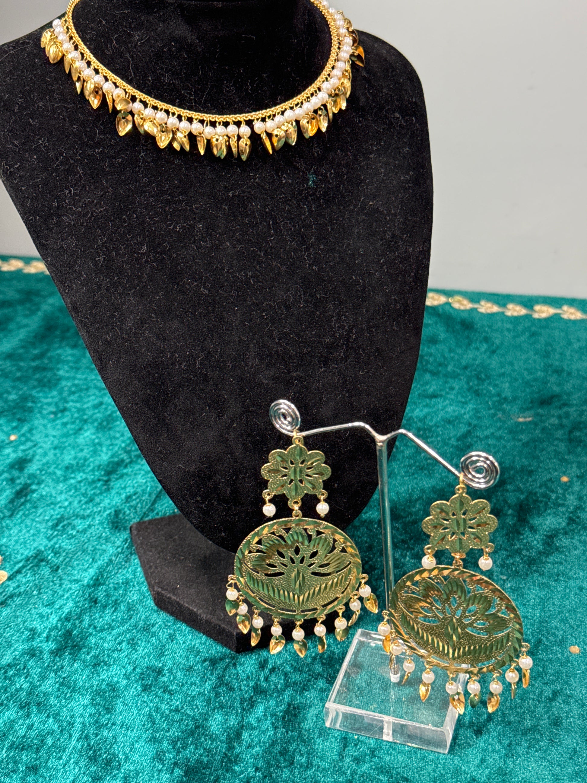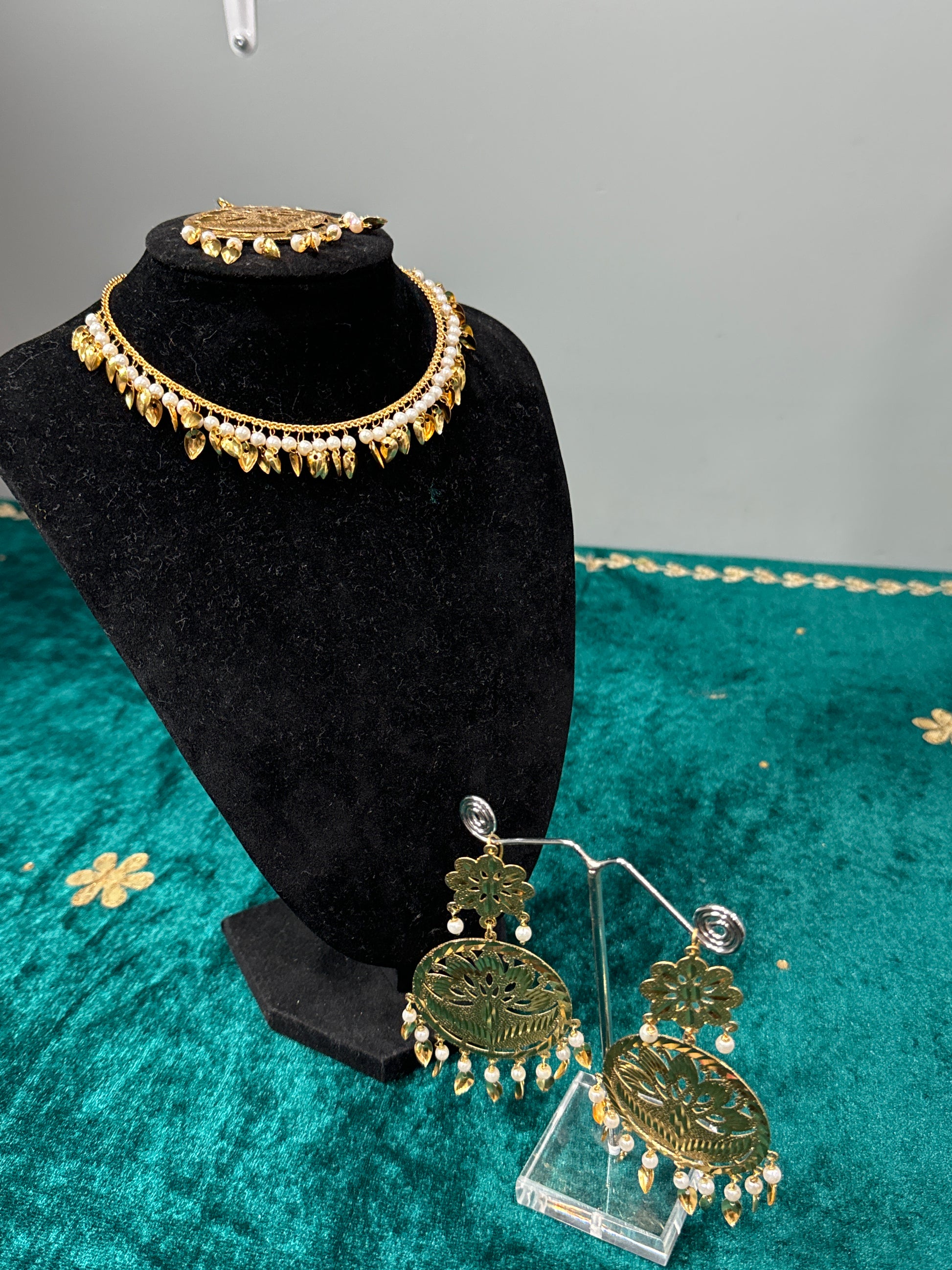 This elegant Necklace set will add a touch of glamour to any outfit. The intricate designs of the necklace, tikka and earrings will make you stand out in any crowd. Handcrafted with precision, this set is sure to impress.