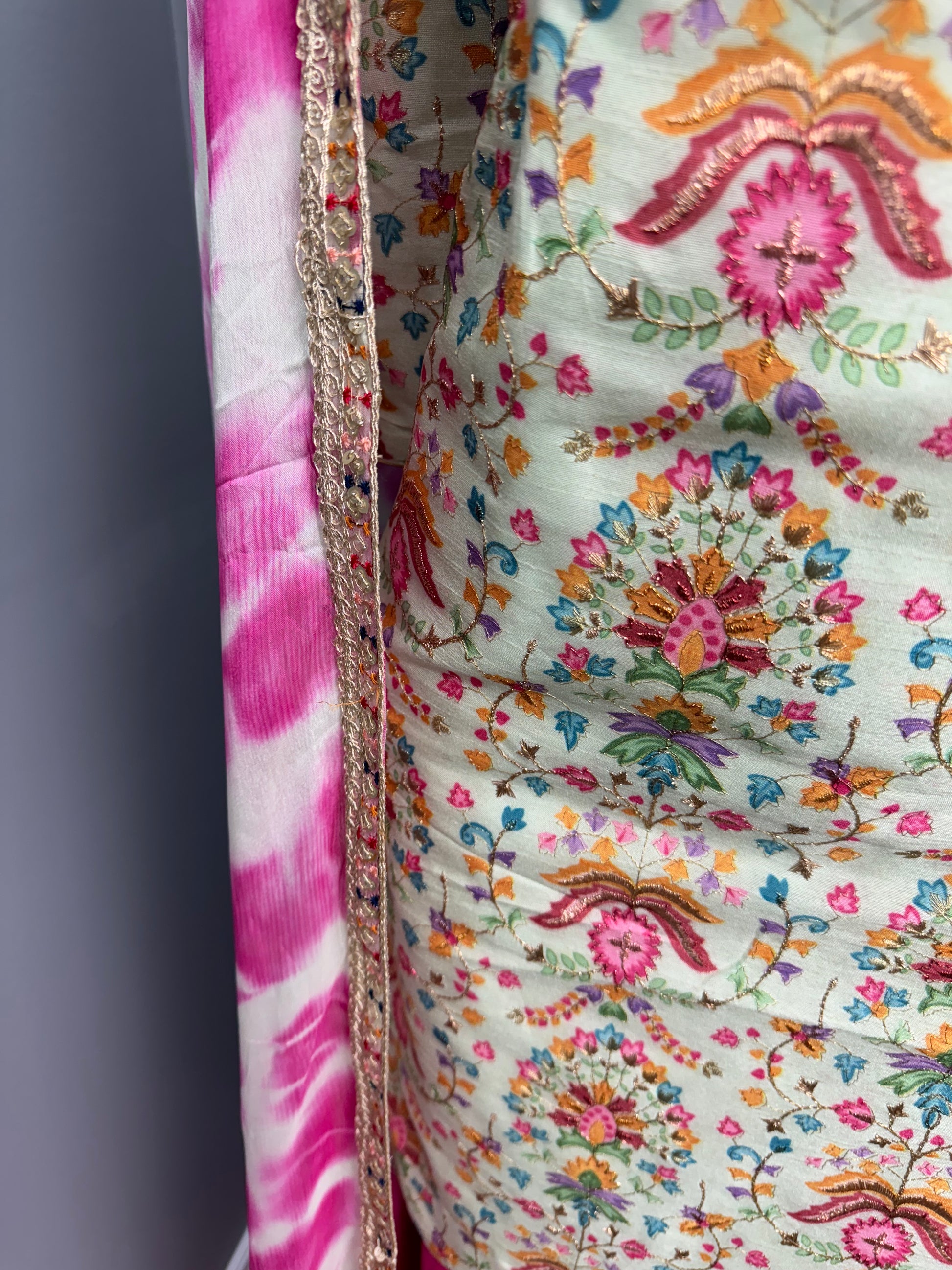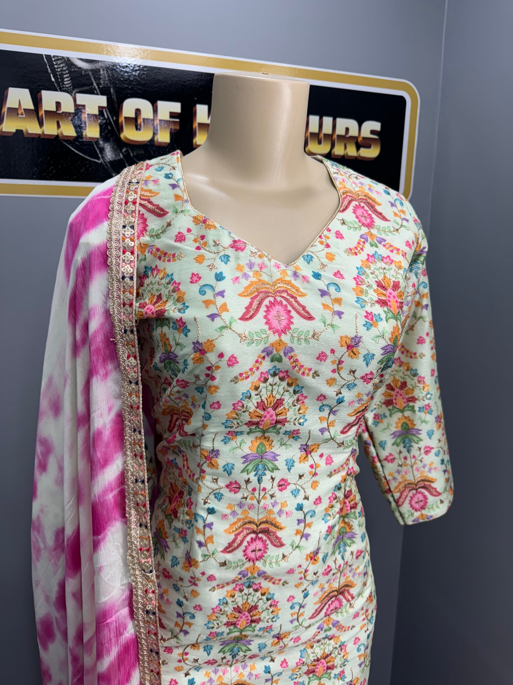This Pista Butter Gulzar Sharara Suit boasts a beautiful print on the shirt, highlighted with intricate embroidered work. Crafted with care and attention to detail, this suit is sure to elevate any occasion. The perfect blend of traditional and modern design, it will make you stand out with elegance and grace.