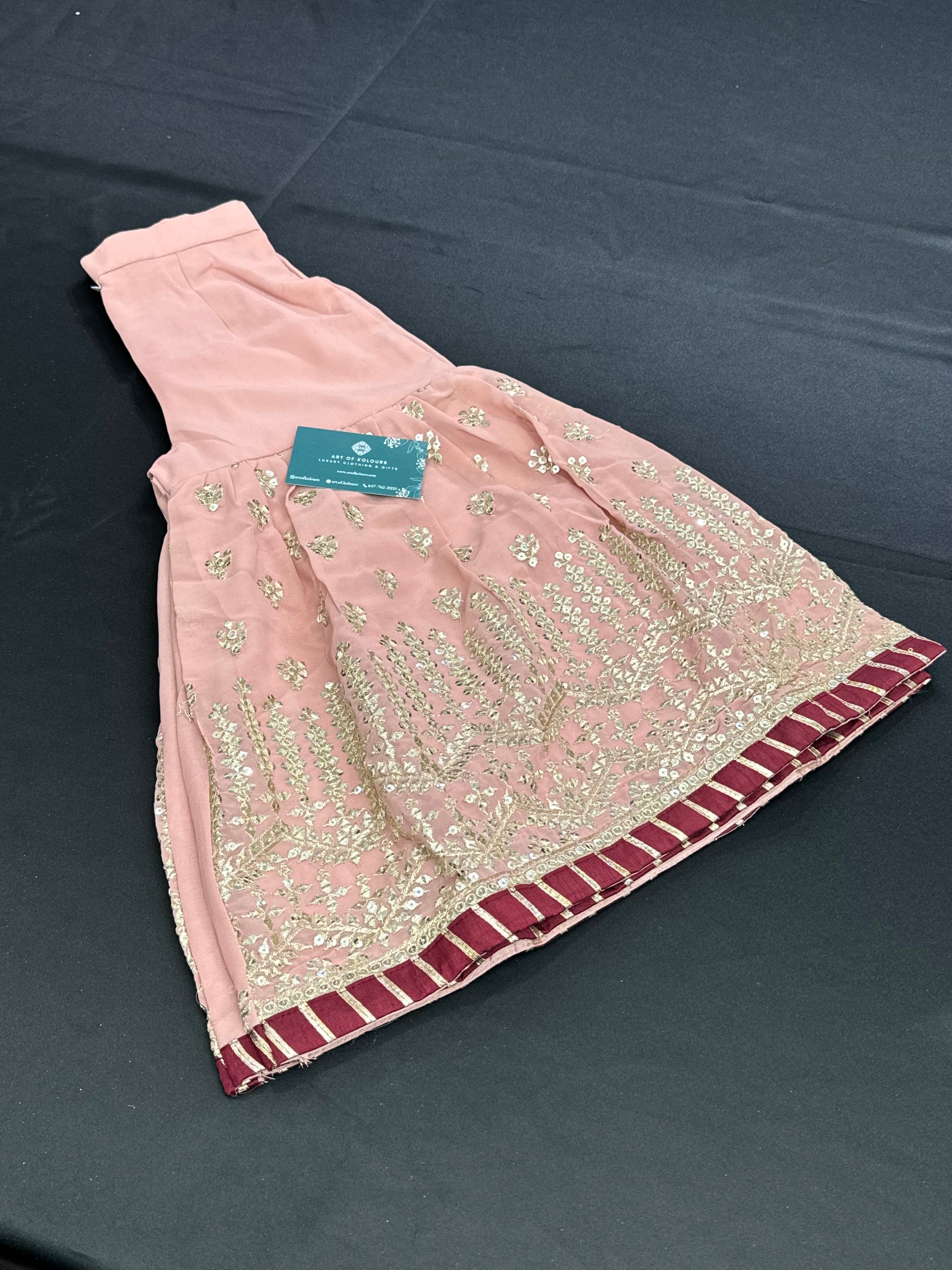 This beautiful handwork kids Gharara suit in wine with peach contrast Gharara and dupatta is a must-have for any special occasion. The intricate handwork adds a touch of elegance, while the contrasting colors make it stand out. Get this unique outfit for your child and make them feel like a princess.