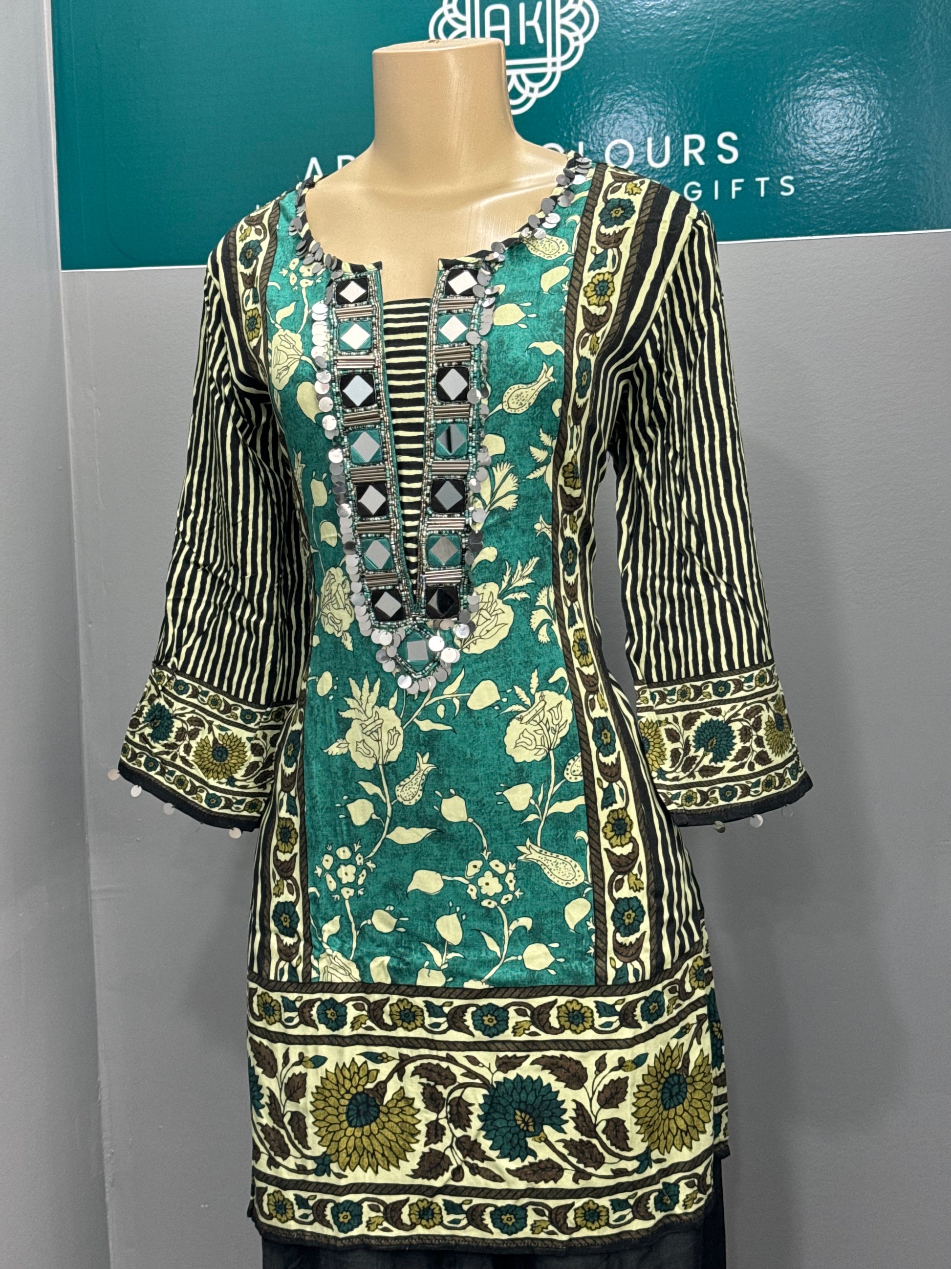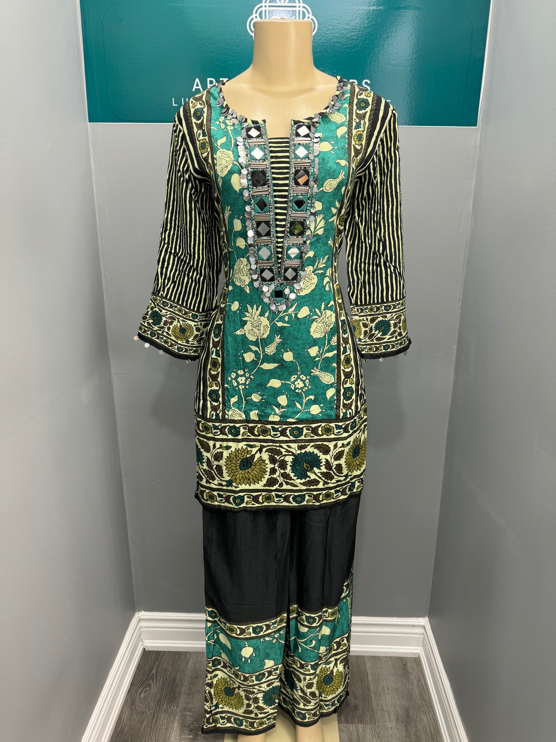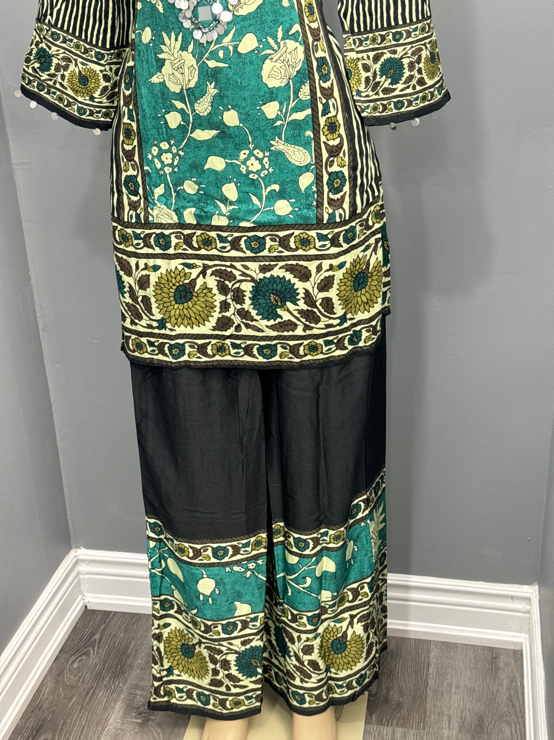 This Cord Set is expertly crafted with beautiful printed fabric and mirror work, creating a truly beautiful and elegant garment. Made with the highest quality materials, it is both comfortable and stylish. Perfect for any semi formal occasion, this cord set is sure to make you stand out in a crowd.