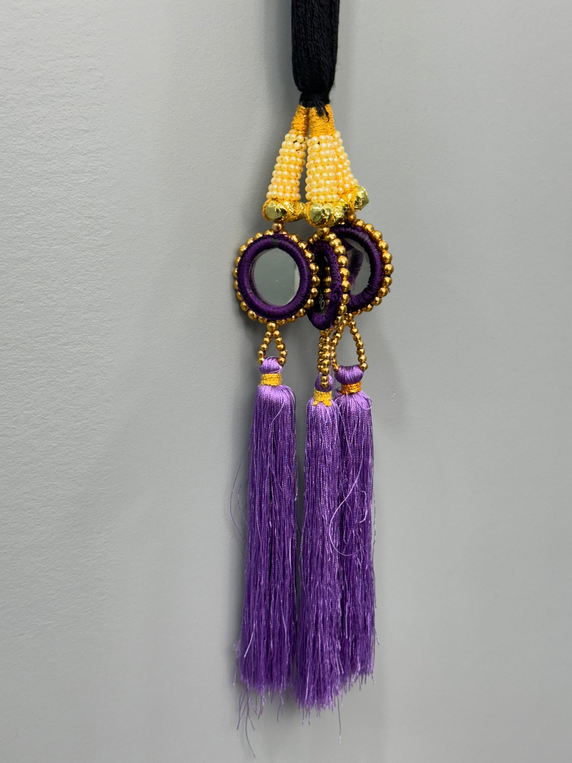 The Parandi is a traditional accessory often used in Punjabi culture to adorn braids. The double-layer design adds a rich and intricate aesthetic, with purple thread complementing the opulence of gold embellishments. It’s typically crafted for festive occasions, weddings, or cultural events, pairing beautifully with vibrant Punjabi suits or lehengas to enhance the overall look.