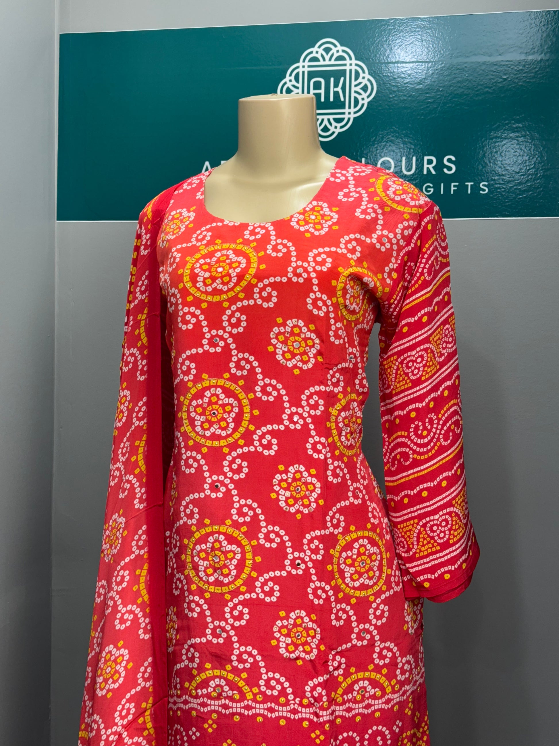 This readymade pant suit is expertly crafted with beautiful bandhani print, creating a truly beautiful and elegant garment. With a beautiful printet dupatta to go along! Made with the highest quality materials, it is both comfortable and stylish. Perfect for any semi formal occasion, this suit is sure to make you stand out in a crowd.
