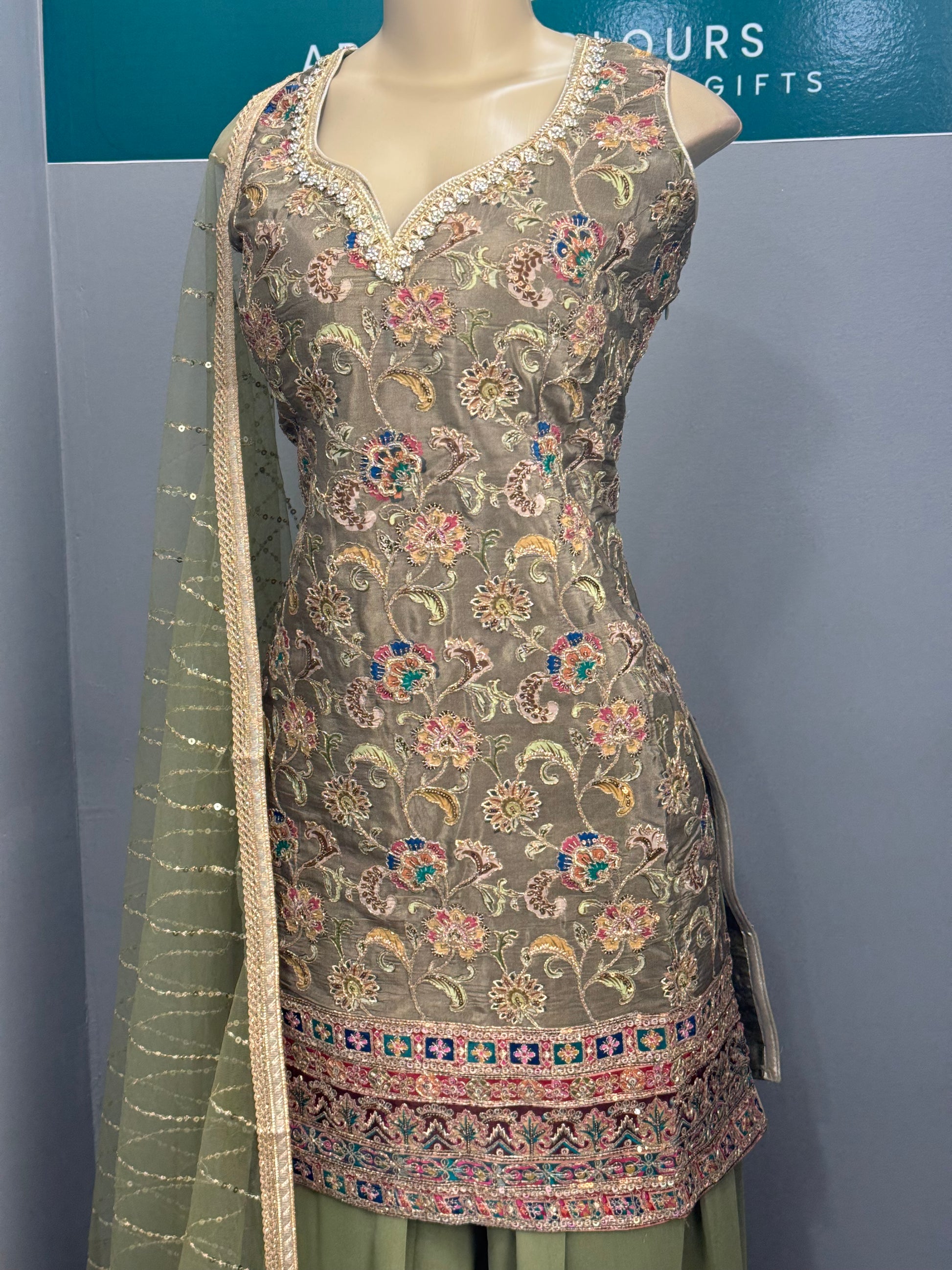 This Sharara Suit is expertly crafted with beautiful position work, creating a truly beautiful and elegant garment. Made with the highest quality materials, it is both comfortable and stylish. Perfect for any occasion, this suit is sure to make you stand out in a crowd.