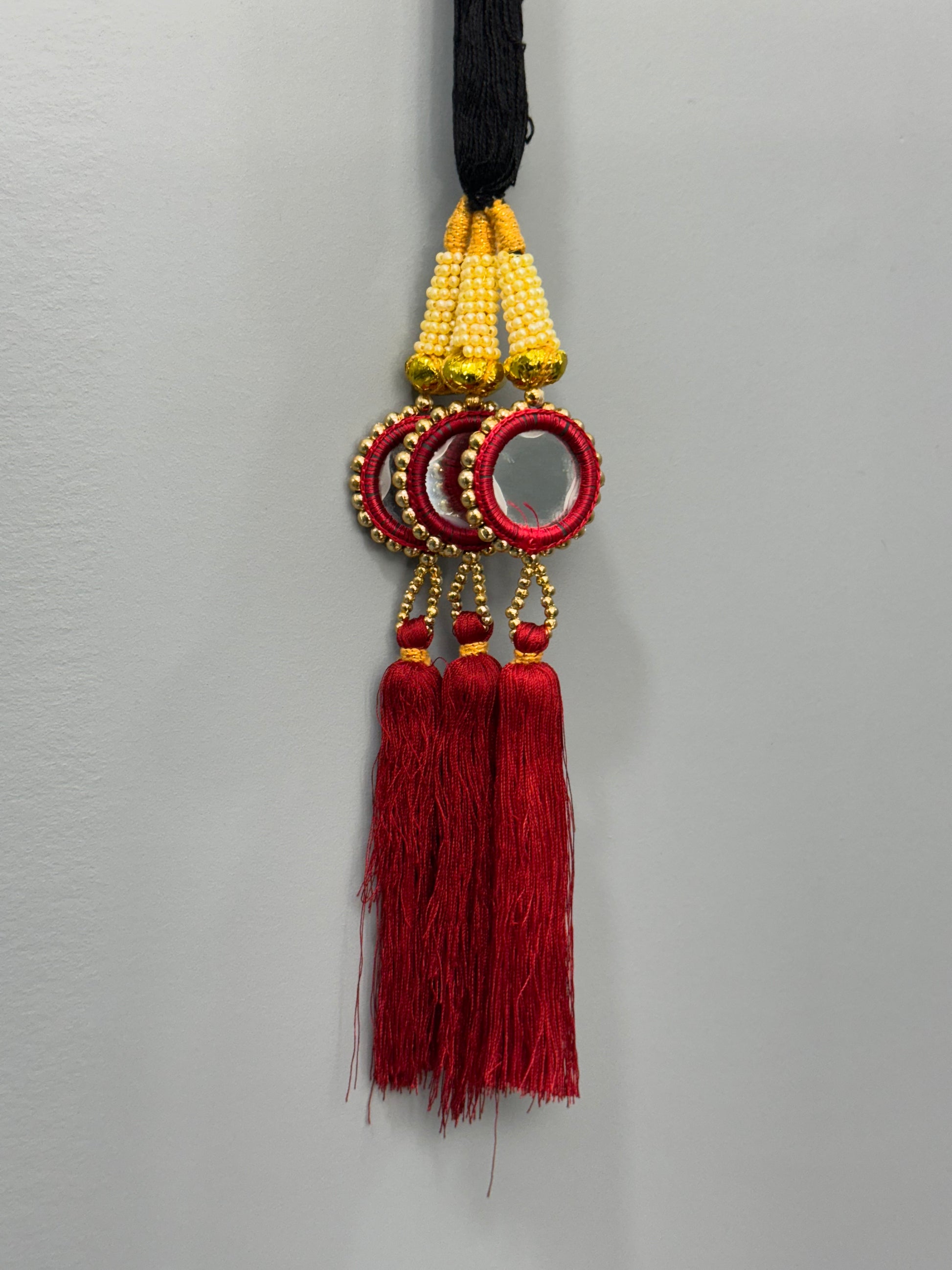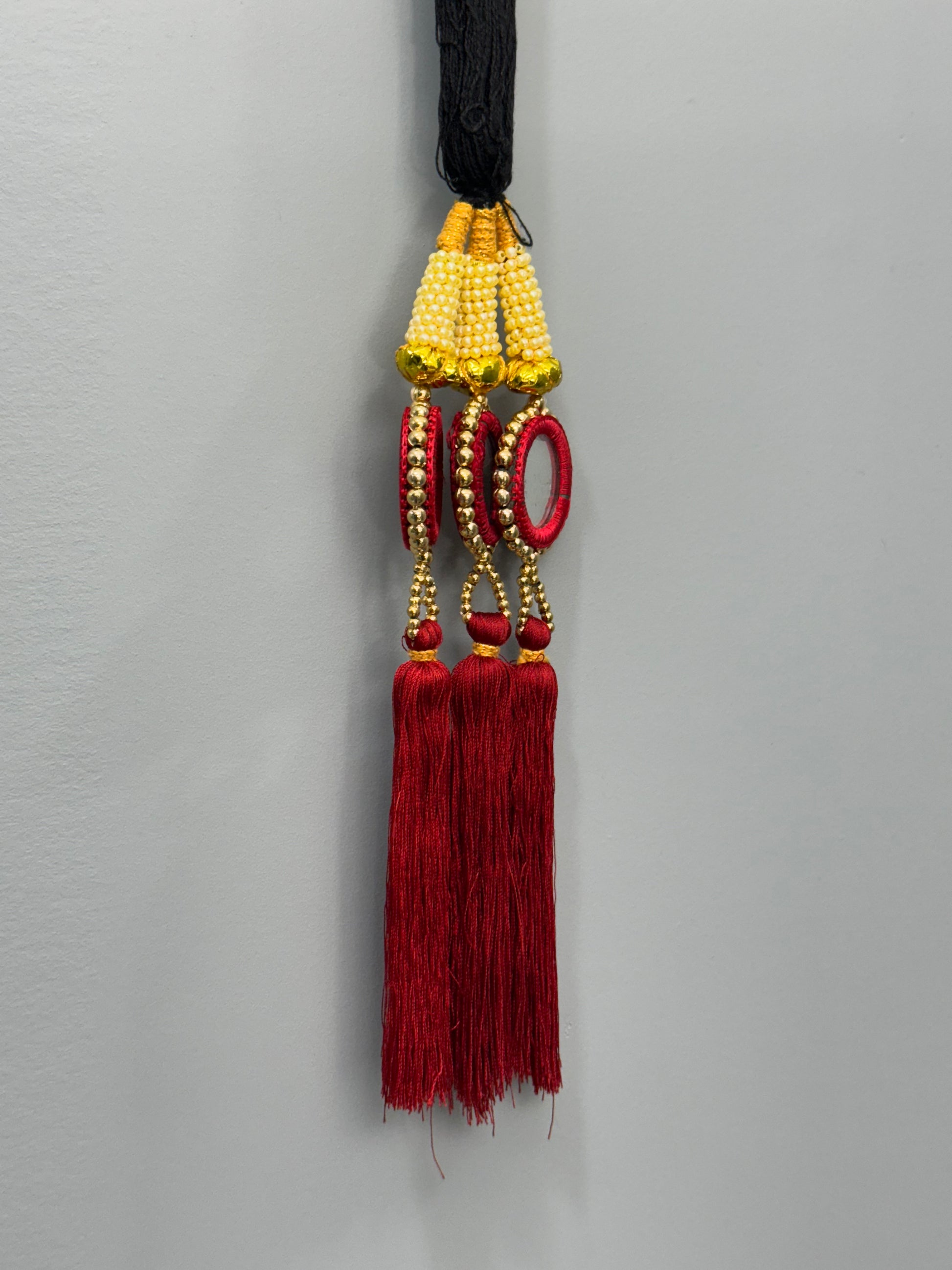 The Parandi is a traditional accessory often used in Punjabi culture to adorn braids. The double-layer design adds a rich and intricate aesthetic, with purple thread complementing the opulence of gold embellishments. It’s typically crafted for festive occasions, weddings, or cultural events, pairing beautifully with vibrant Punjabi suits or lehengas to enhance the overall look.