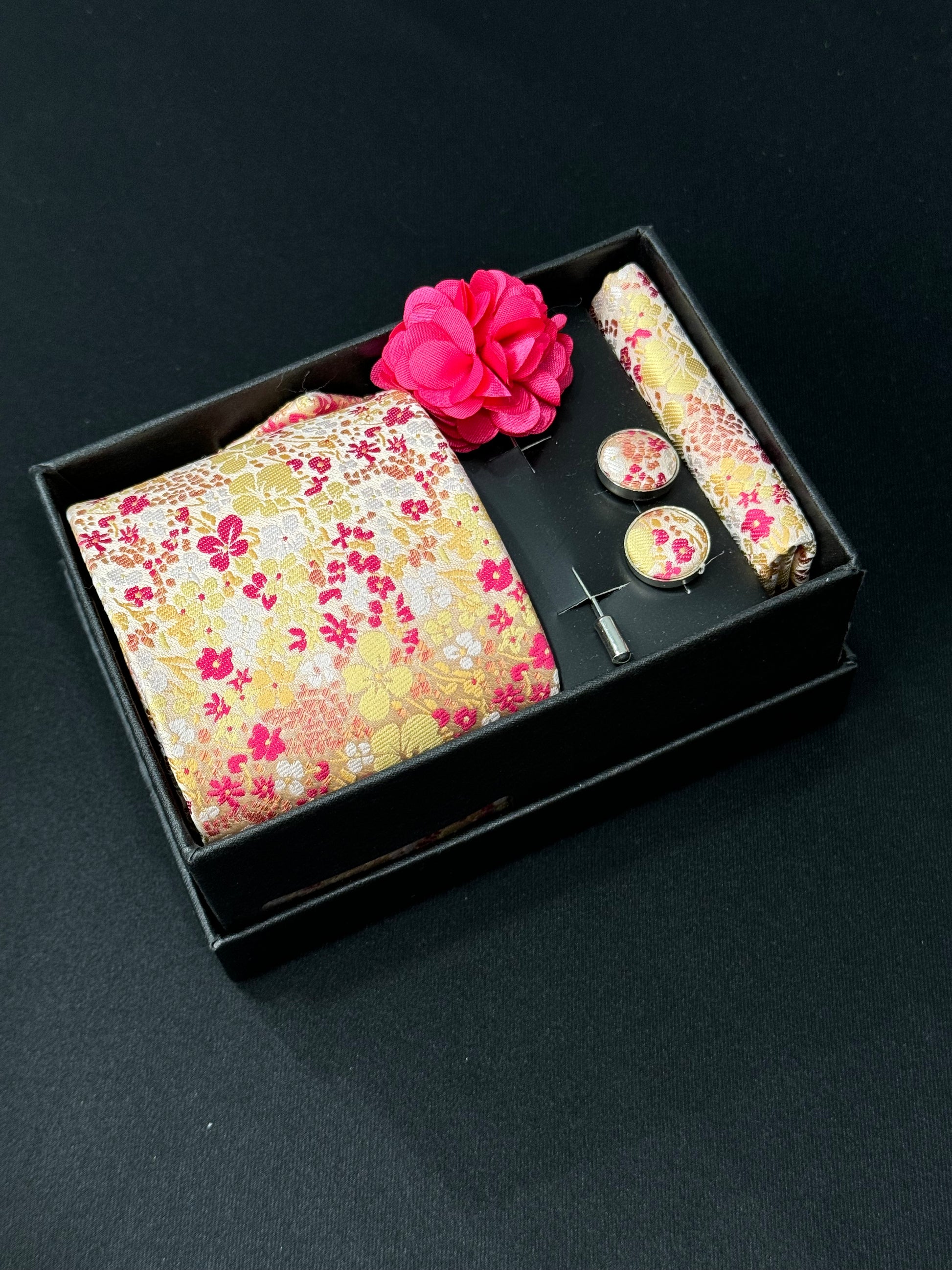 Increase sophistication with The Royal Wrap essential tie set for every man. Includes tie, pocket square, cuff links, and lapel pin for a complete, polished look. Elevate your style with confidence and ease.