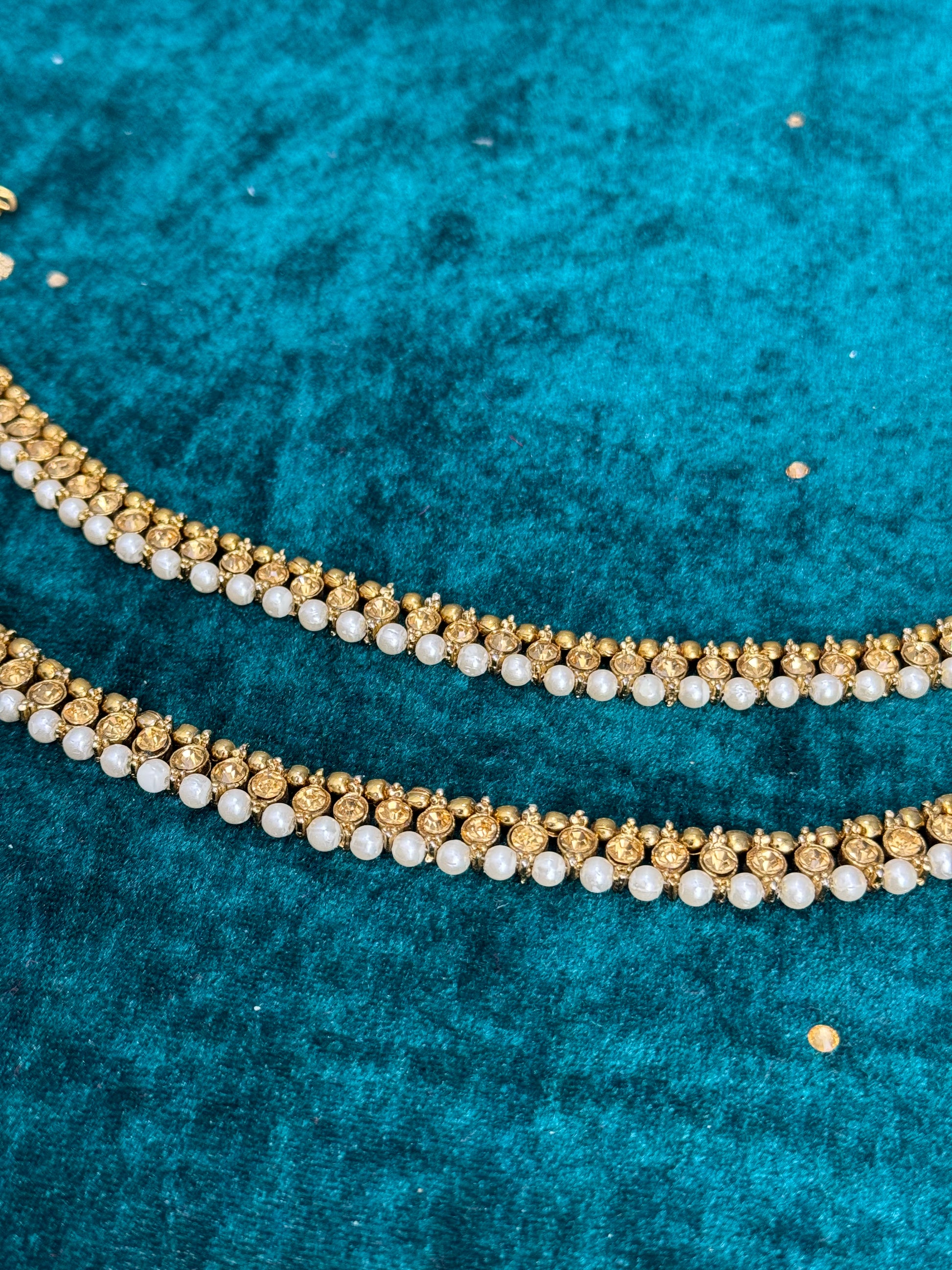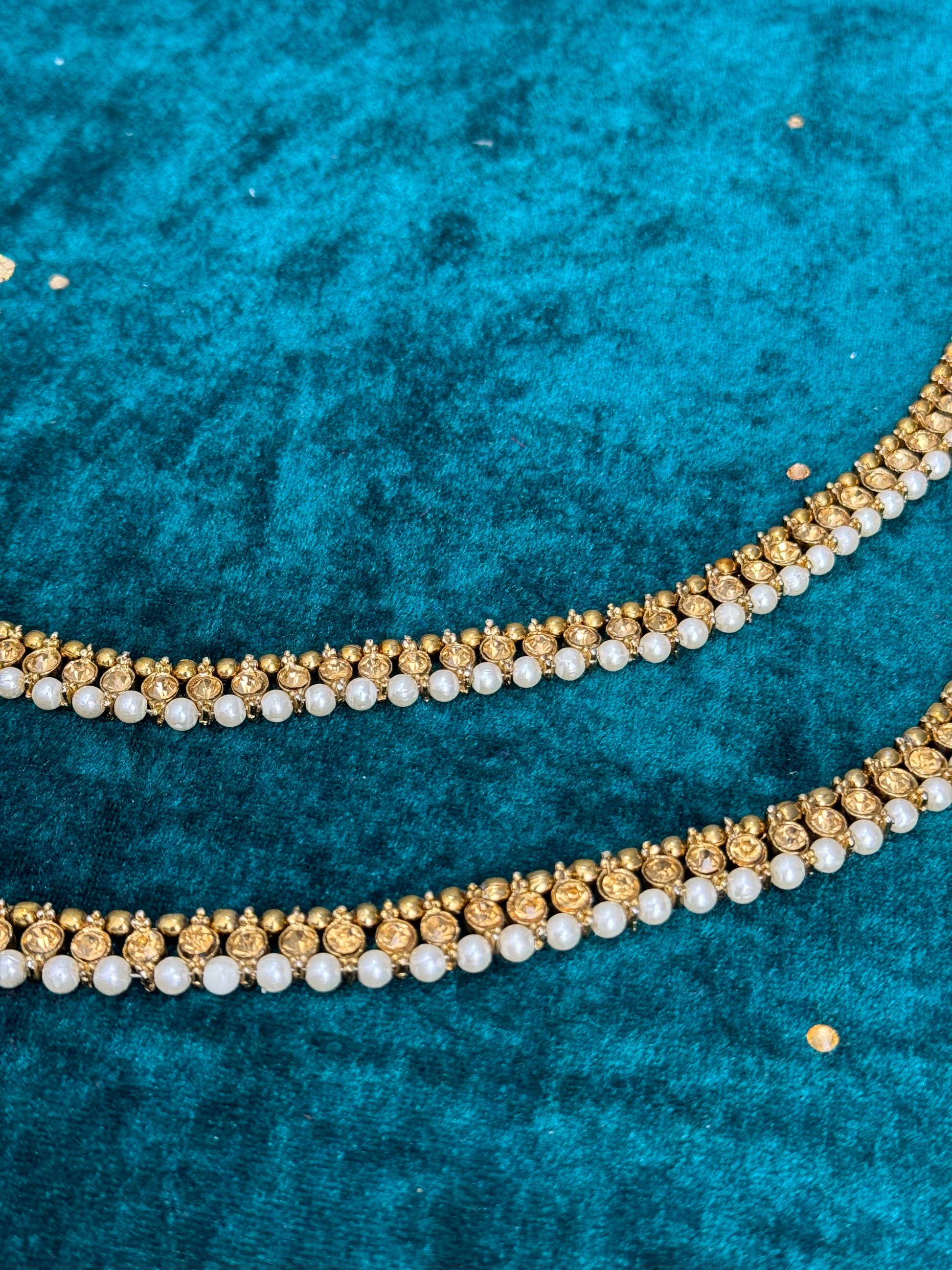 Add rhythm and sparkle to your steps with our exquisite collection of Jhanjhar (traditional anklets). Crafted with intricate detailing and adorned with shimmering embellishments, these anklets create a melodious jingling sound with every movement.