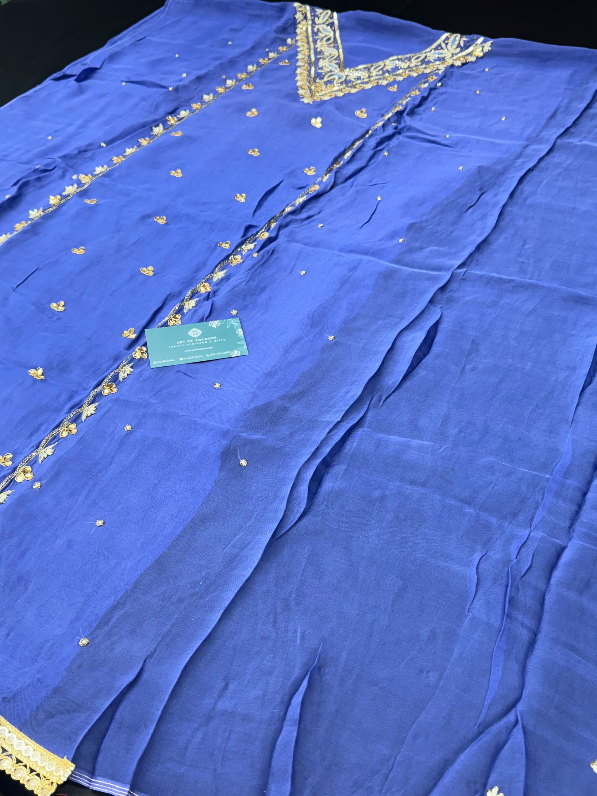 Experience luxury with the Neel Jagza Unstitched Suit. This exquisite blue suit features intricate gold embroidery and red floral accents, all handmade for a stunning touch. Complete your look with the elegant dupatta, making it perfect for any occasion. Elevate your wardrobe with this beautiful and timeless suit.