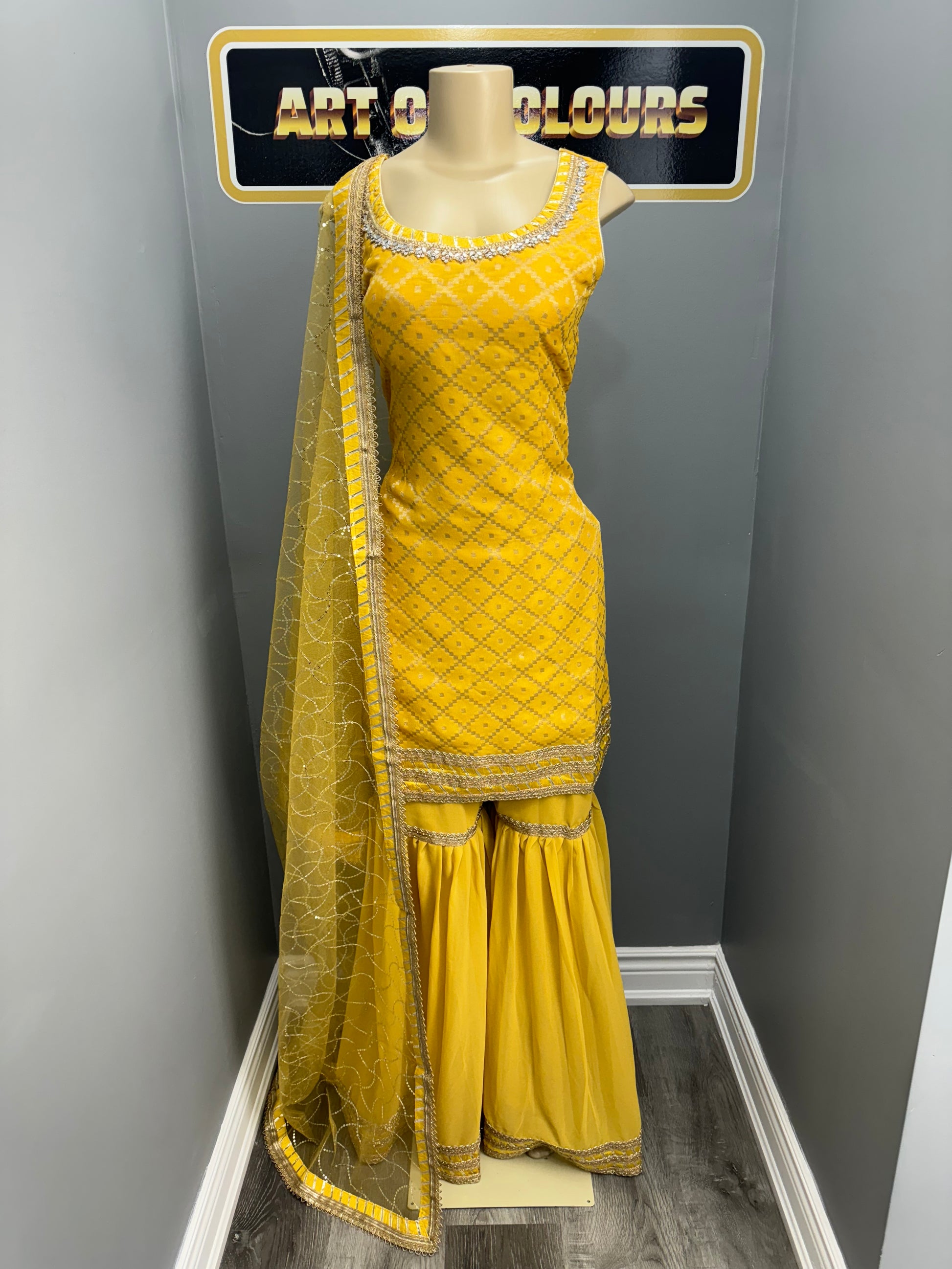 This Shabnam Gharara Suit is expertly crafted with beautiful Banarsi work, creating a truly beautiful and elegant garment. Made with the highest quality materials, it is both comfortable and stylish. Perfect for any occasion, this suit is sure to make you stand out in a crowd.