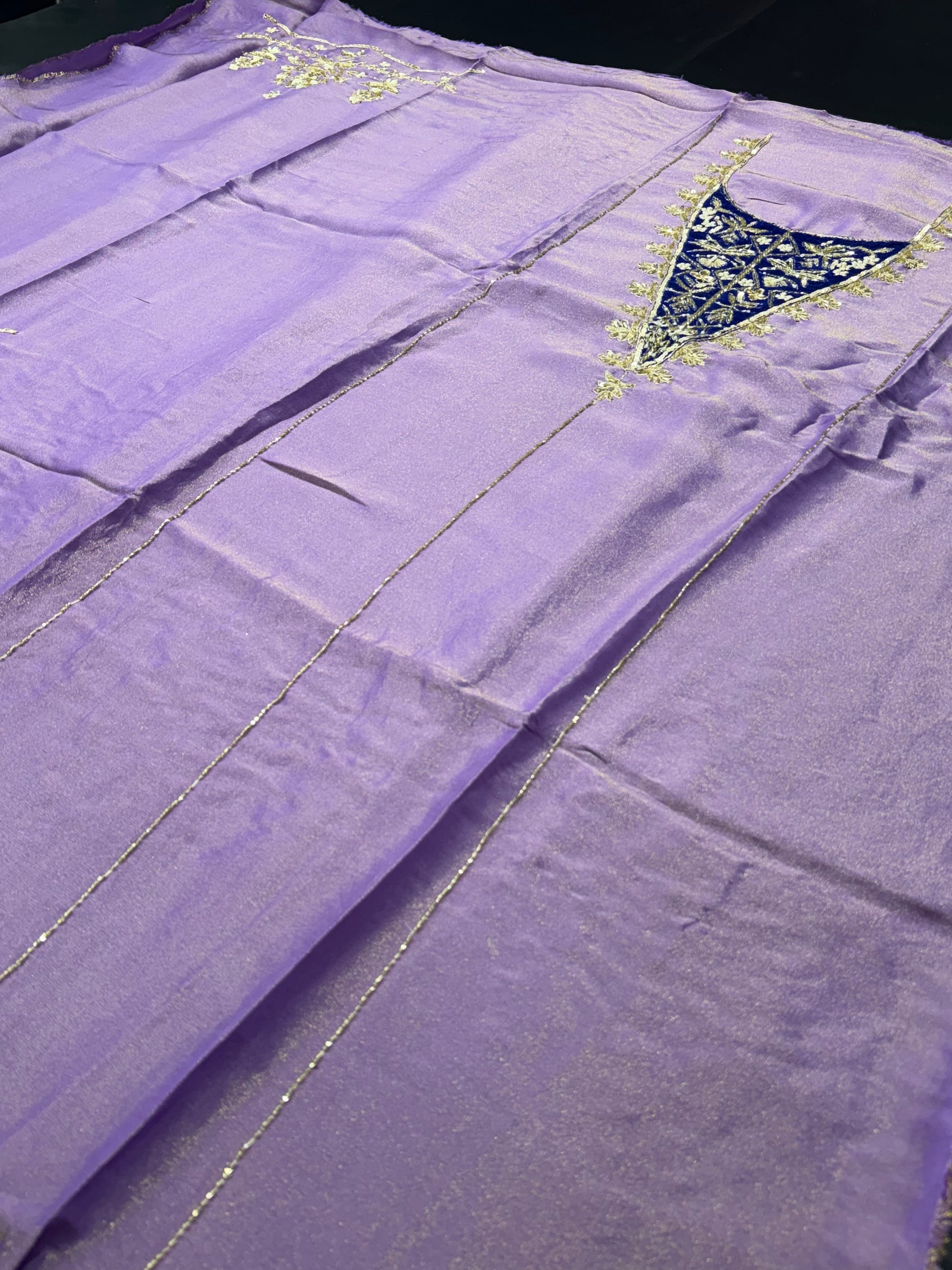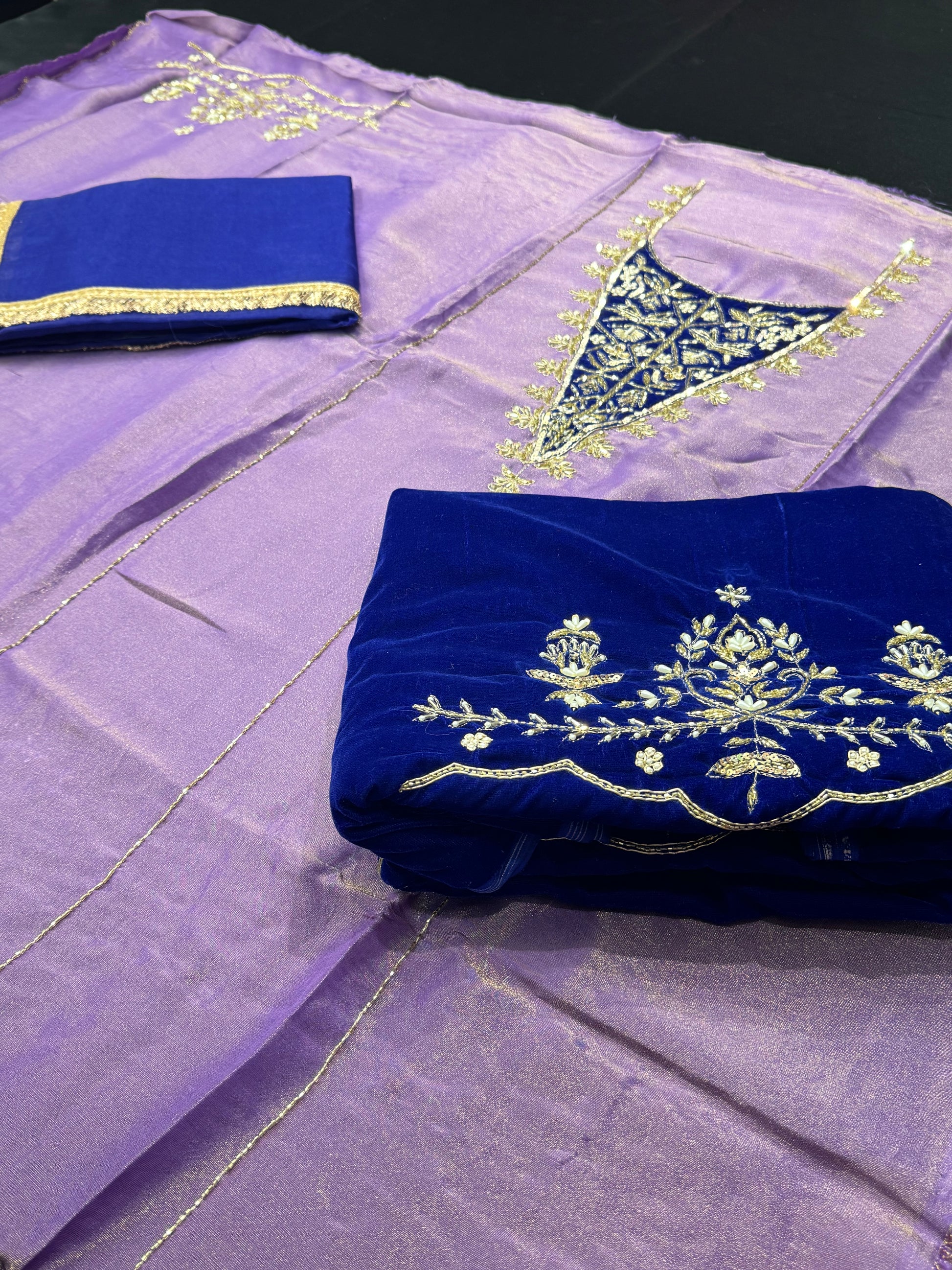 This stunning Shimmer and Velvet Unstitched Suit features a shimmer shirt with handwork and a velvet bottom, also adorned with handwork. The versatile design allows for customization into a salwar, plazo, or pent, available in two elegant color contrasts. Perfect for adding a touch of glamour and luxury to any occasion.
