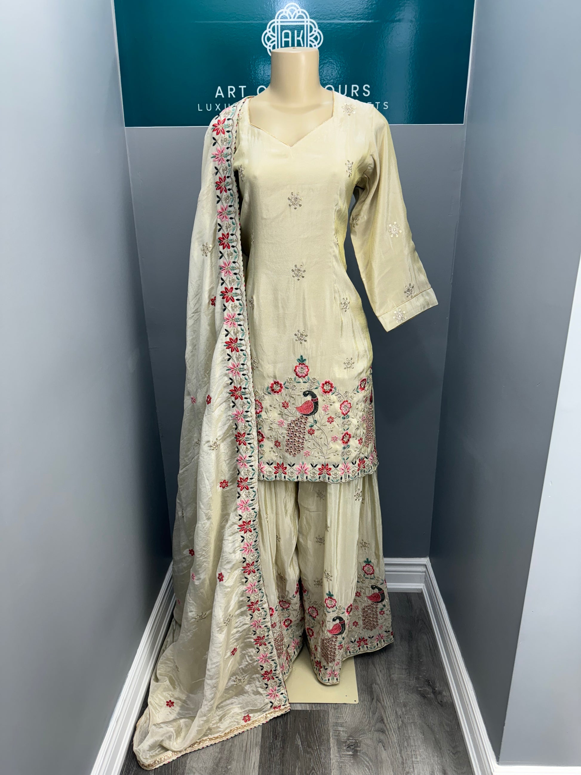 The Shimmer Morni Sharara Suit features beautiful embroidery and fine sequence detailing for an elegant luxurious look. Made from high-quality fabric, it’s comfortable, stylish, and perfect for any festive or special occasion. A timeless outfit that adds charm and beauty to every occasion.
