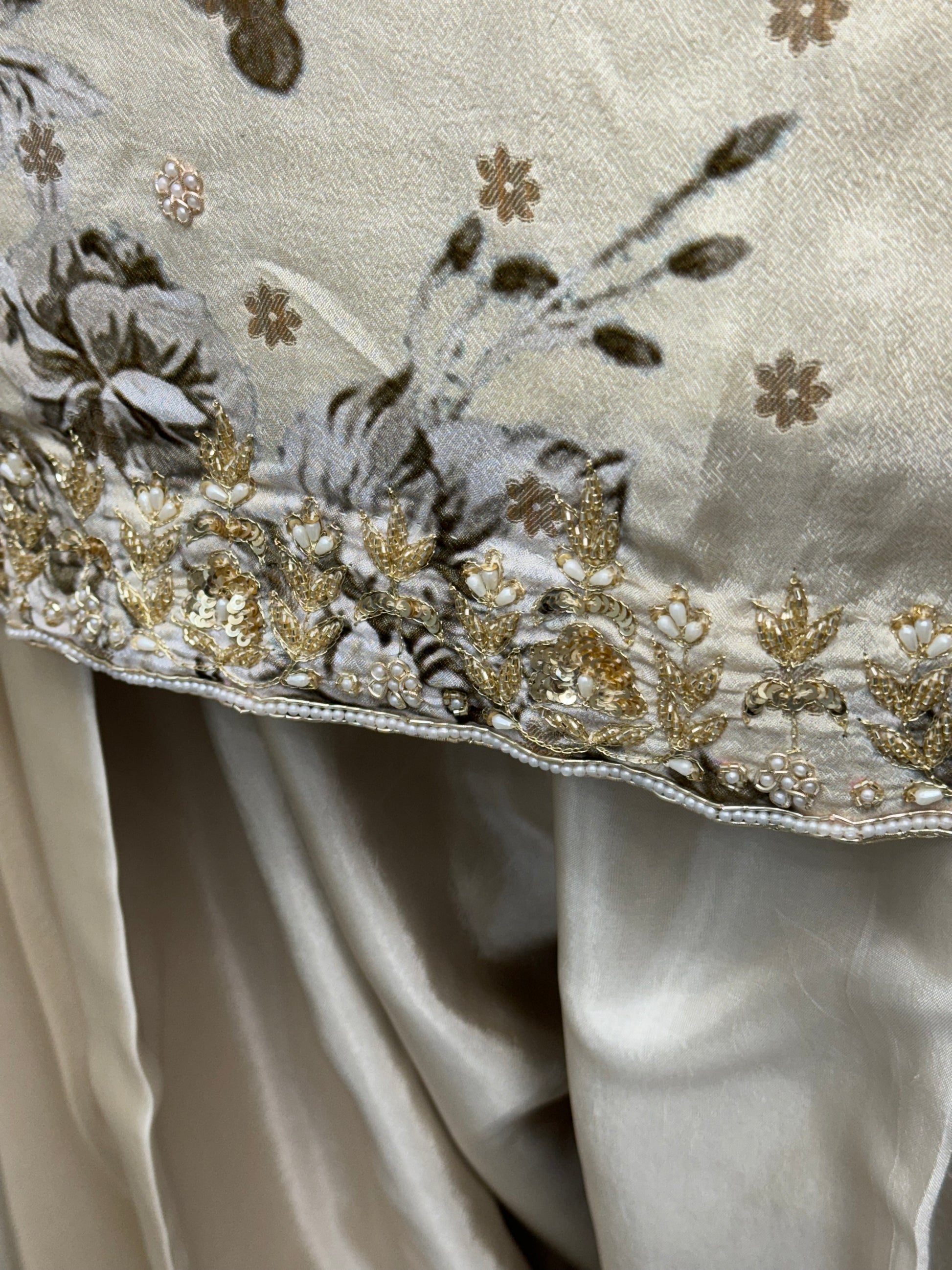 This Salwar Suit is made of high-quality Chinon fabric and features intricate handwork on a beautiful floral printed design. The delicate embroidery adds a touch of elegance to this beautiful piece. Made for semi-formal occasions, this suit is sure to make you stand out.